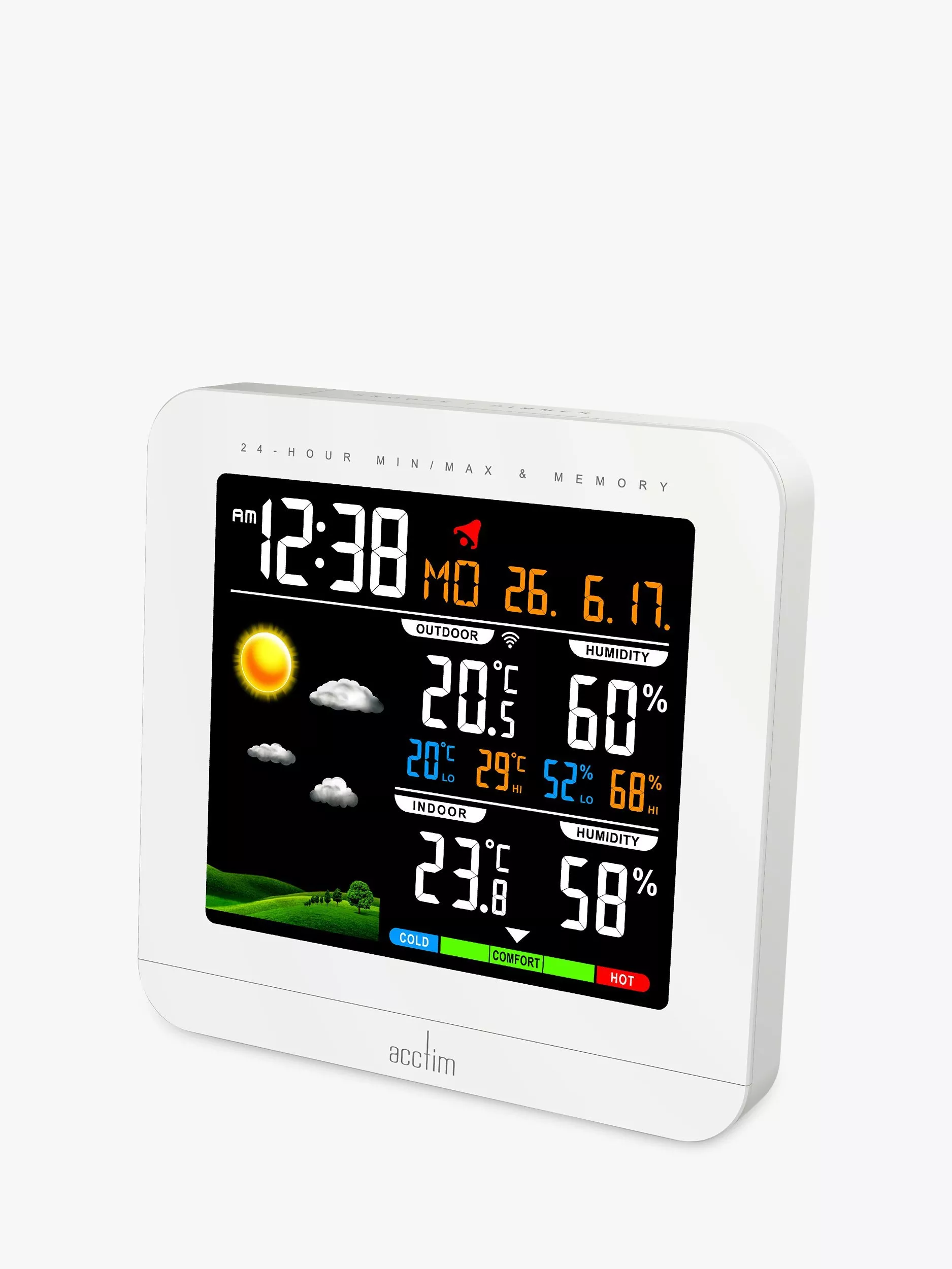 The clever and compact bedside clock has an easy-to-read, high-resolution and dimmable LCD digital display. This shows you the date, time, barometric pressure and weather forecast plus the indoor and outdoor temperature and humidity with cold, hot and comfort indicators. The wireless outdoor temperature sensor can be easily fixed to an outside wall. Showing the current and next-day weather, the Wyndham has animated cloud, sun, rain, frost and snow icons.