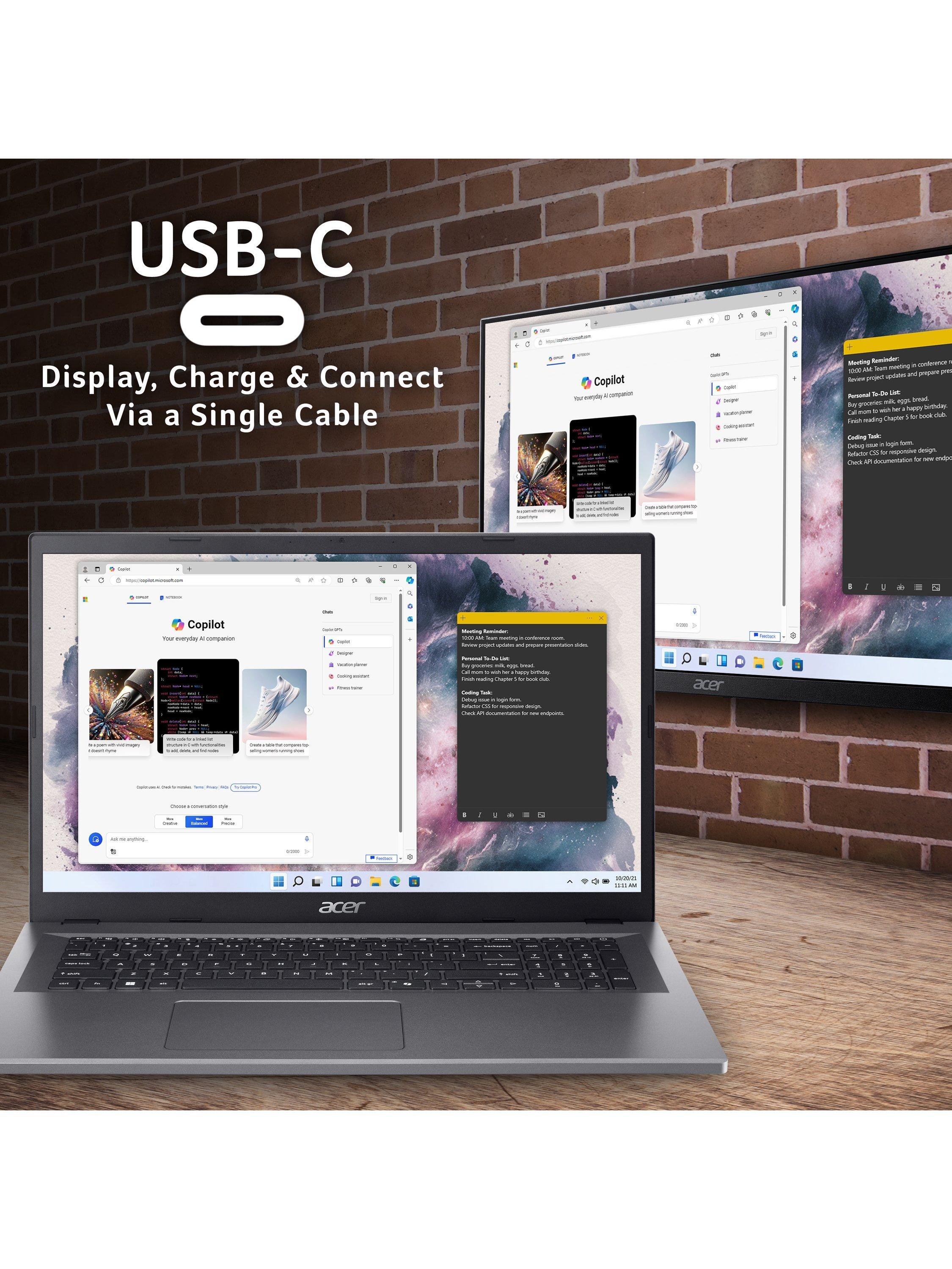 The Aspire Go 17 from Acer is a great everyday laptop. With an extra-large 17.3” Full HD display, the Aspire Go 17 offers a big-screen experience in a portable form factor. Additionally, the screen features Acer’s BlueLightShield technology which helps reduce eye strain and fatigue. With an Intel Core 3 CPU and 8GB of RAM, it can power through a wide range of tasks. Plus you get 128GB of storage for all your documents, media and files. The Aspire Go also features a battery life of up to 7 hours from a single charge. And it has the Copilot key on the keyboard, giving you instant access to Microsoft’s AI-powered assistant.