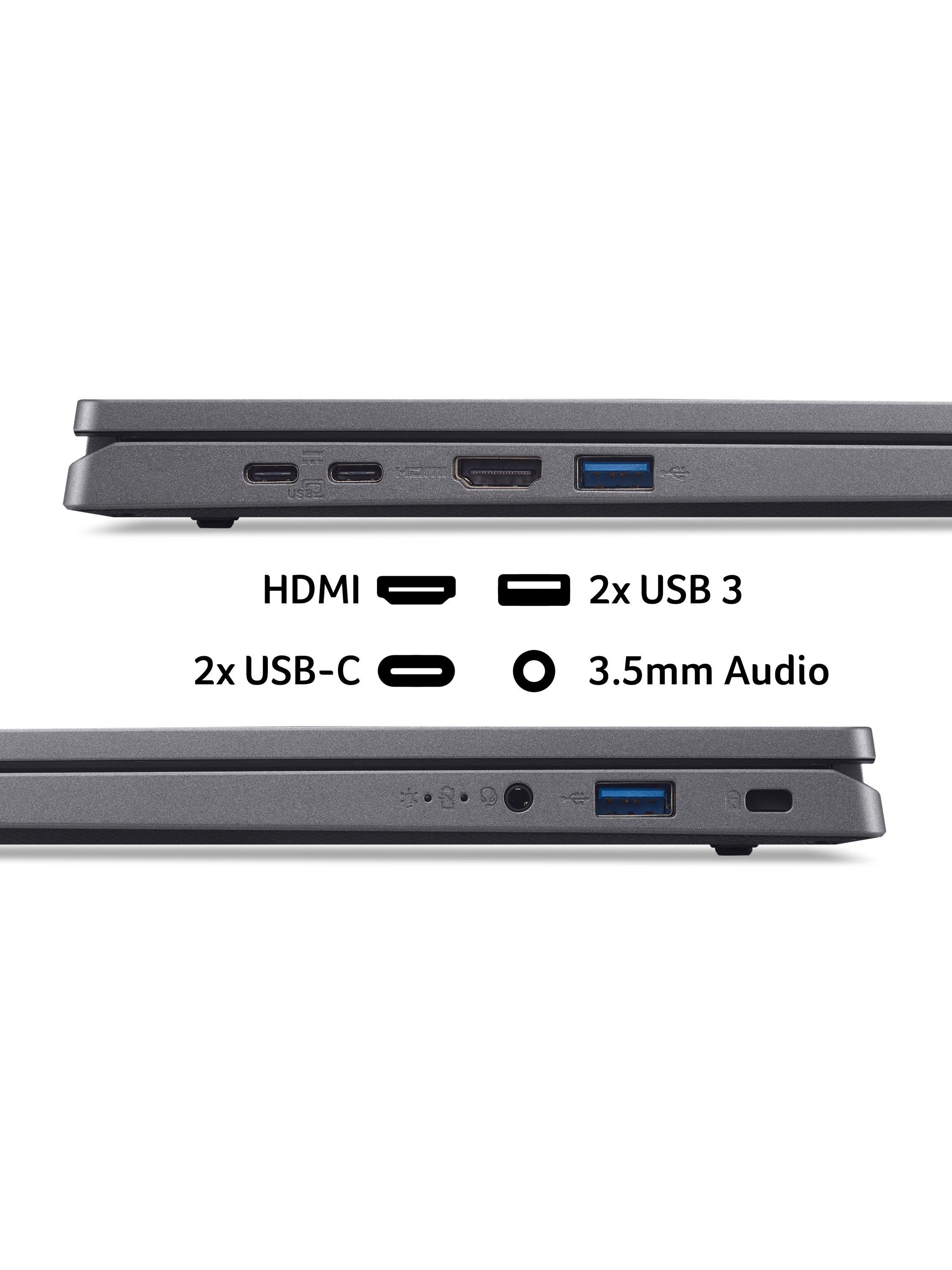 You get a complete array of connectivity options as standard with the Aspire Go. There’s integrated Wi-Fi 6 for getting online, as well as a full-function USB-C port that supports data transfer, video output and charging via a single cable, plus two more USB ports and an HDMI connection for monitors or displays.
