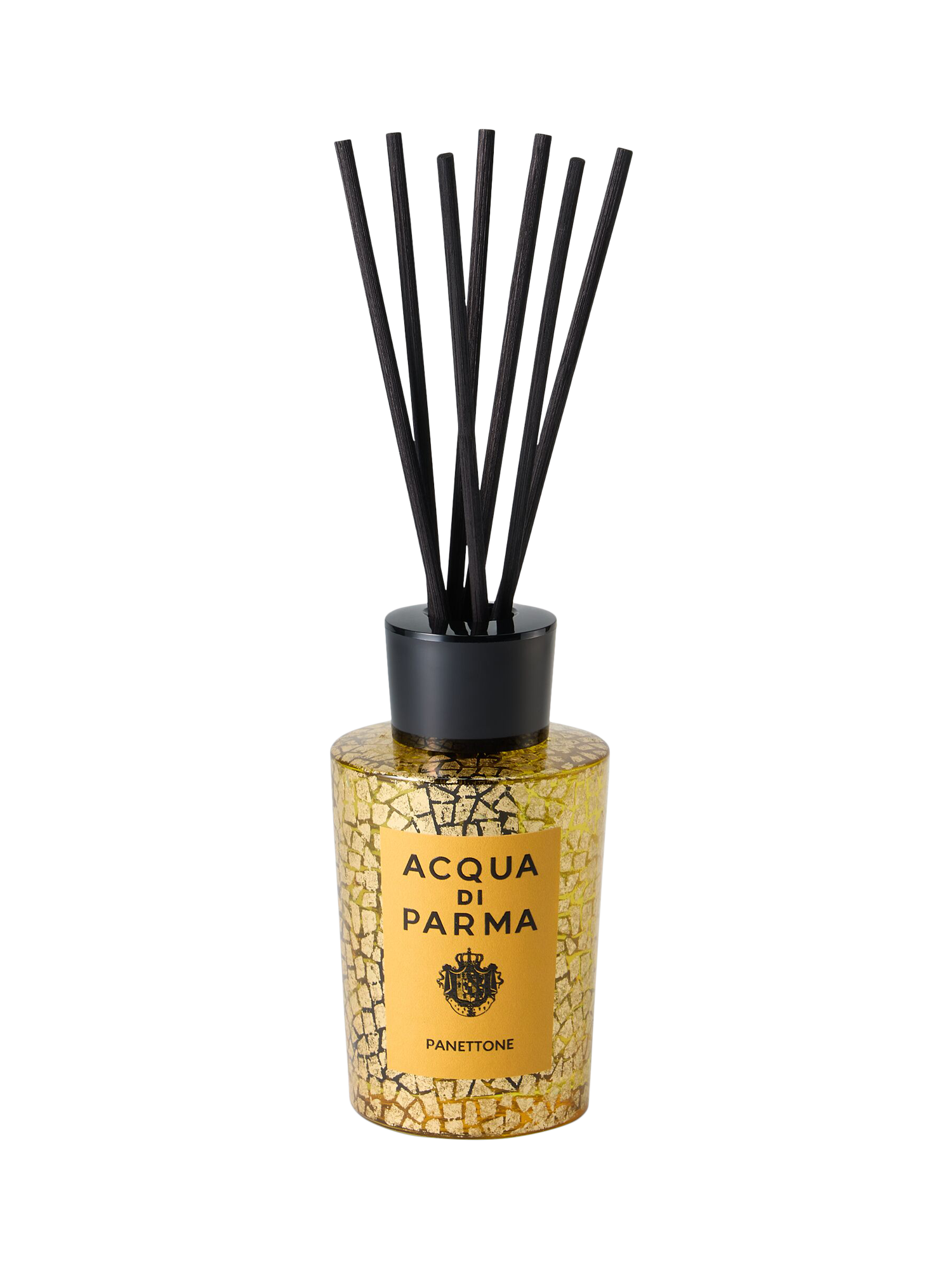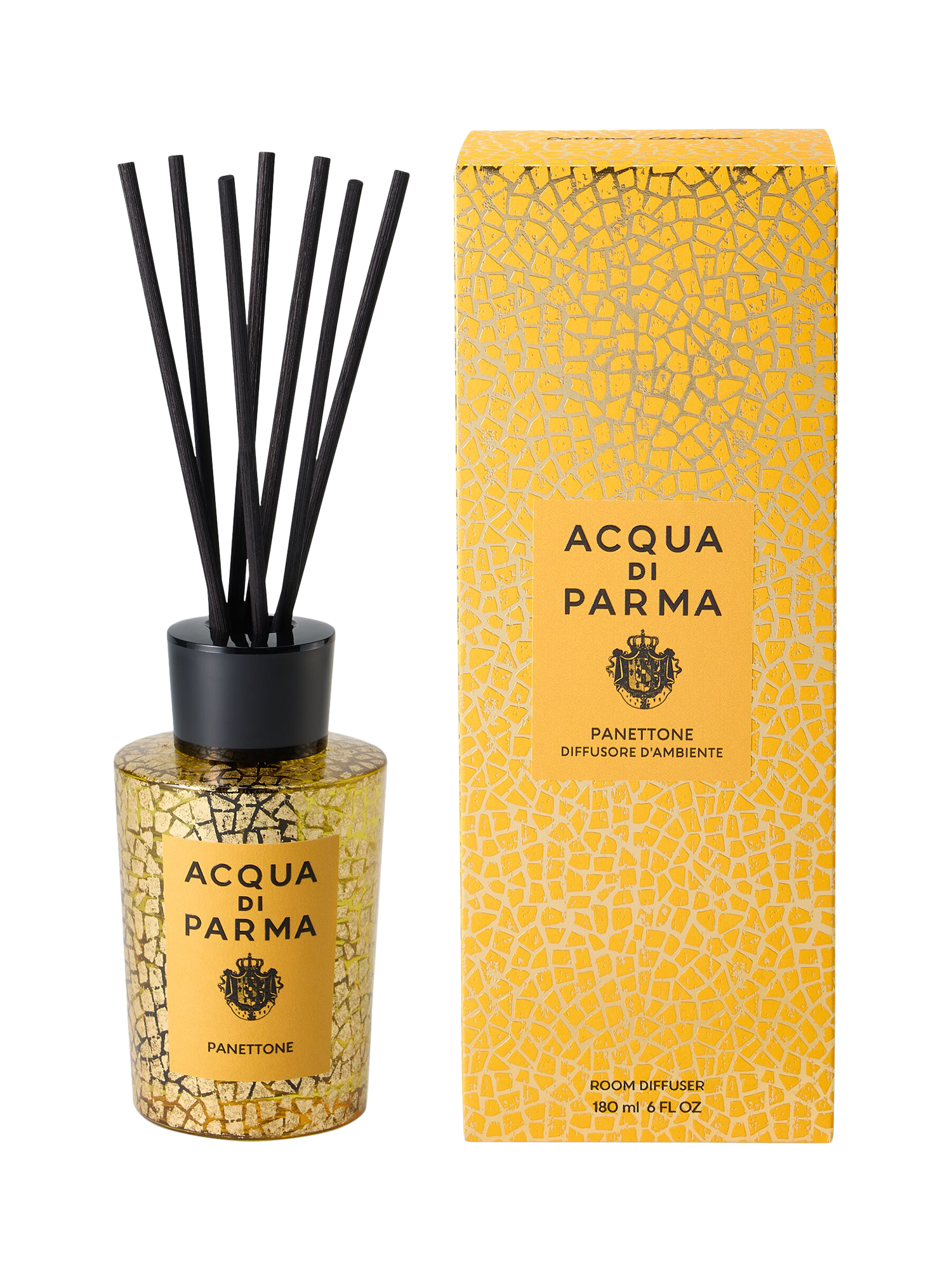 Deliciously nostalgic, the Panettone diffuser captures the unmistakable scent of Italy’s beloved holiday dessert. Sparkling top notes of orange, bergamot, and tangerine melt into a soft, sweet heart of panettone accord, resting on a smooth base of vanilla. For Holiday 2025, the diffuser is presented in a glass jar inspired by Acqua di Parma’s iconic Art Deco bottle, wrapped in Cristina Celestino’s seasonal design. The pattern reinterprets traditional Italian craftsmanship through a bold, tactile texture finished in craquelé gold—a nod to decorative codes from the Dolomites and the festive glow of alpine living.