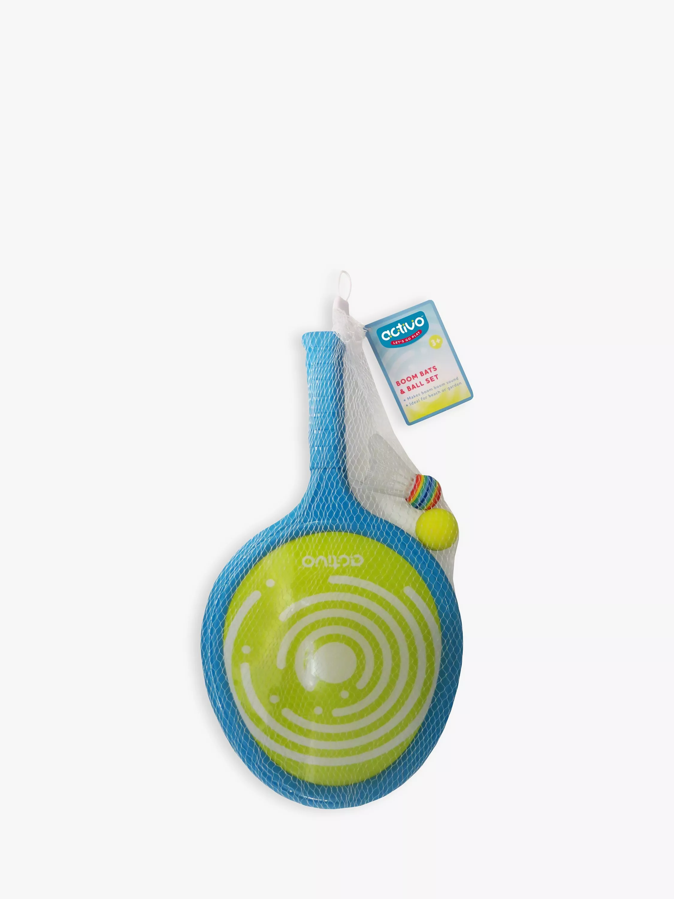 Ideal for the beach or garden, this Let's Go Play set from Activo includes a ball and two bats that make a 'boom boom' sound. A soft ball and a shuttlecock are included for different playing options. Suitable for any family members over the age of 3 years.