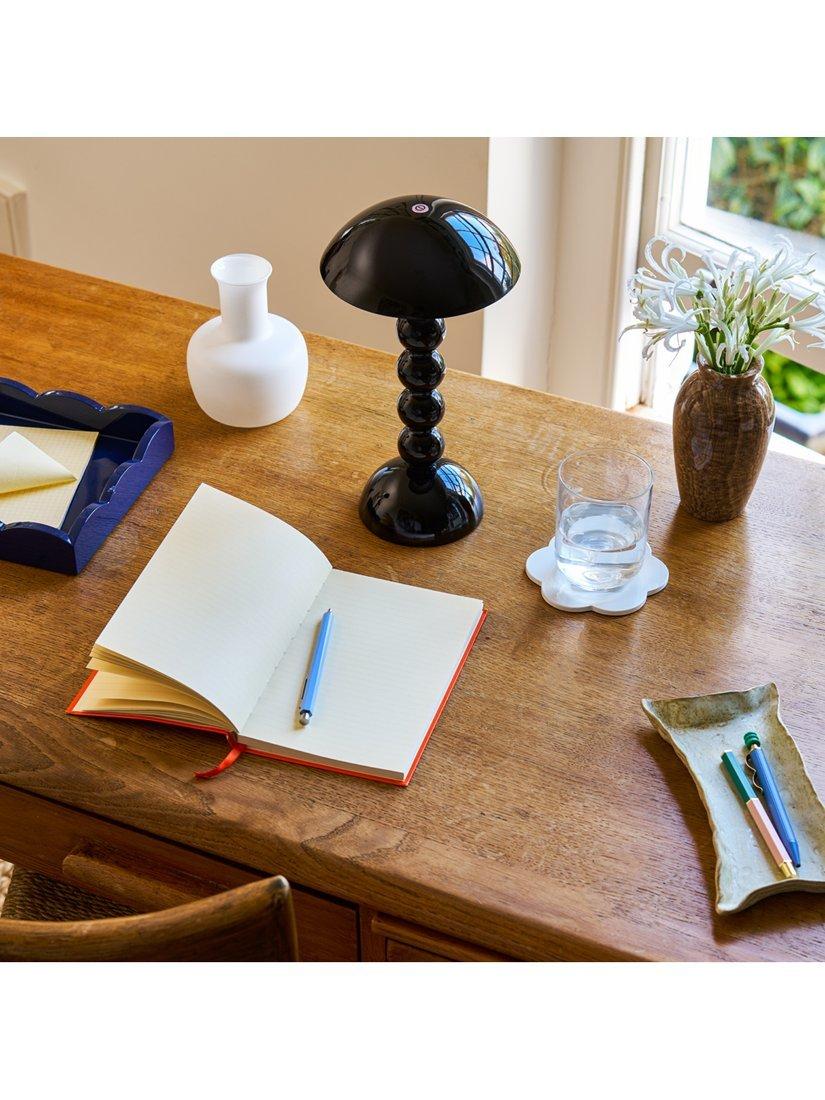 Finished with 10 coats of lacquer for a glossy, luxurious look, it comes gift-boxed and includes a USB-C charging cable for easy recharging in the port on the base of the lamp. Charging time is approximately eight hours. Disconnect when fully charged. The LED indicator shows the charging status.