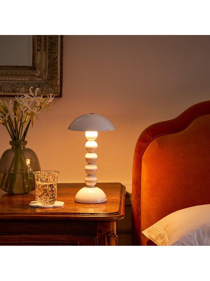 Part of Addison Ross's bobbin-shaped collection, this table lamp is a cordless design, offering up to 10 hours of battery life on its brightest setting and has three adjustable light levels. Tap the button on the top to activate the LED Lamp. The unique and versatile lamp can be used as a portable or stationary lighting feature.