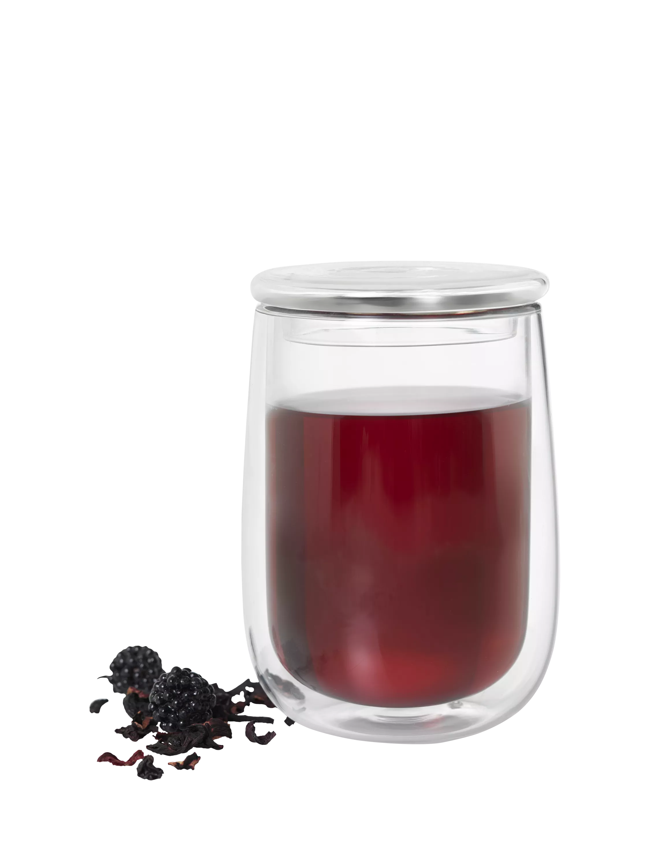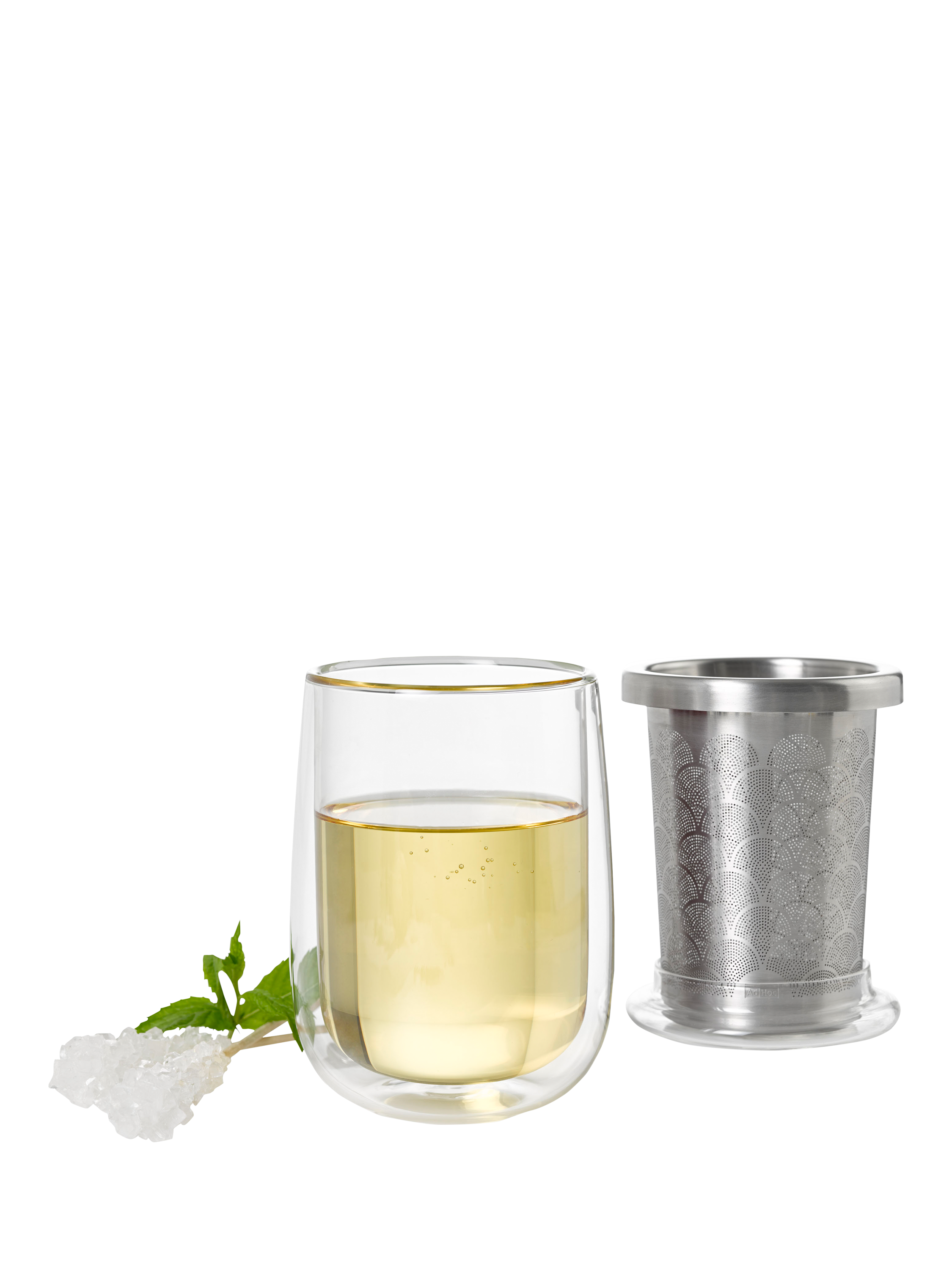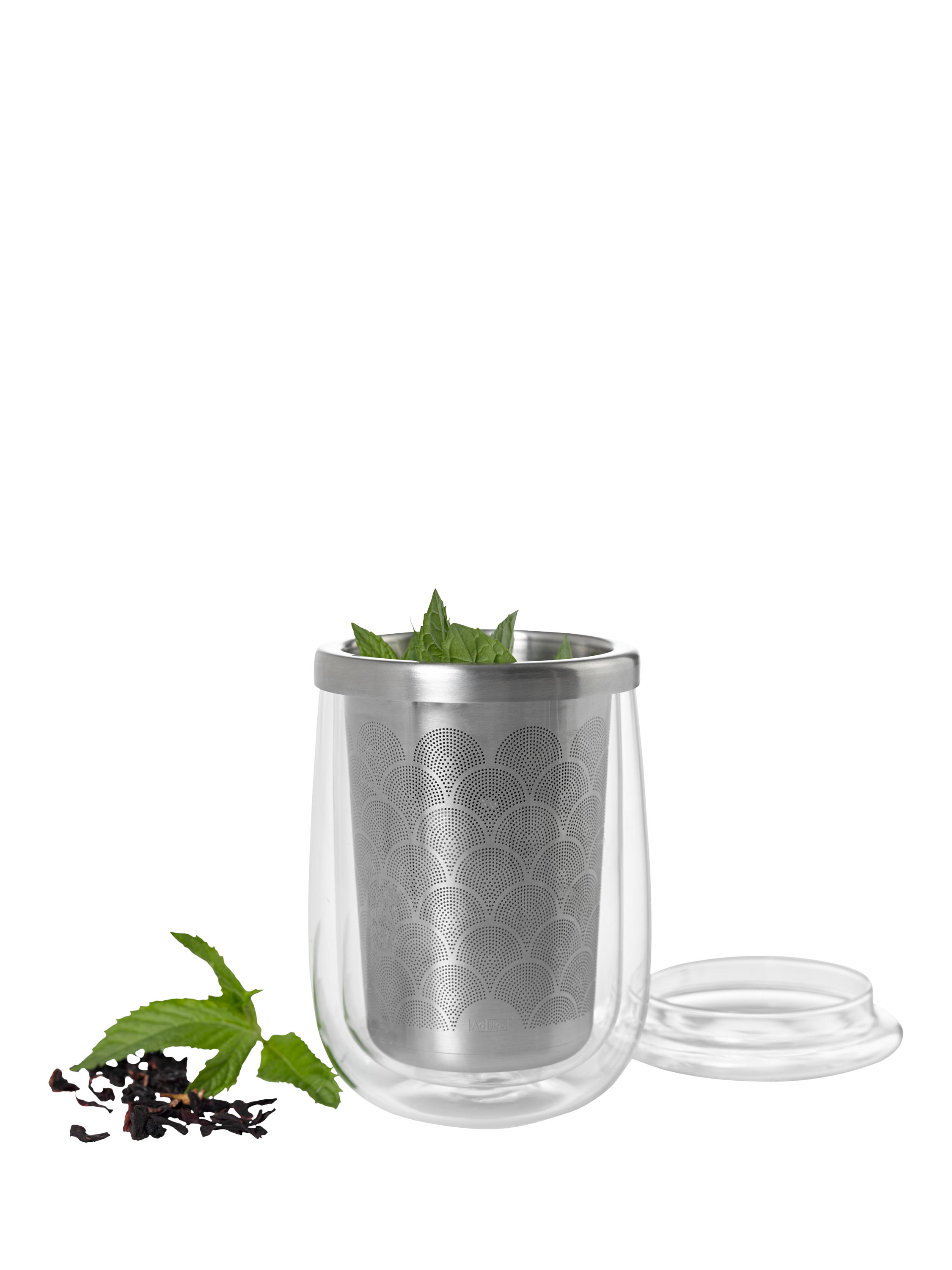 Tea infuser cup made of double-walled, heat-resistant borosilicate glass that doesn't affect taste and is comfortable to hold. Suitable for all types of tea and for fine teas like rooibos. The fine mesh infuser prevents particles from getting into the liquid and creates the optimum aroma development of even large-leaf teas.