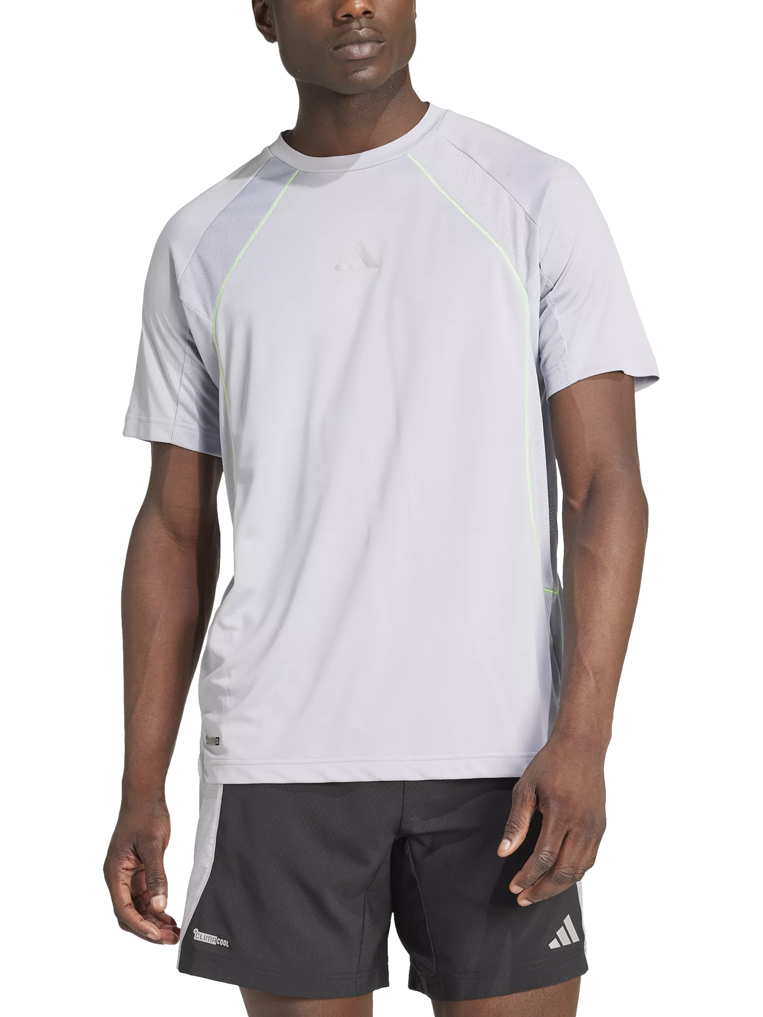 Hit your next training session in this adidas workout tee. The design mixes lightweight poplin and airy mesh, with glossy details for added style points.