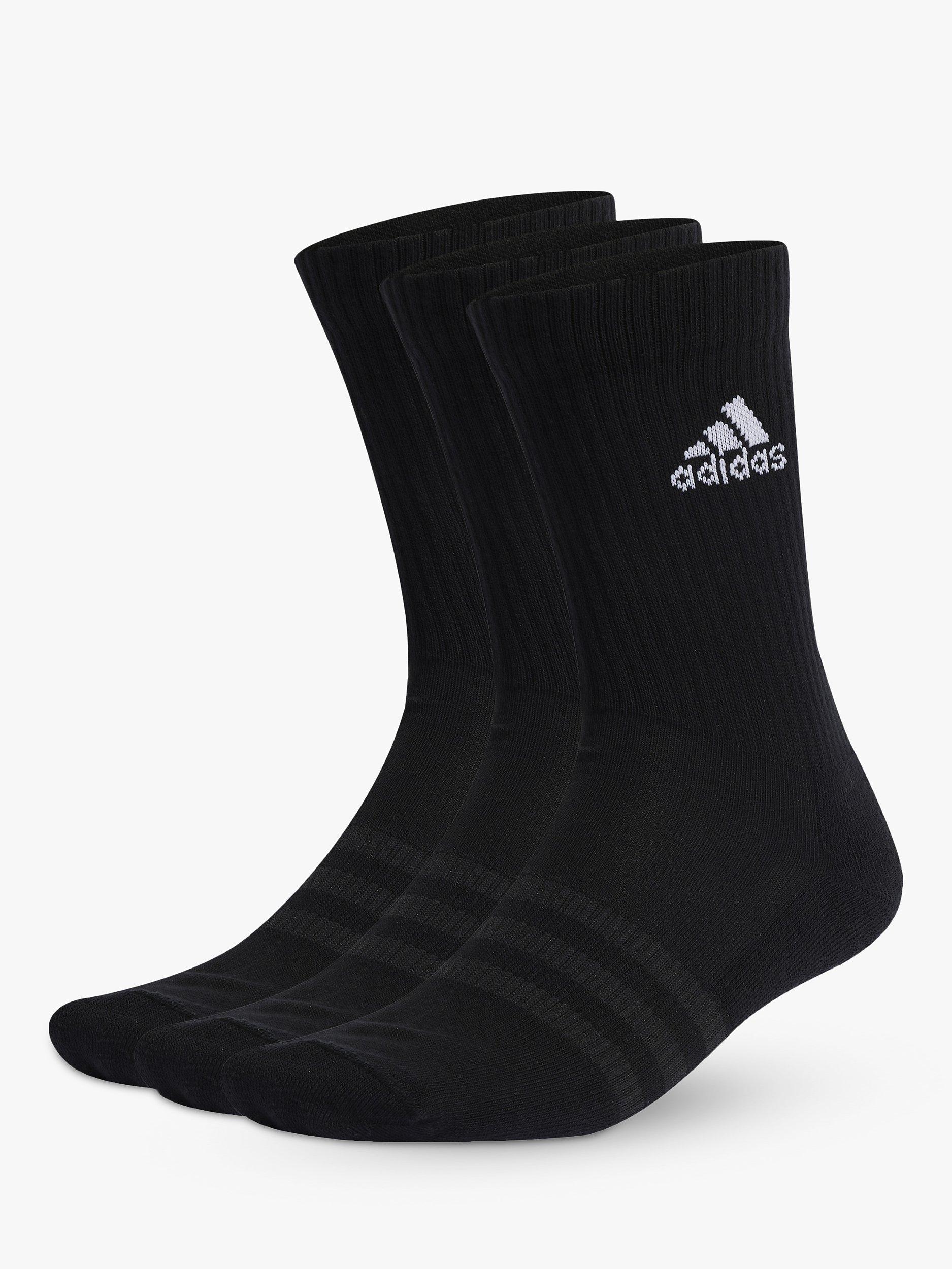 A strong athletic look meets foot-pampering softness. This trio of cotton-rich crew socks offers heel-to-toe cushioning for all-day comfort. Knit-in arch support and a smooth toe seam add to the snug fit and feel. The iconic 3-Stripes deliver instant adidas style.