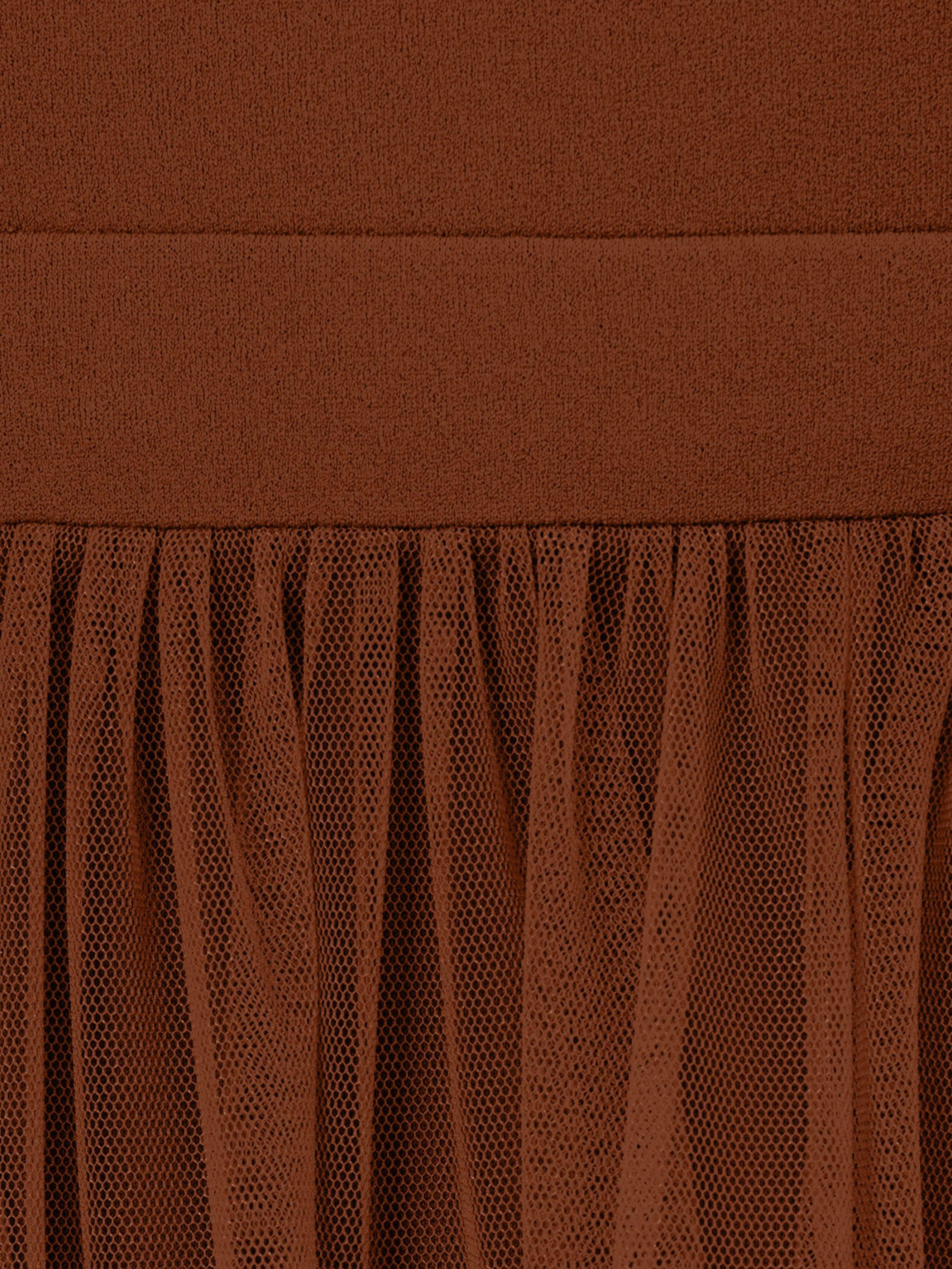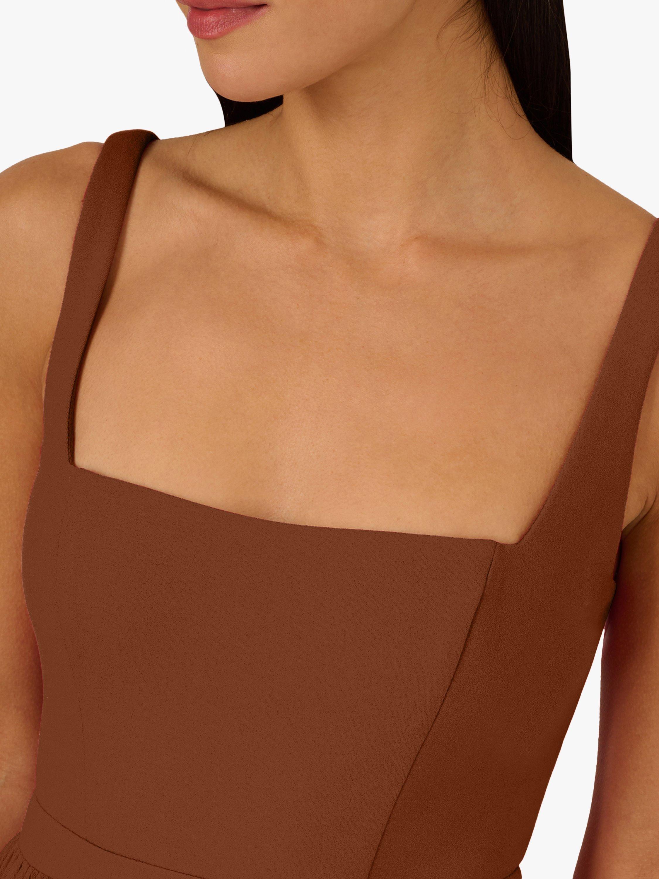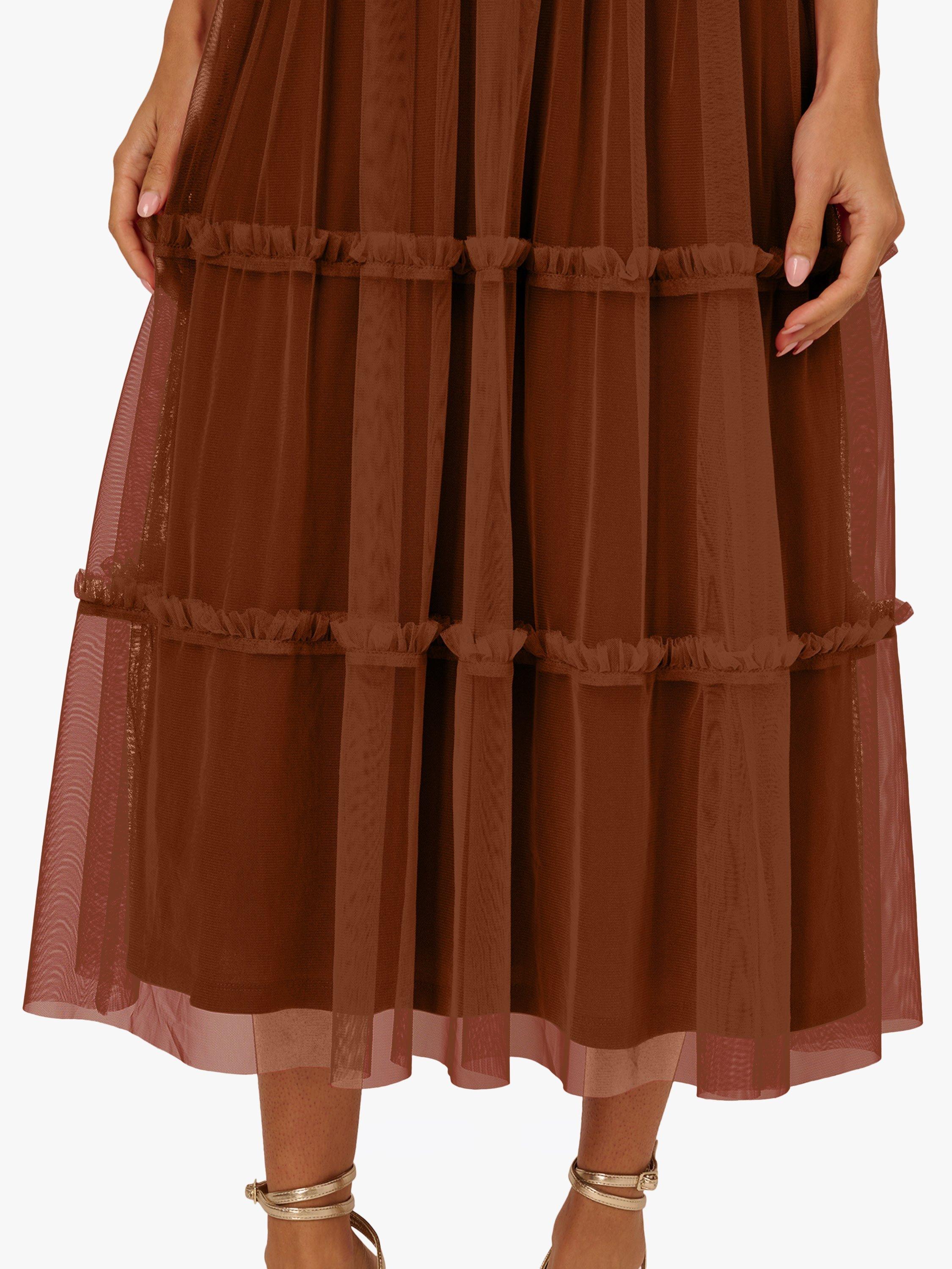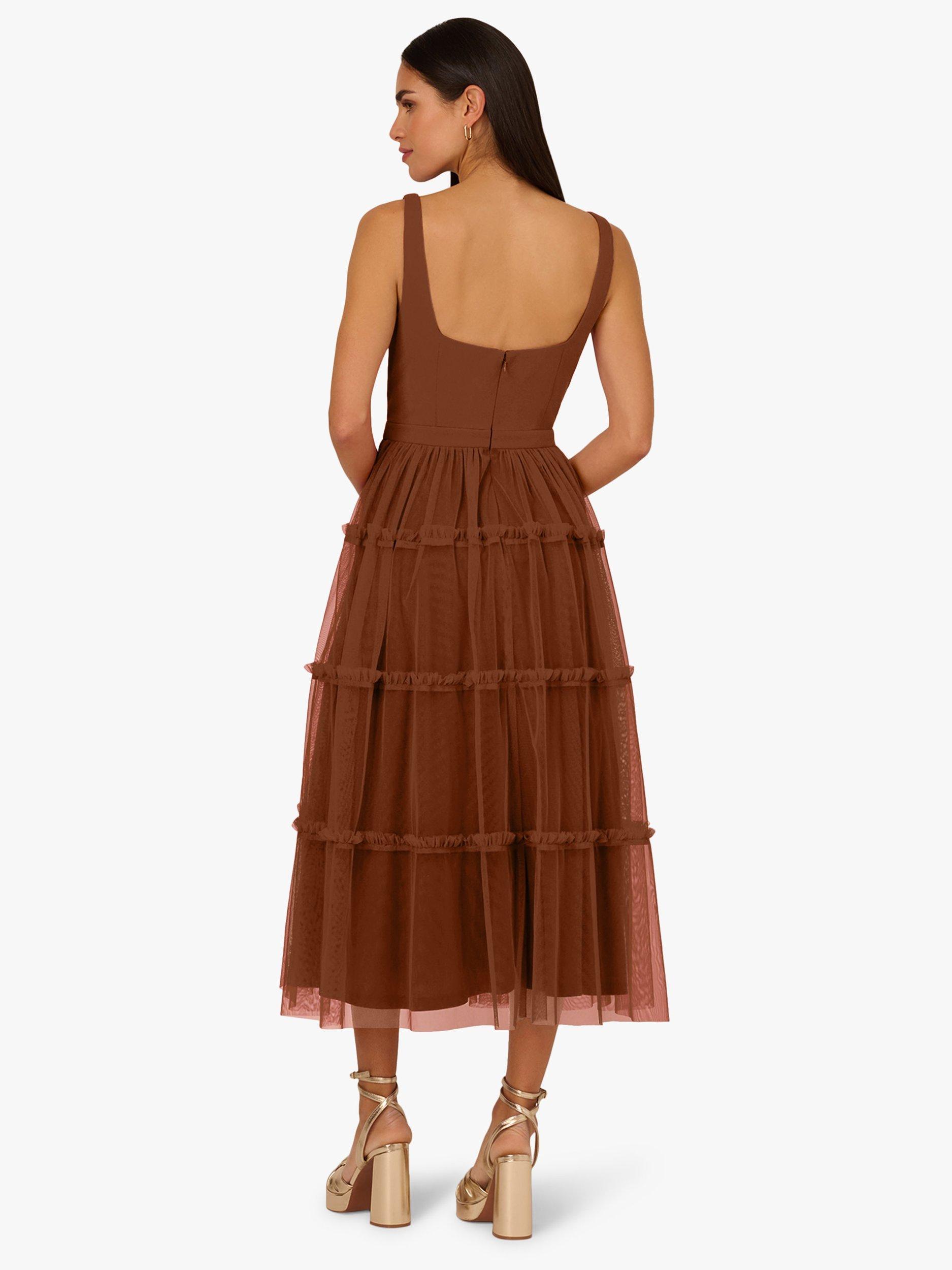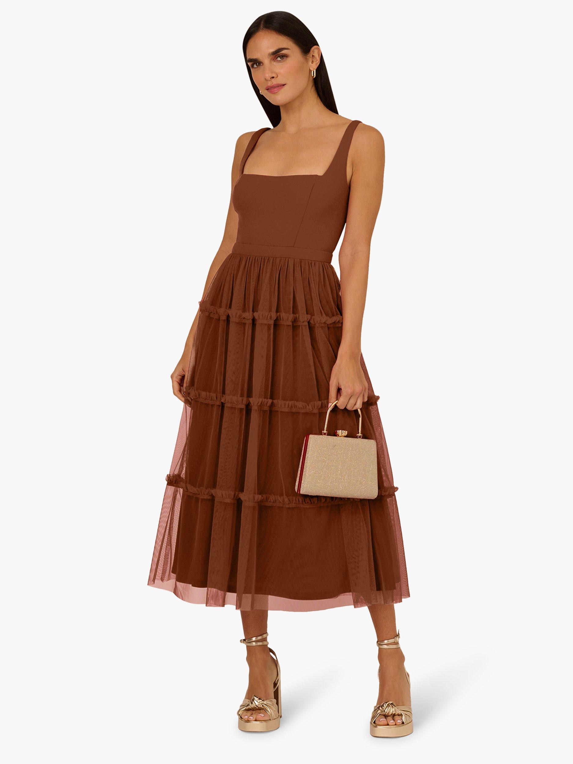 Modern fabric mixes make this classic fit and flare dress a sweet look. This midi dress features a fitted bodice with tank straps, a square neckline, and a tiered skirt. Fully lined, the bodice is crafted from a knit fabrication while the skirt is overlaid in mesh for added sweep. Pockets and a square back with centre zip closure complete this delightful party dress. Styled with nude heels and sparkling accessories, this midi dress is a timeless look from wedding guest duty to cocktail parties