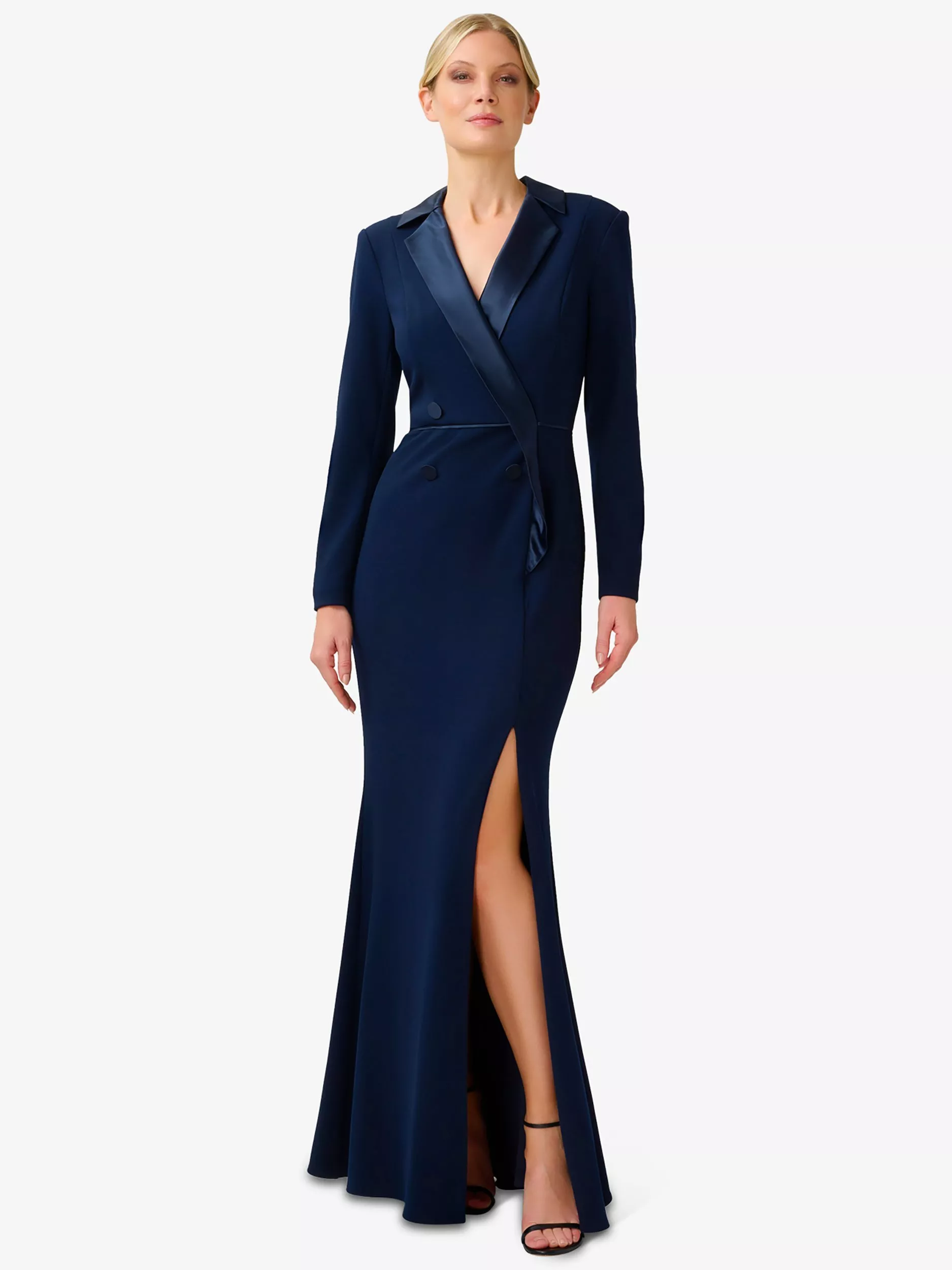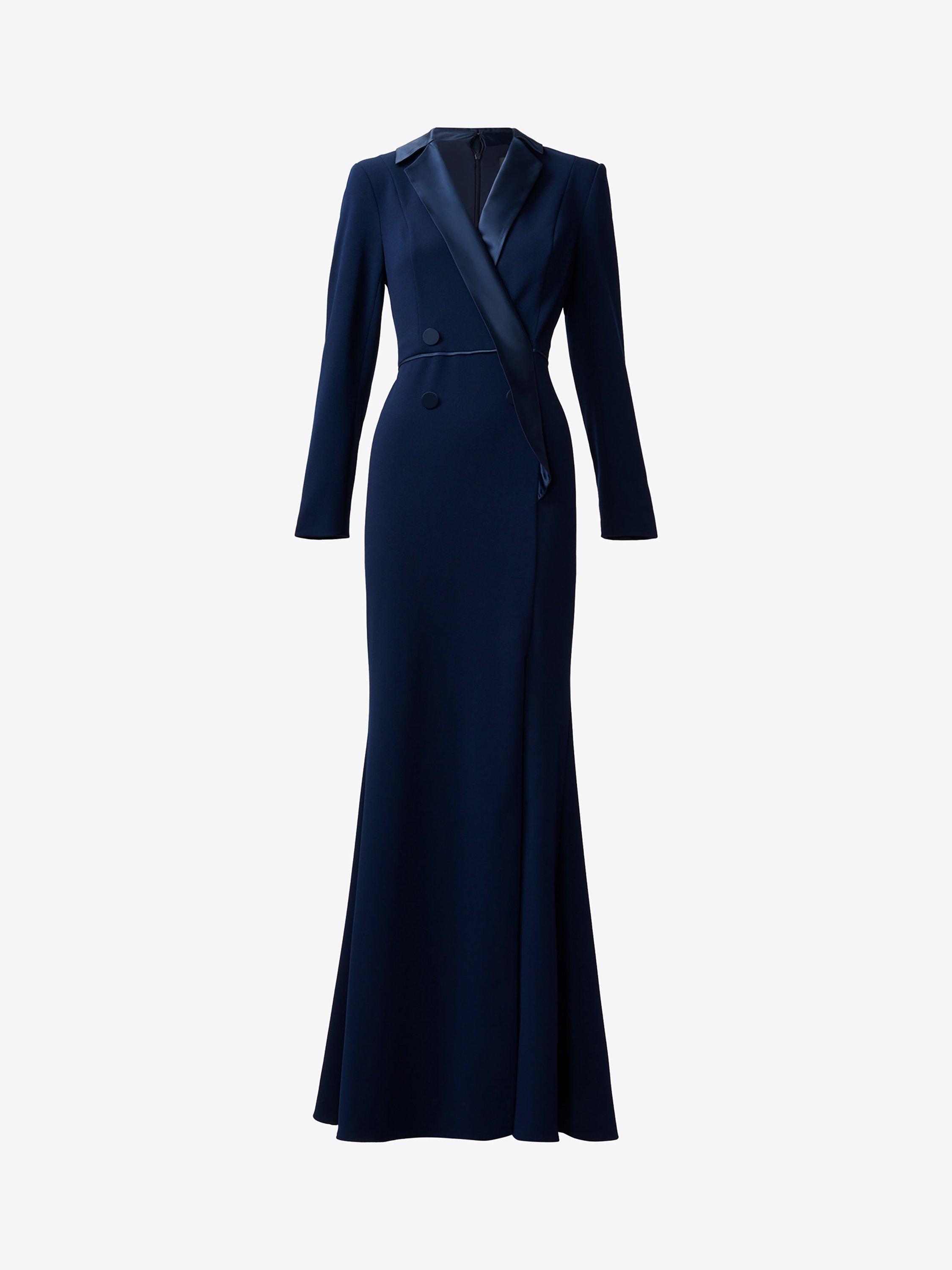 Framed with a satin collar and long sleeves, it pairs up with heels for your evening out.