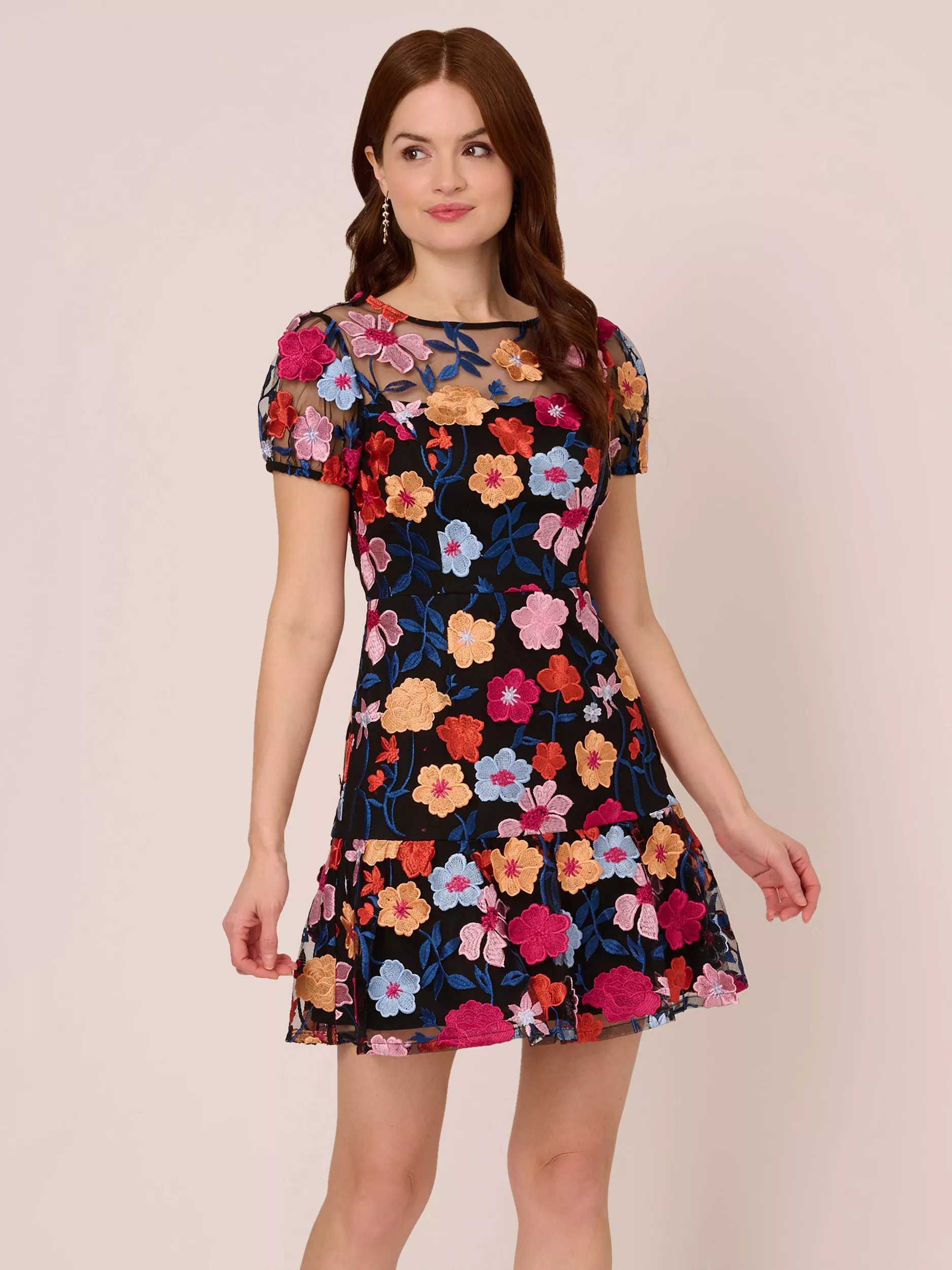 Embroidered details lend their charms to this flounce dress. This cocktail dress features a fitted bodice with boat neckline, sheer short sleeves and yoke, and a flared skirt with flounce hem. Constructed from partially lined knit mesh embroidered with florals, this short sleeve dress is a playful design. A hidden zipper closure at the sheer centre v-back completes this fit and flare dress. A beautiful look for day or night, this floral dress is endlessly stylish.