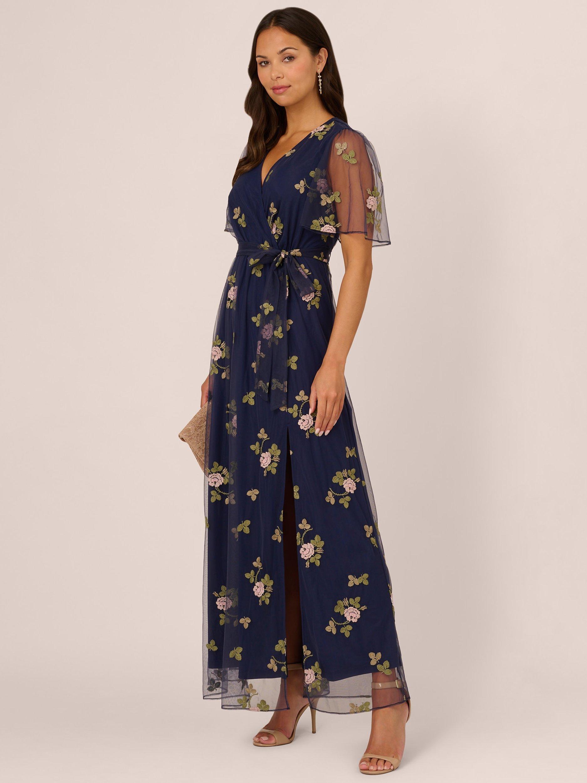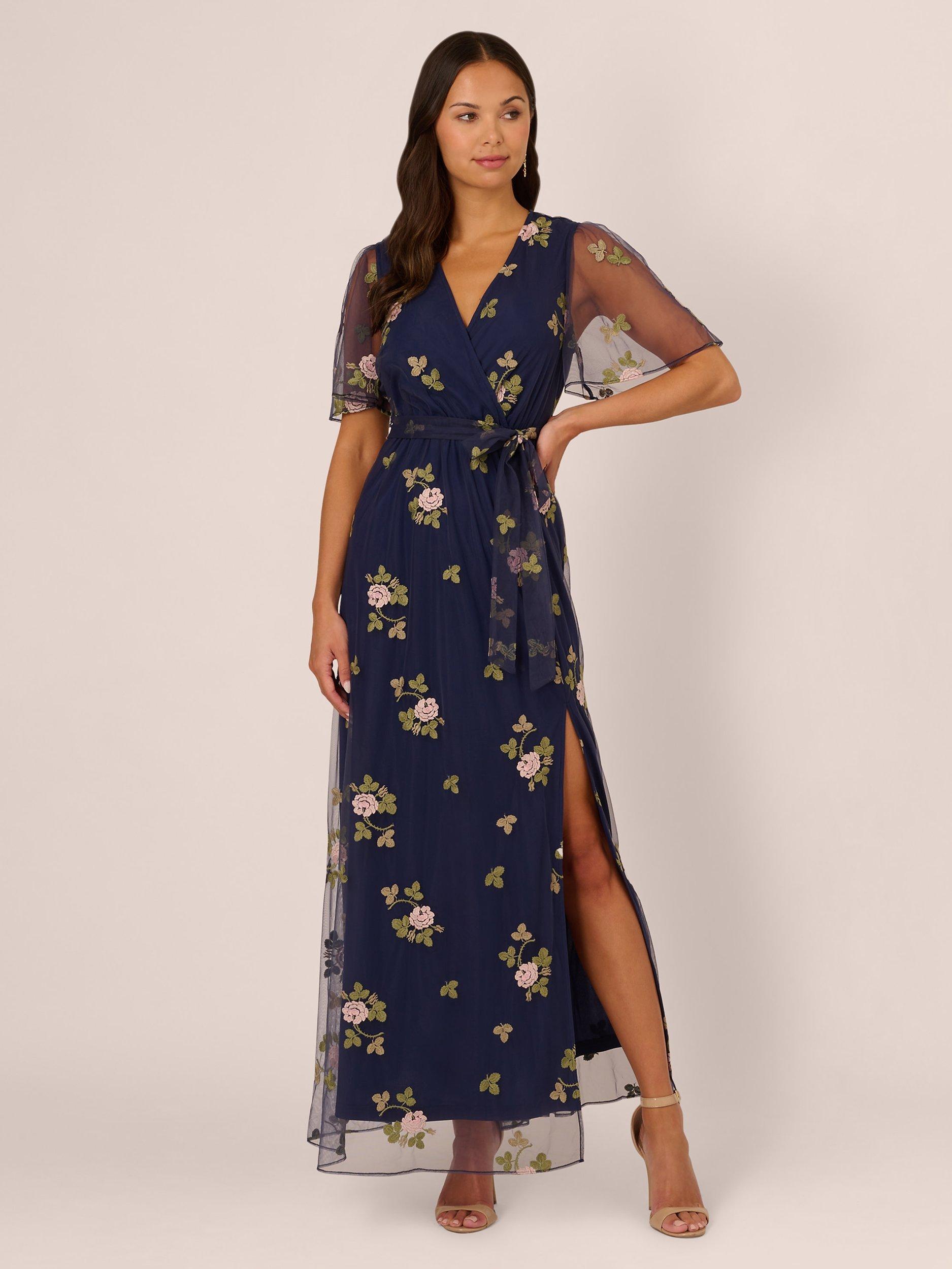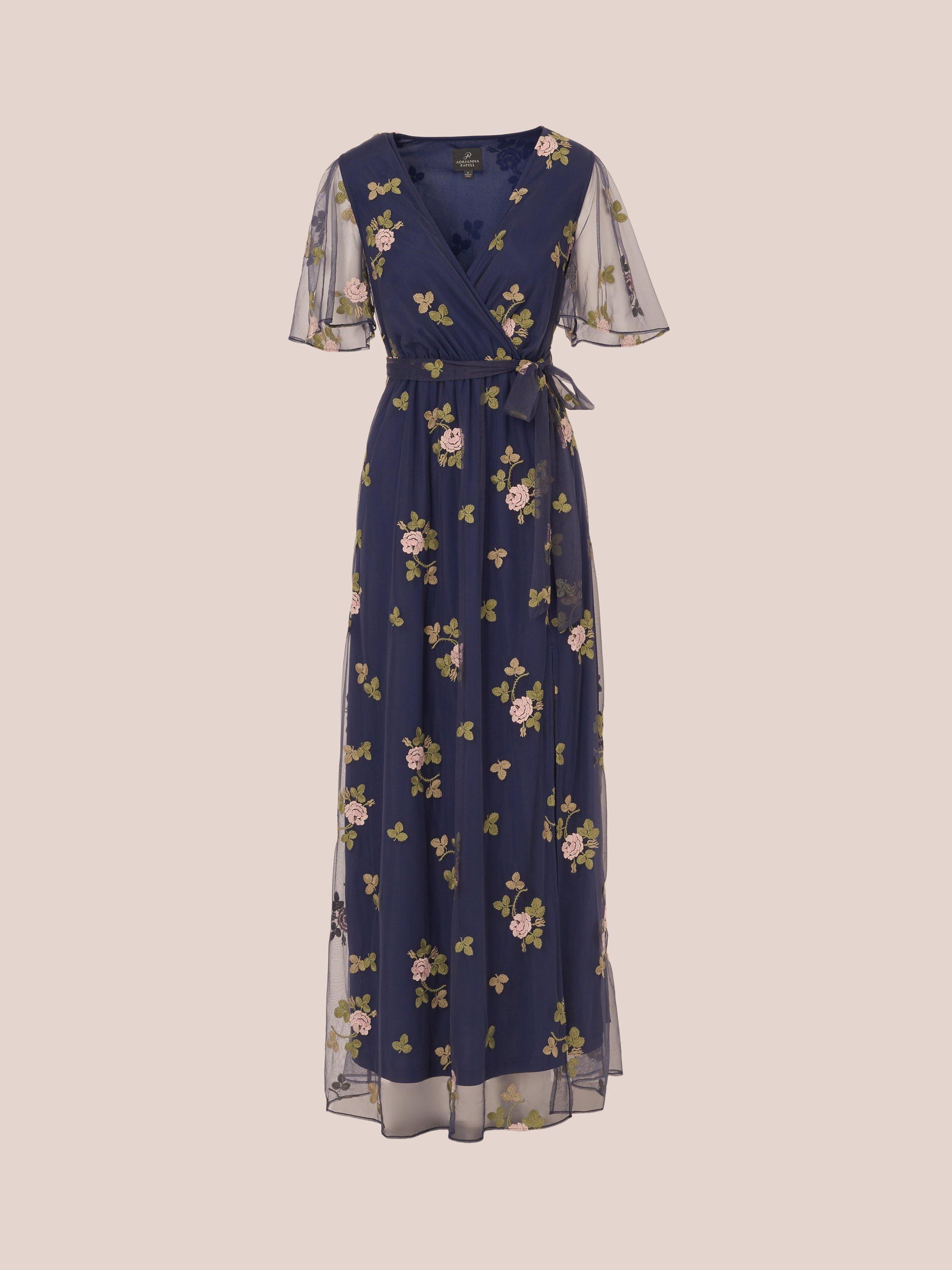 As versatile as your plans, this floral dress is an incredible style. This dress features a faux wrap bodice, sheer flutter sleeves, a self-tie waist, and a soft maxi skirt. Fully lined through the body, this maxi dress has a mesh overlay that is embroidered with sweet floral details. A slit completes the ankle-length skirt of this pull-on dress. Teamed with heels for a dressy occasion or sandals for a day out, this maxi dress will brighten your day.