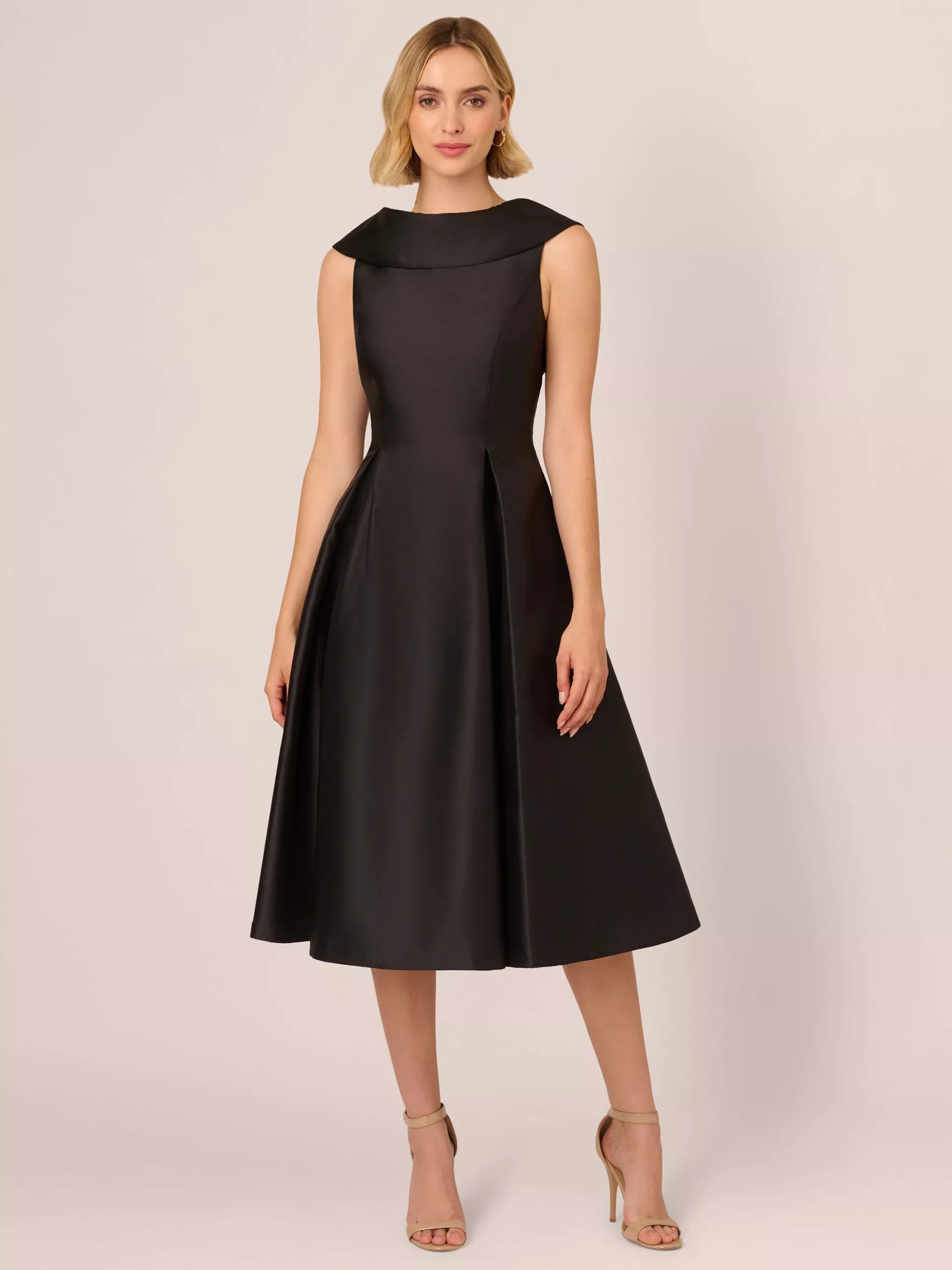 This pretty midi dress is a polished look with tailored details and back zipper creating a nipped waist and a full skirt. The high fold over collar drapes over the shoulders and highlights the V-back. Pockets tucked into the side of the full pleated skirt make this elegant fit and flare dress surprisingly practical.