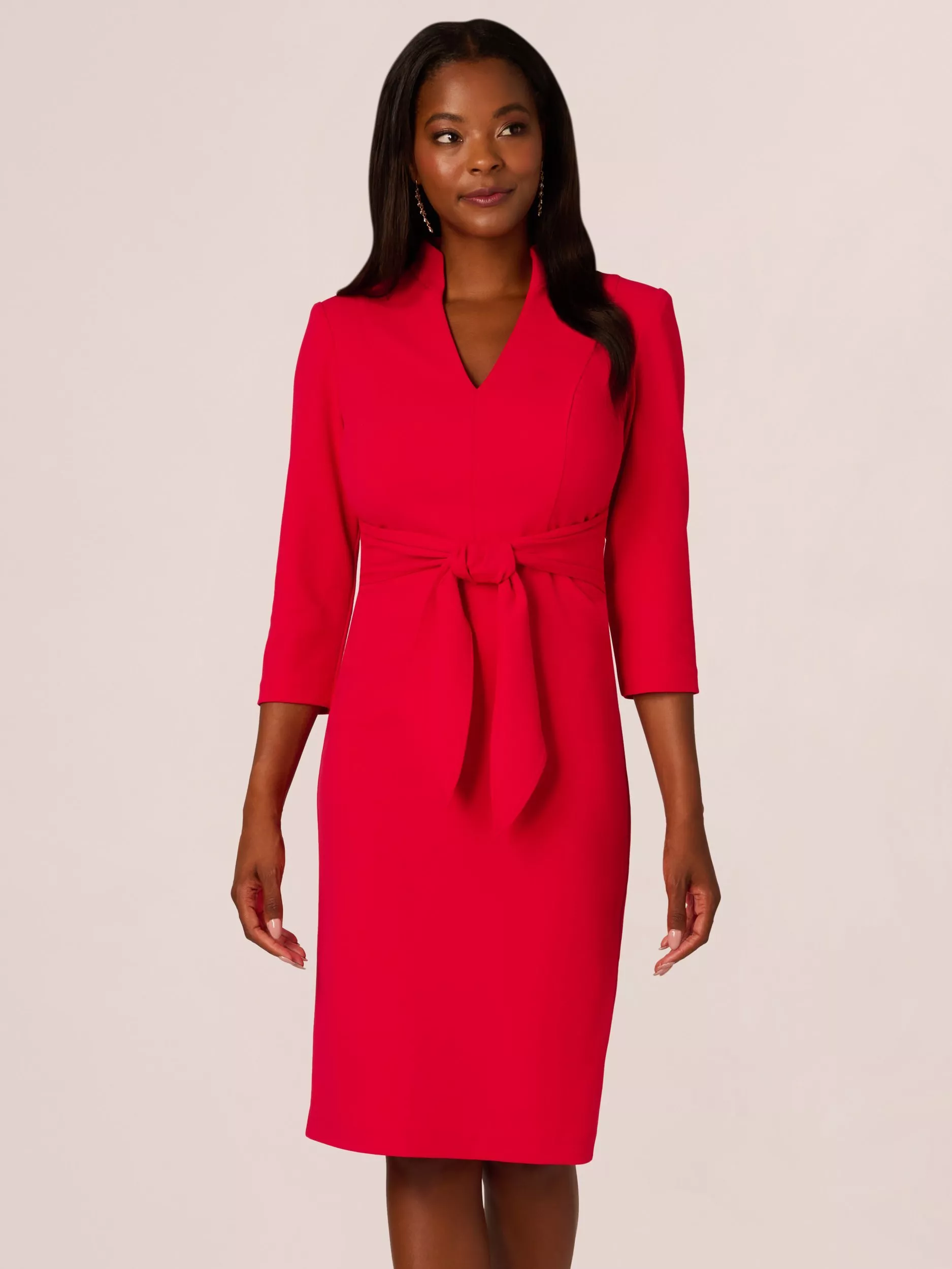 A testament to refined style, sheath dress is a tailored look. Crafted from luxurious knit crepe fabric, this dress features a flattering V neckline with a chic stand collar. The three-quarter sleeves and self-tie detail at the front add a touch of versatility and charm, while princess seams ensure a flattering fit. Complete with a back slit and discreet zipper at the centre back, it offers both style and comfort for any occasion. Embrace timeless elegance with this essential piece that effortlessly transitions from day to evening with grace.