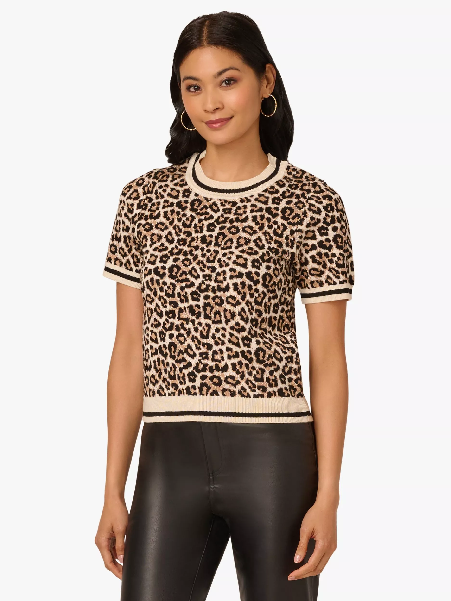Add a graphic touch to your everyday look with this short sleeve sweater knit top, featuring a leopard print knit pattern. Designed with a classic crew neckline and an easy pullover construction, it's finished with sporty contrast stripe accents at the cuffs, collar, and hem. Whether styled for the office or a casual weekend, this piece balances comfort and structure effortlessly.