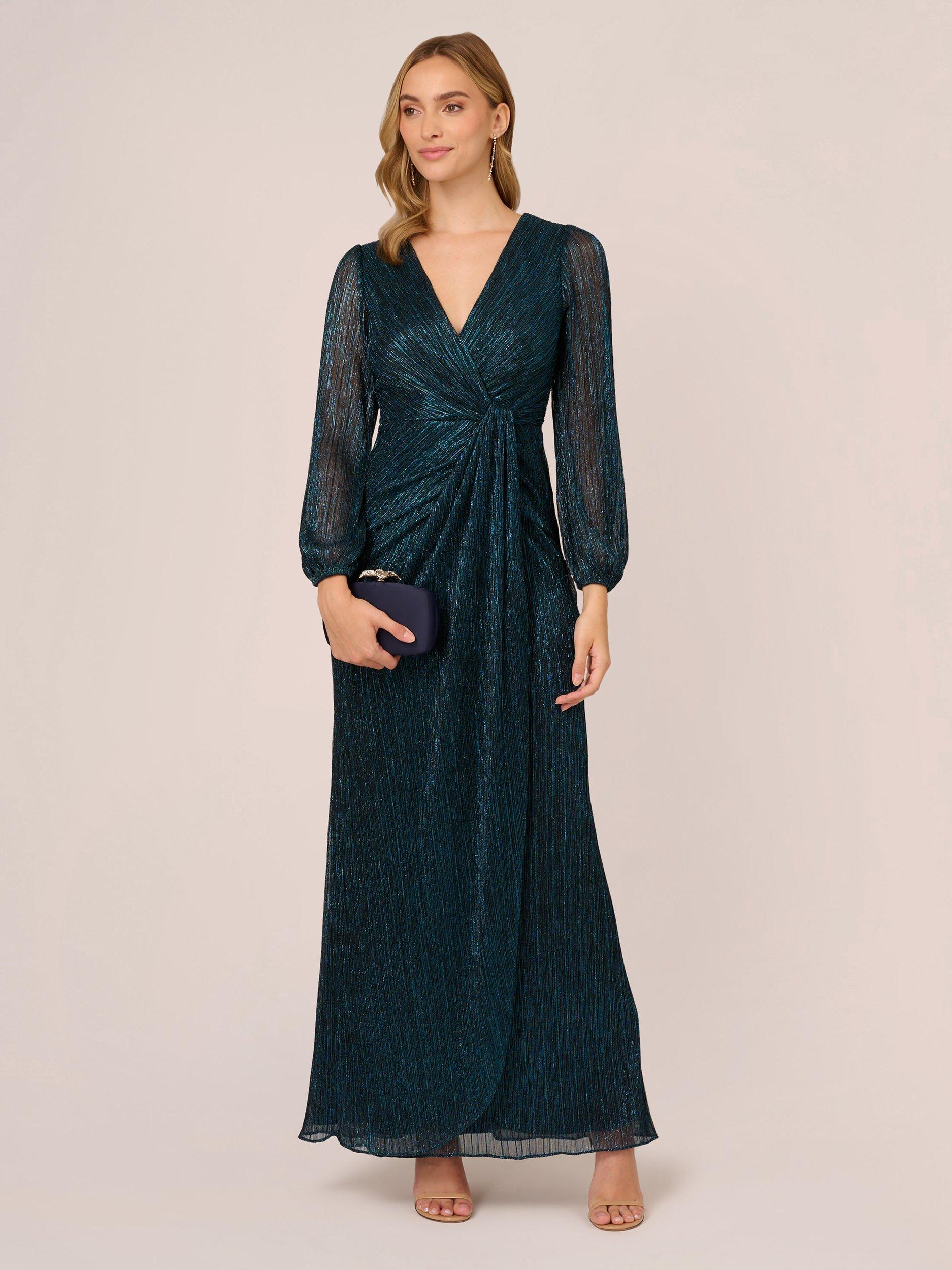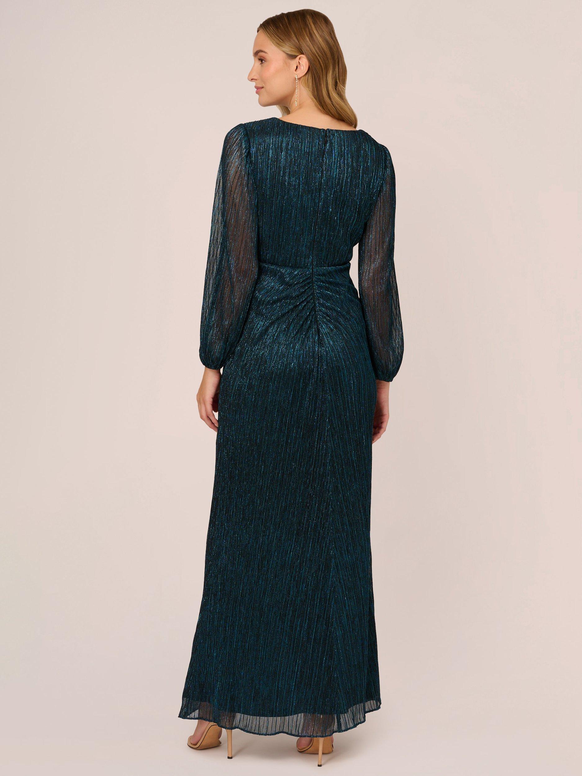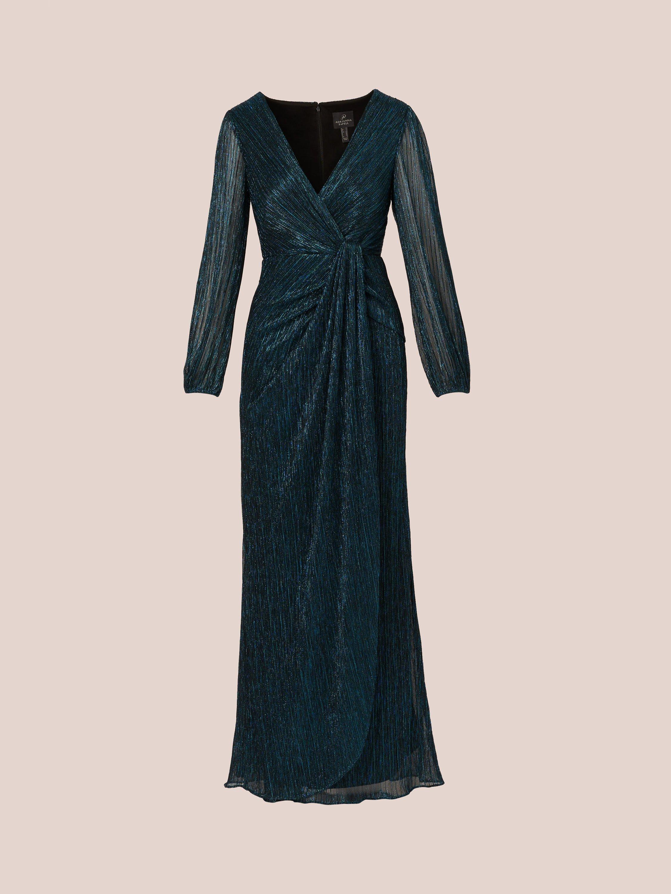 Entirely flattering with its A-line shape, this floor-length dress from Adrianna Papell boasts a draped detail to the front for added appeal. With a universally flattering v-neckline and long sleeves, it is transformed with light-catching metallics.
