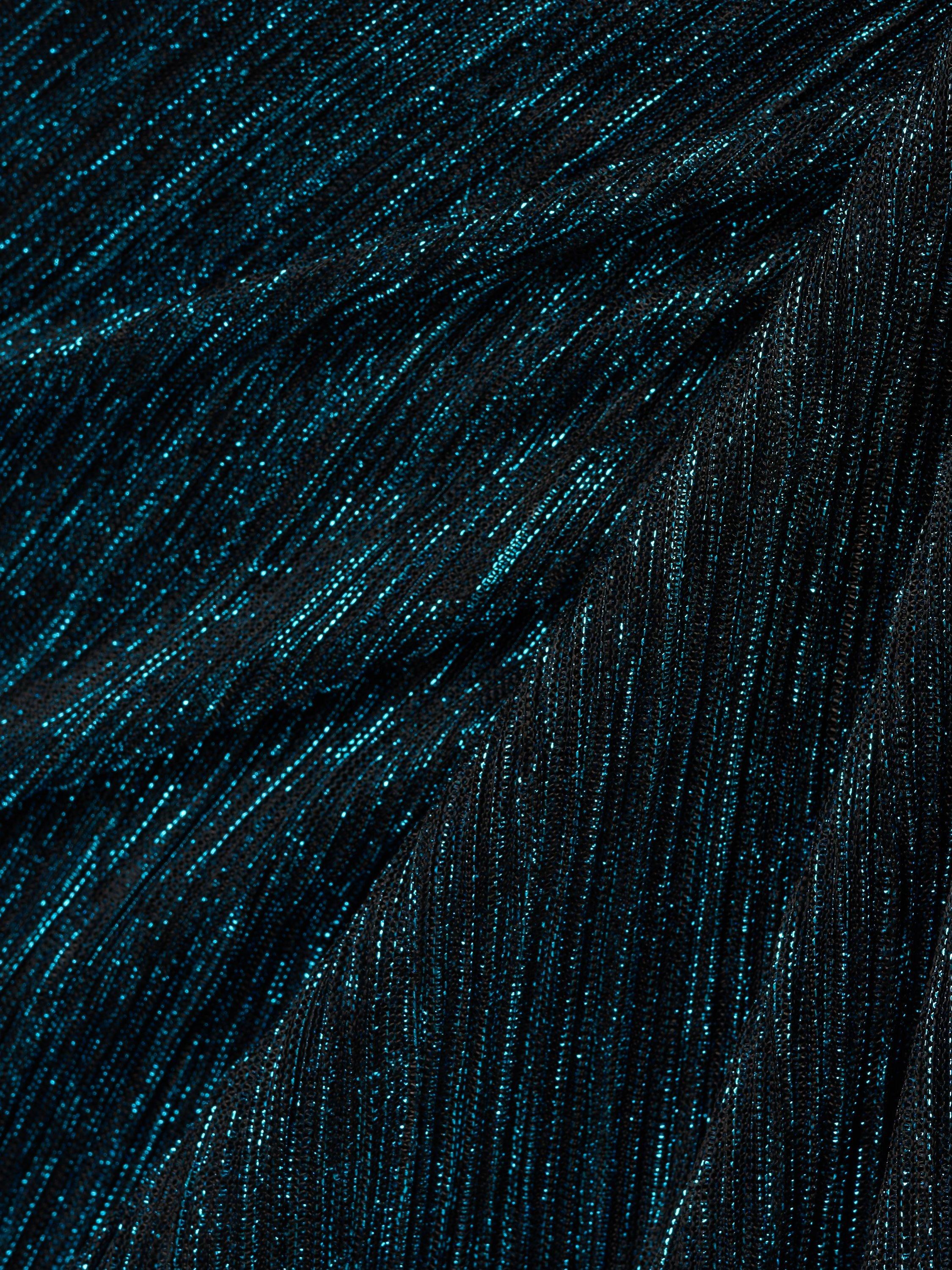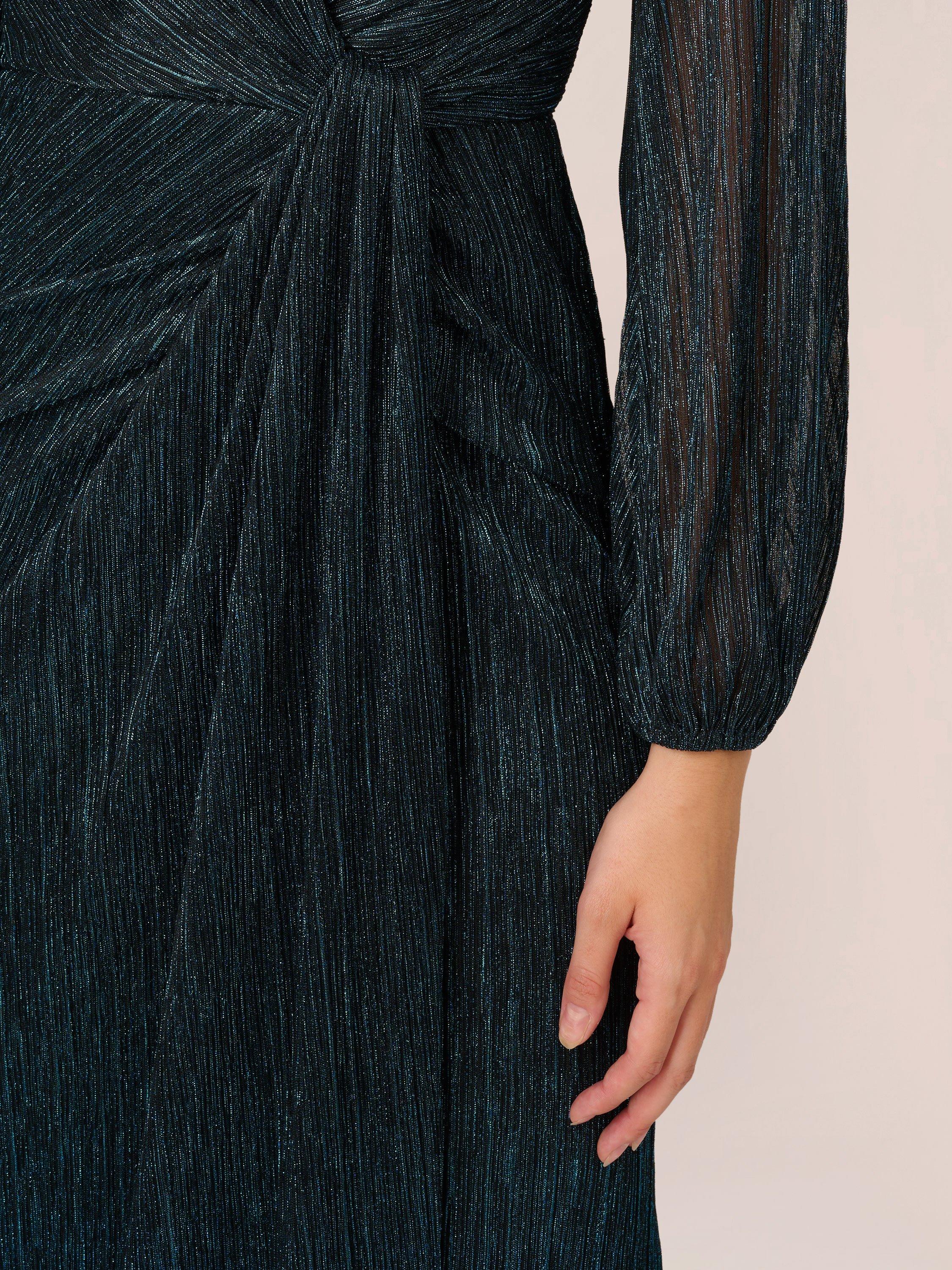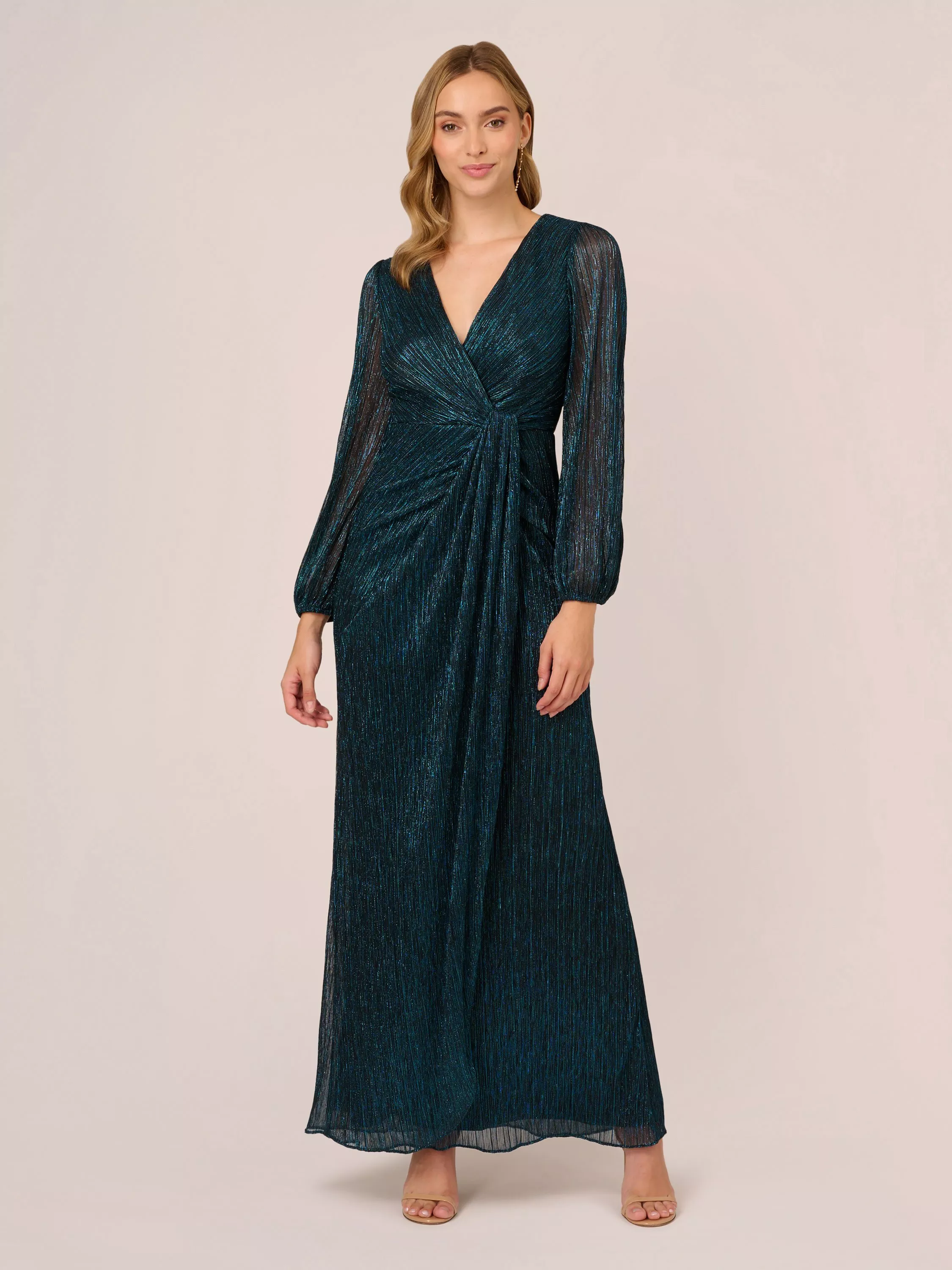 Entirely flattering with its A-line shape, this floor-length dress from Adrianna Papell boasts a draped detail to the front for added appeal. With a universally flattering v-neckline and long sleeves, it is transformed with light-catching metallics.