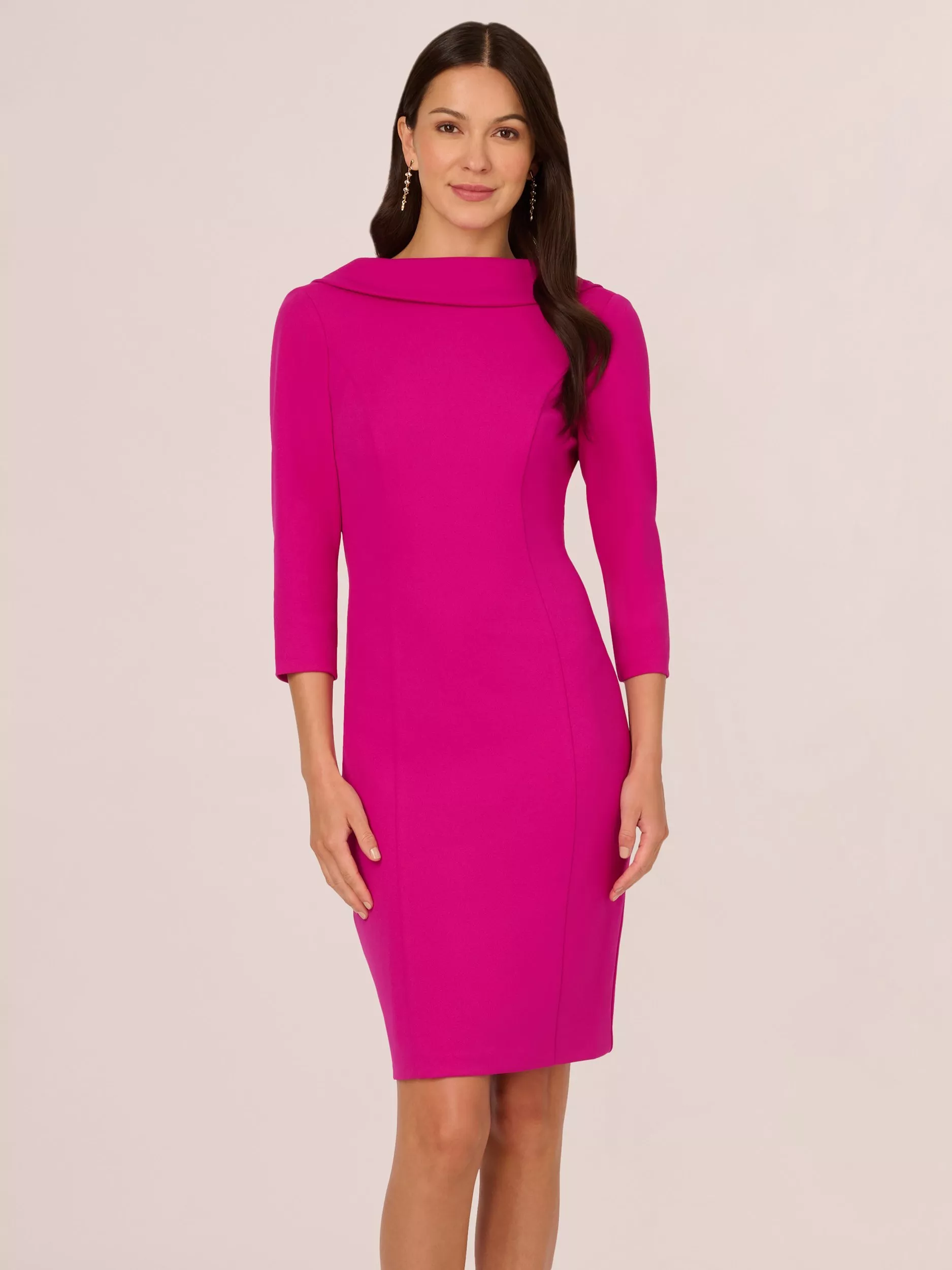 Enter into your timeless era when you step into this three-quarter sleeve midi dress. The boat neckline at the front, enhanced by a band collar, seamlessly transitions into a shawl collar at the back, creating a striking silhouette from every angle. Three-quarter sleeves add a touch of refinement, while a chic bow detail at the back adds a hint of feminine allure to this three-quarter sleeve dress. Designed with knit crepe fabric that has plenty of stretch, this bodycon dress is a comfortable style.