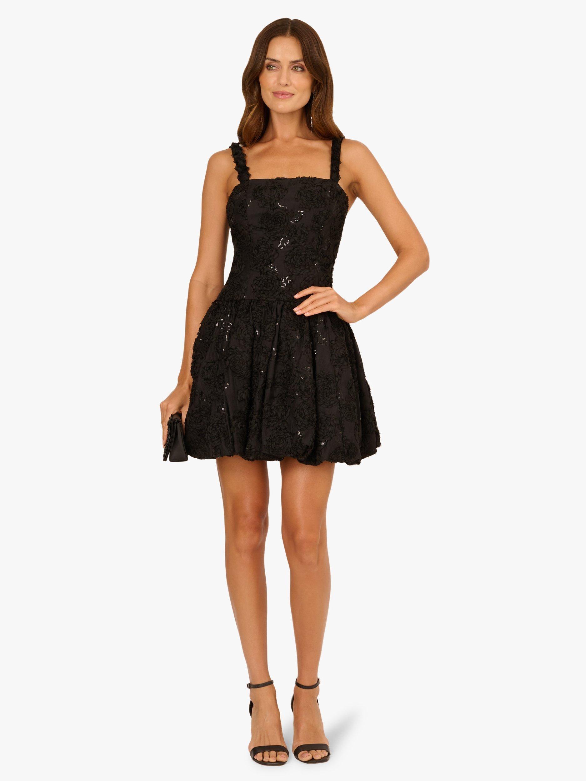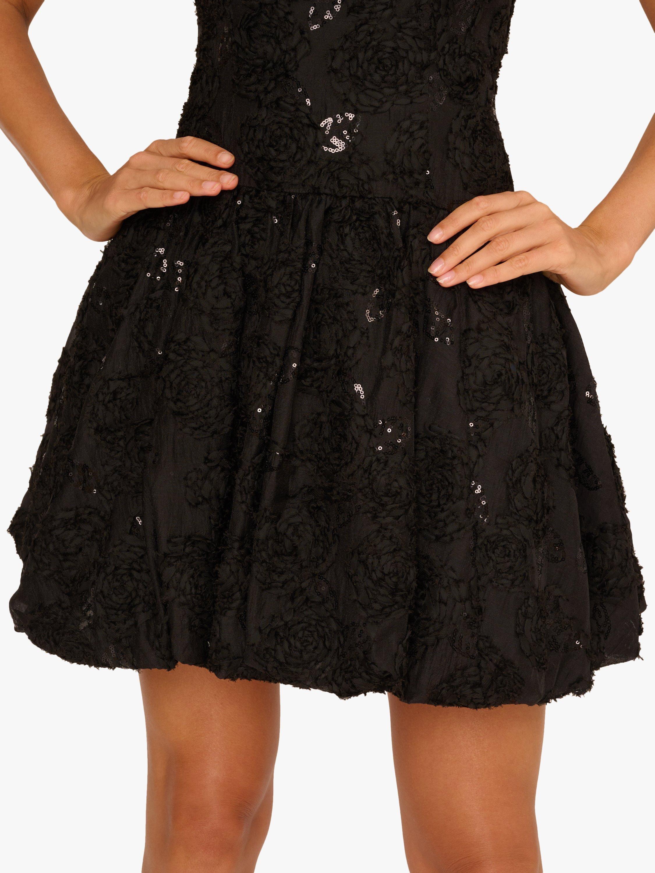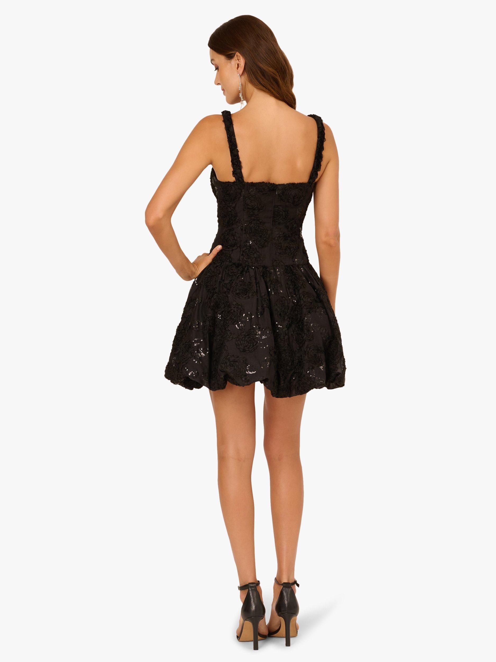 Designed to dazzle, this stunning sleeveless cocktail dress is crafted from a richly textured fabric adorned with all-over soutache embroidery and sparkling tonal sequins. The drop waist silhouette features a fitted bodice with princess seams and a playful bubble skirt that adds volume and movement. Finished with a square neckline and delicate rosettes trimming the straps for a romantic touch, this party-perfect short dress is made for dancing, toasting, and turning heads.