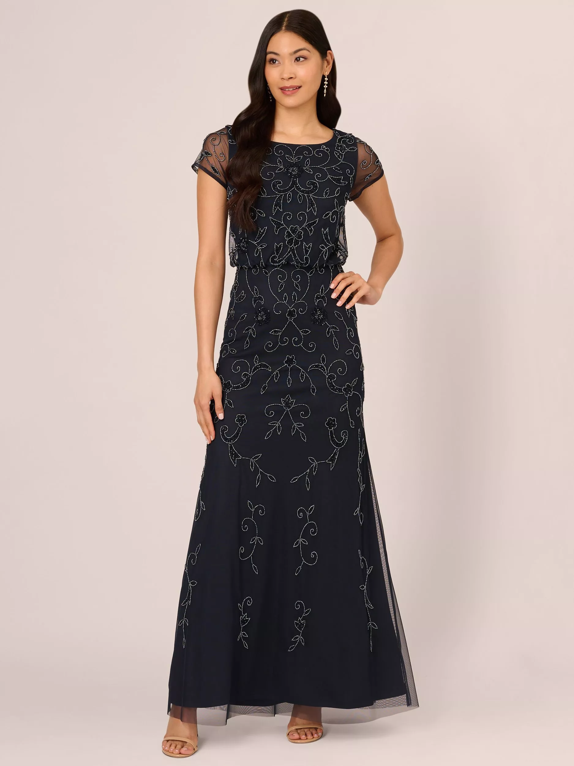 Ring in all of your favourite events in style when you step into this beaded blouson gown. This formal dress features a blouson bodice with a boat neckline, sheer short sleeves, and a soft skirt. Designed with a soft and luxurious mesh, this dress boasts floral and vine sequin beading throughout. A hidden zipper back finishes this evening gown with ease. Nude heels and a satin clutch is all this dress needs for an elevated look.