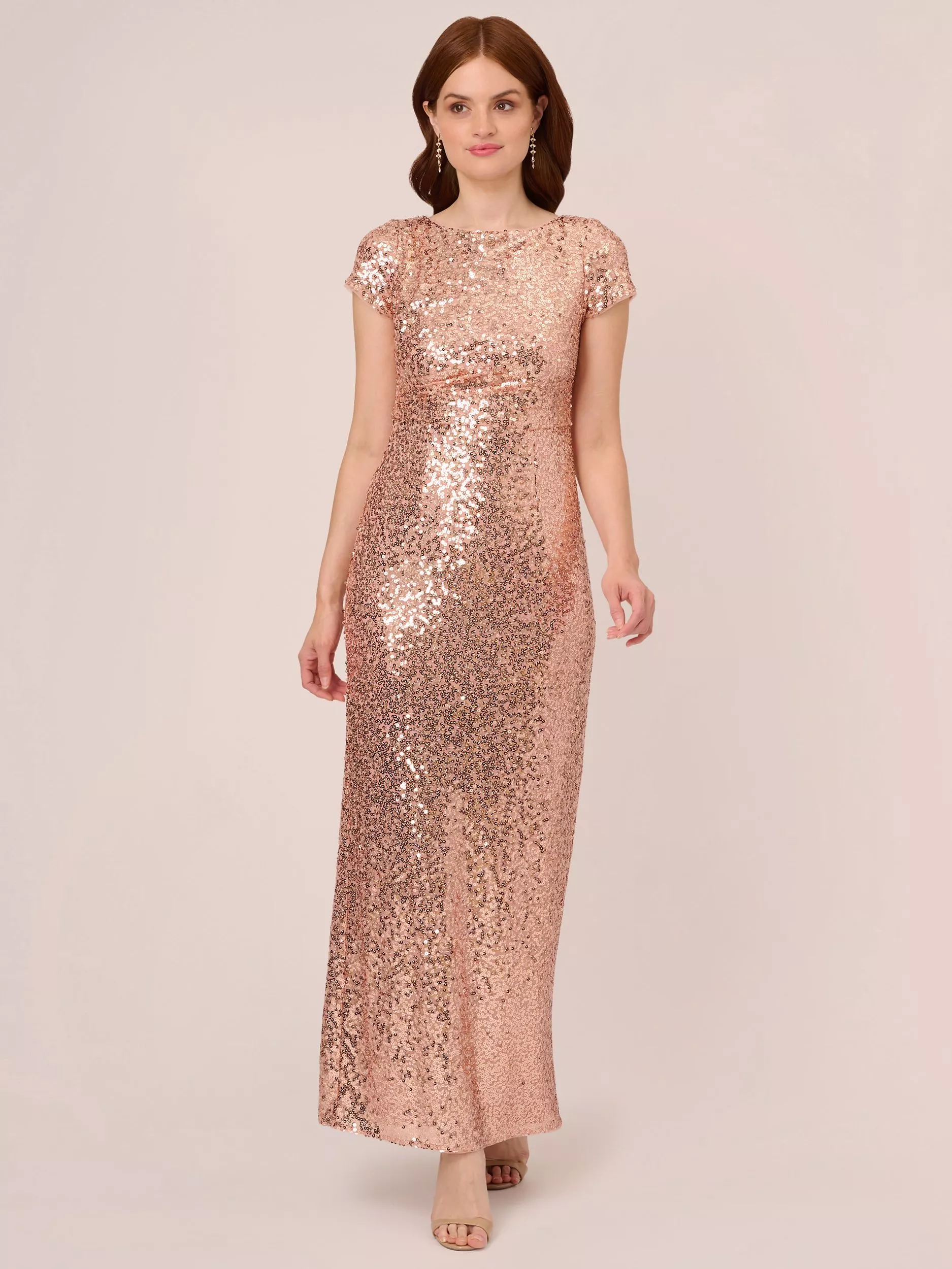 A timeless choice thanks to its columnar cut, this floor-length dress from Adrianna Papell is made from a comfortable yet resilient fabric with a back slit. Keeping things simple with a round neckline and short sleeves, this style shimmers with detailed embellishment.