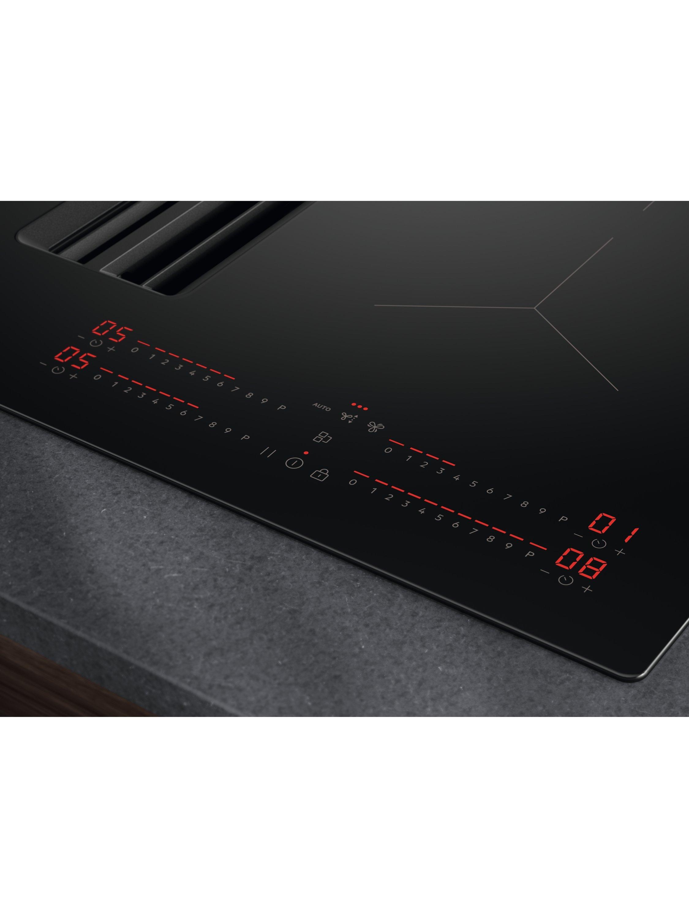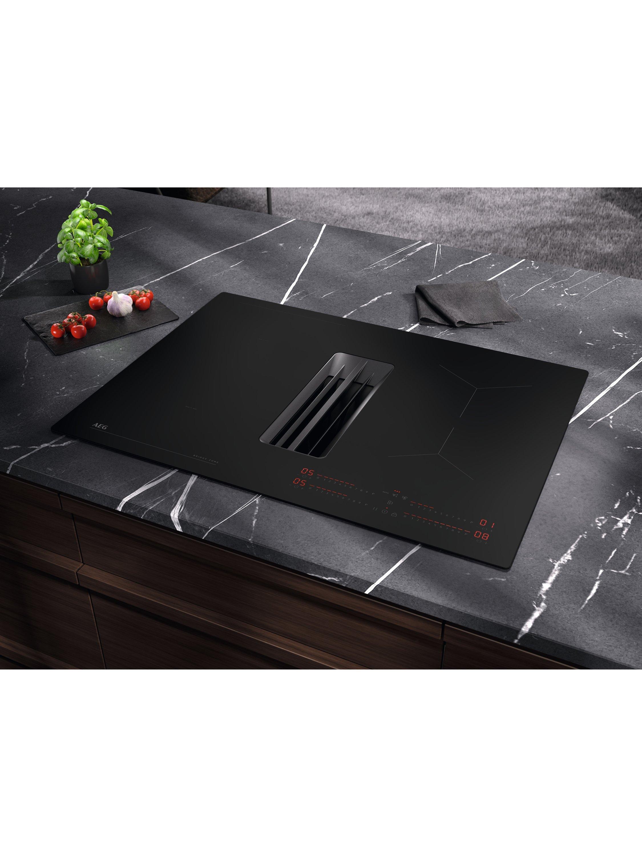 This Bridge Extractor Hob combines induction and extraction. The Bridge feature links two zones for a larger cooking area.