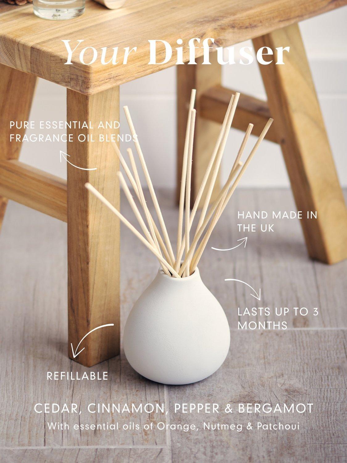 Warm and comforting, this reed diffuser blends patchouli, nutmeg, and uplifting orange for a cosy, woodland-inspired scent. Housed in a sleek, neutral-toned clay vase, it’s perfect for creating a Hygge-style haven—and makes a chic stem vase once empty.