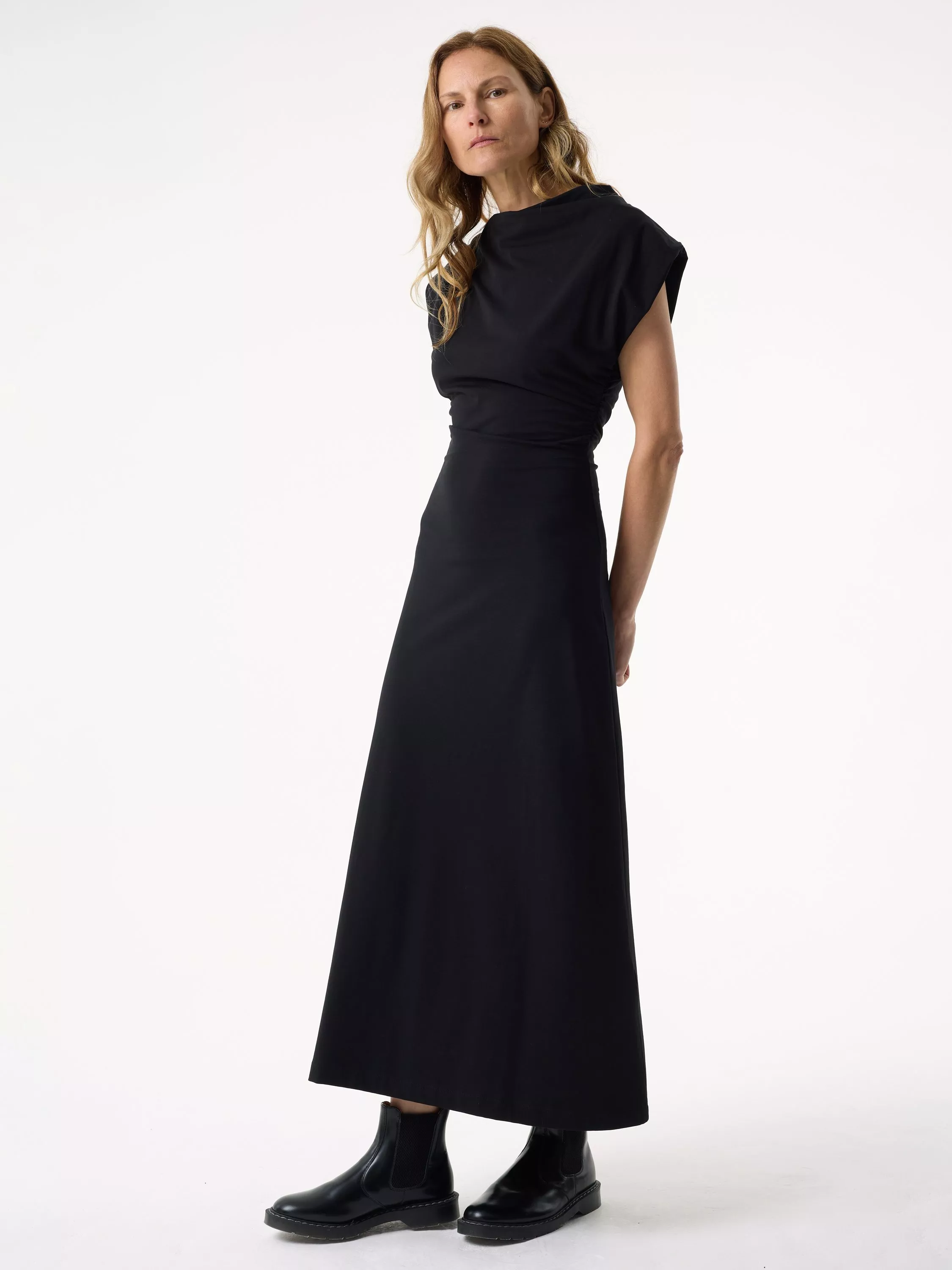 Lola is a sleeveless, fitted asymmetrical dress in soft stretch cotton jersey, designed to sculpt and flatter. Cut with an asymmetric neckline and gathered through the waist, it contours the body with an elegant, draped effect. Lola pairs minimalist lines with elevated detailing for a sleek, refined silhouette — perfect from day to night.