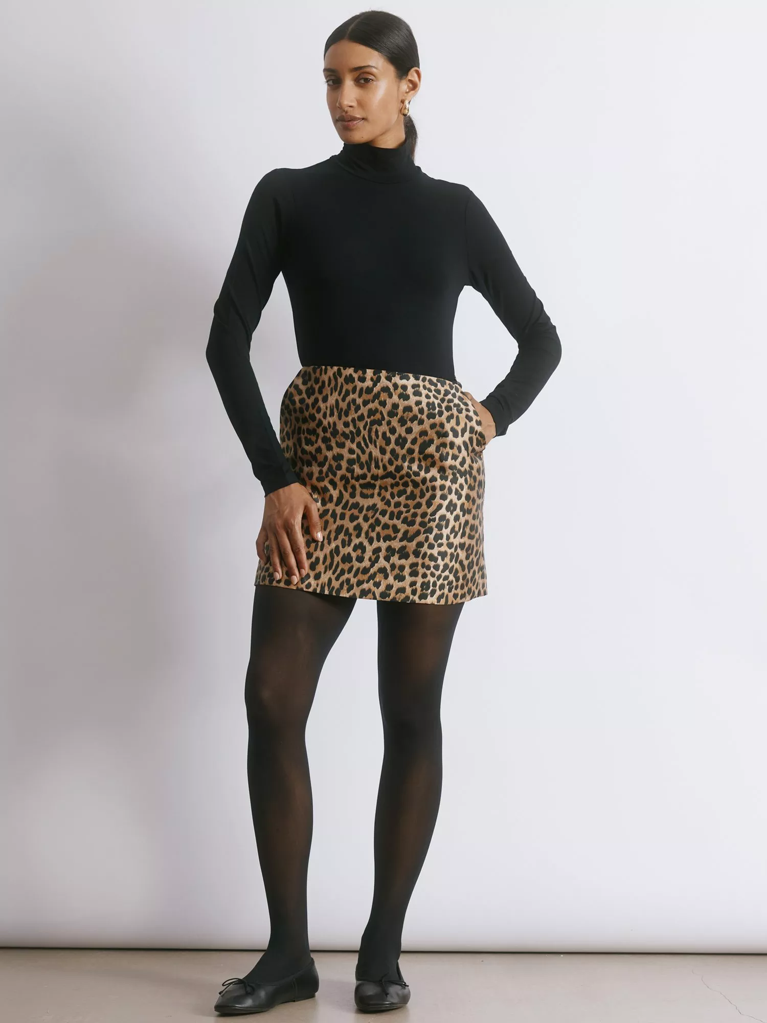 This mini skirt features a smooth taffeta fabric with a striking animal print, complete with convenient side pockets and a fully lined interior for comfort.