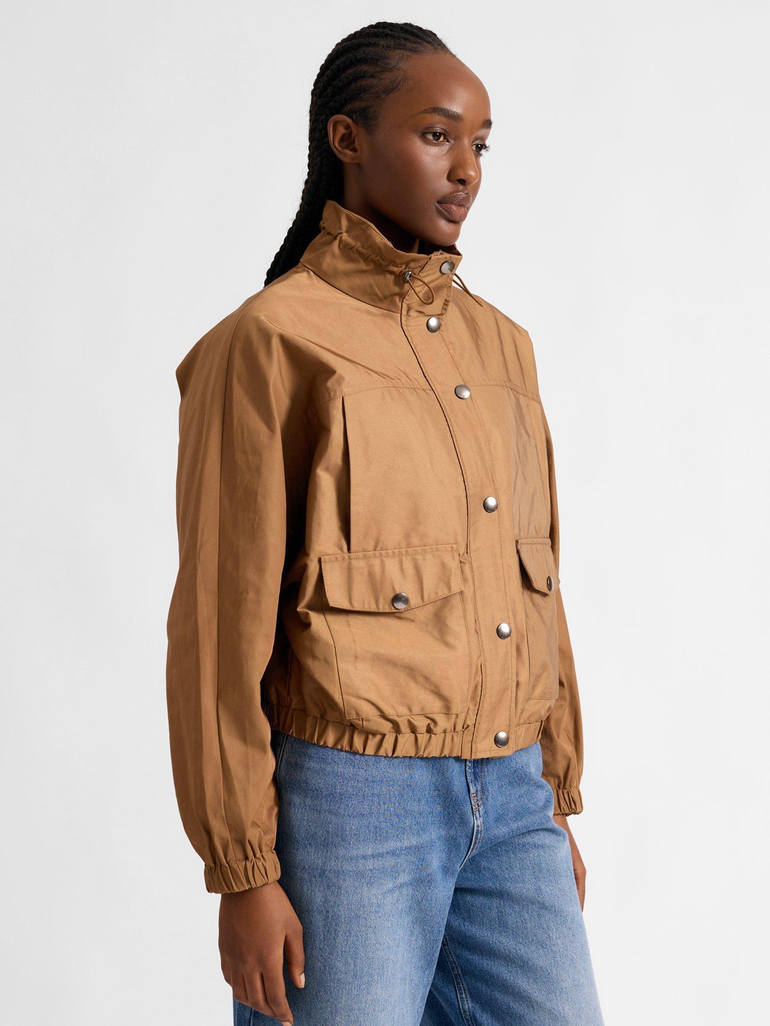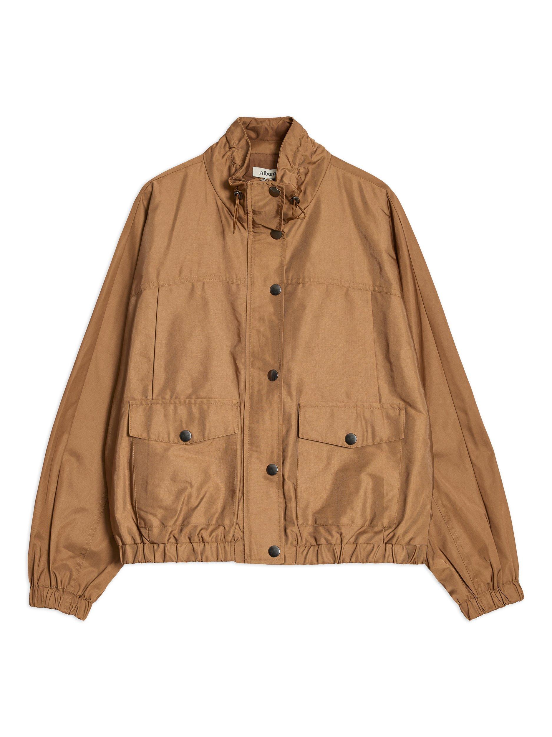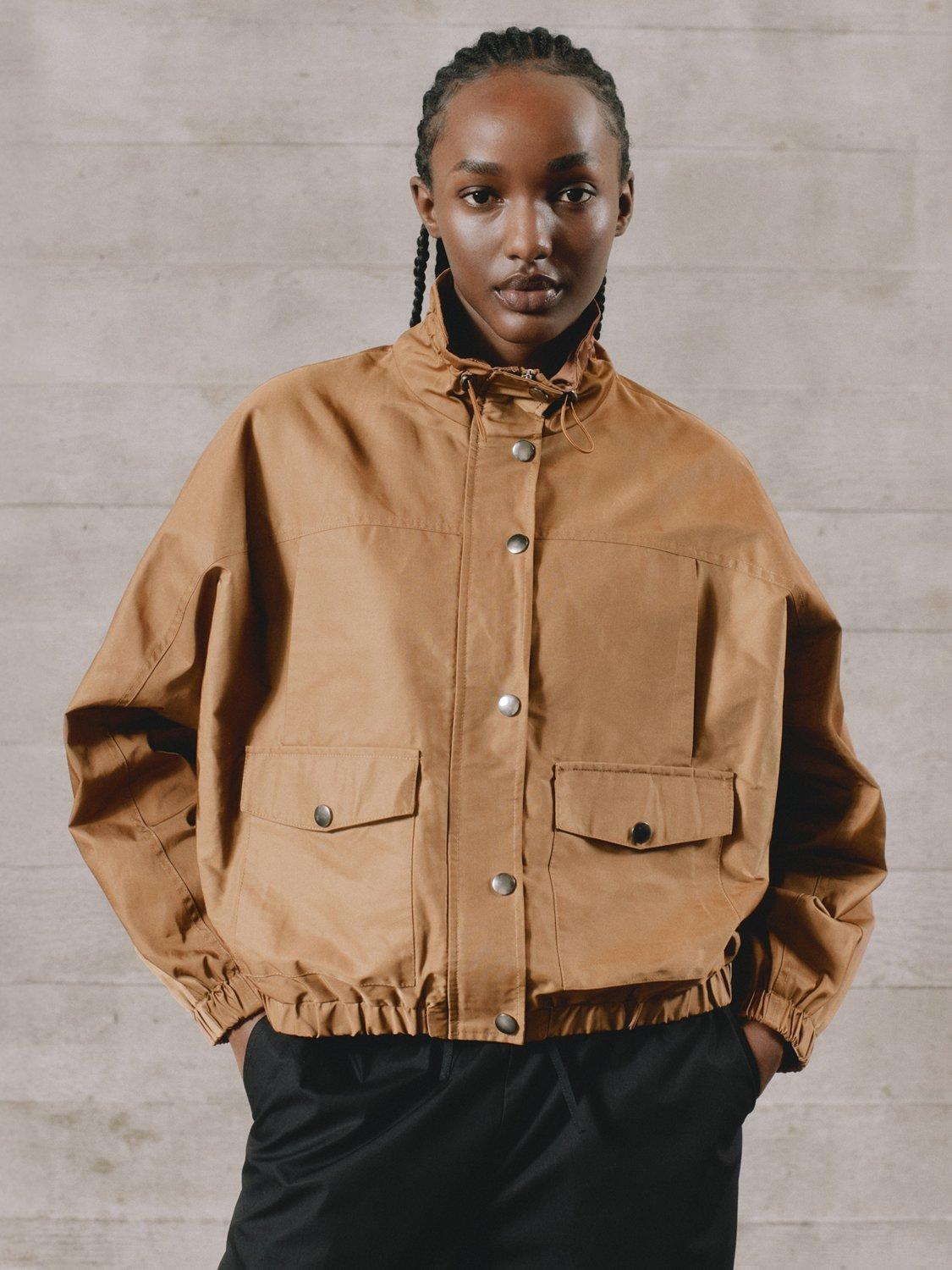 This timeless piece includes an elastic blouson hem design for a new modern take on the lightweight jacket. It has convenient popper detail patch pockets as well as functional breast pockets. It features a gathered funnel neck drawstring neckline, with a clean popper front fastening. The sleeves gather into an elastic cuff.
