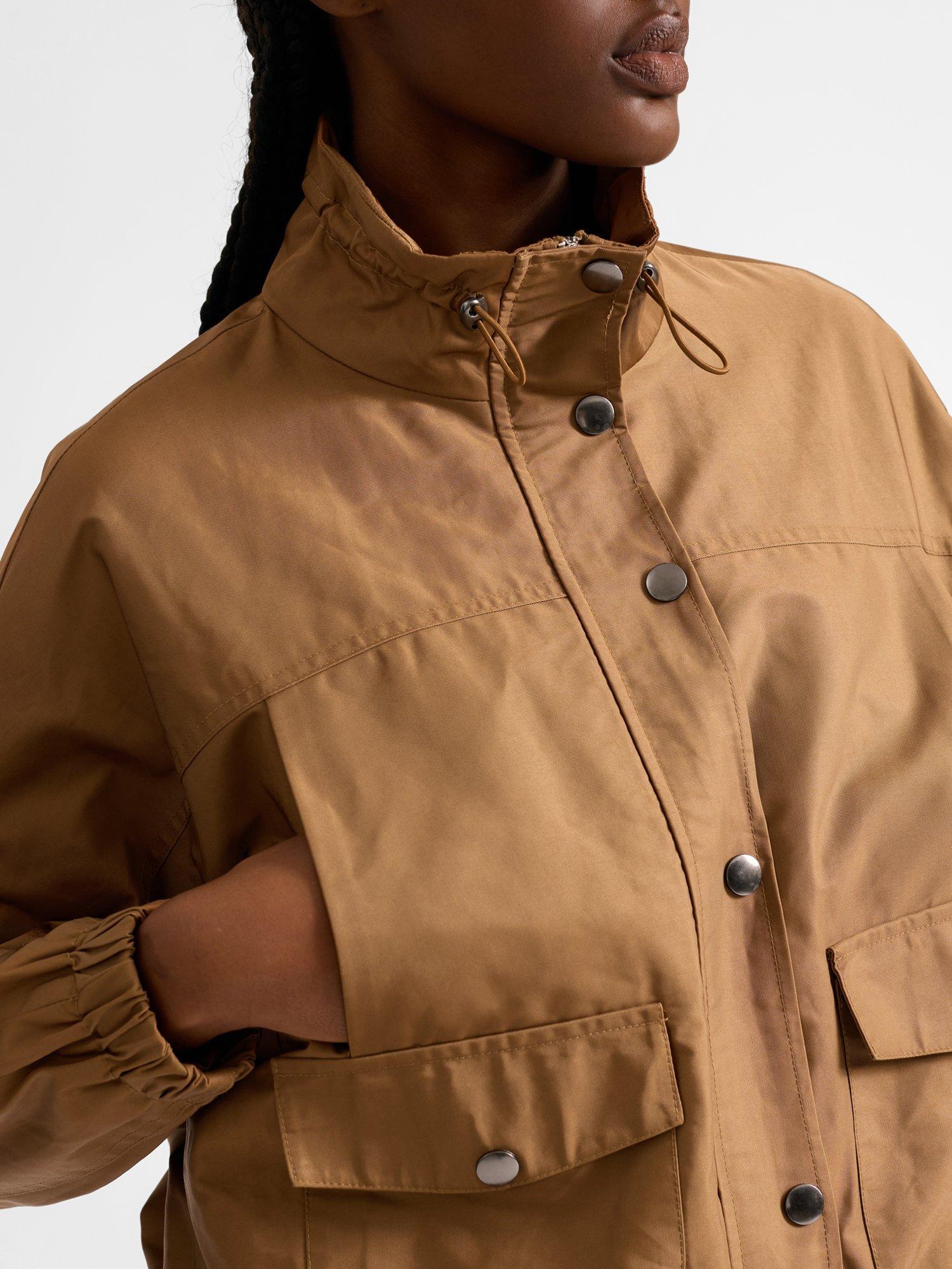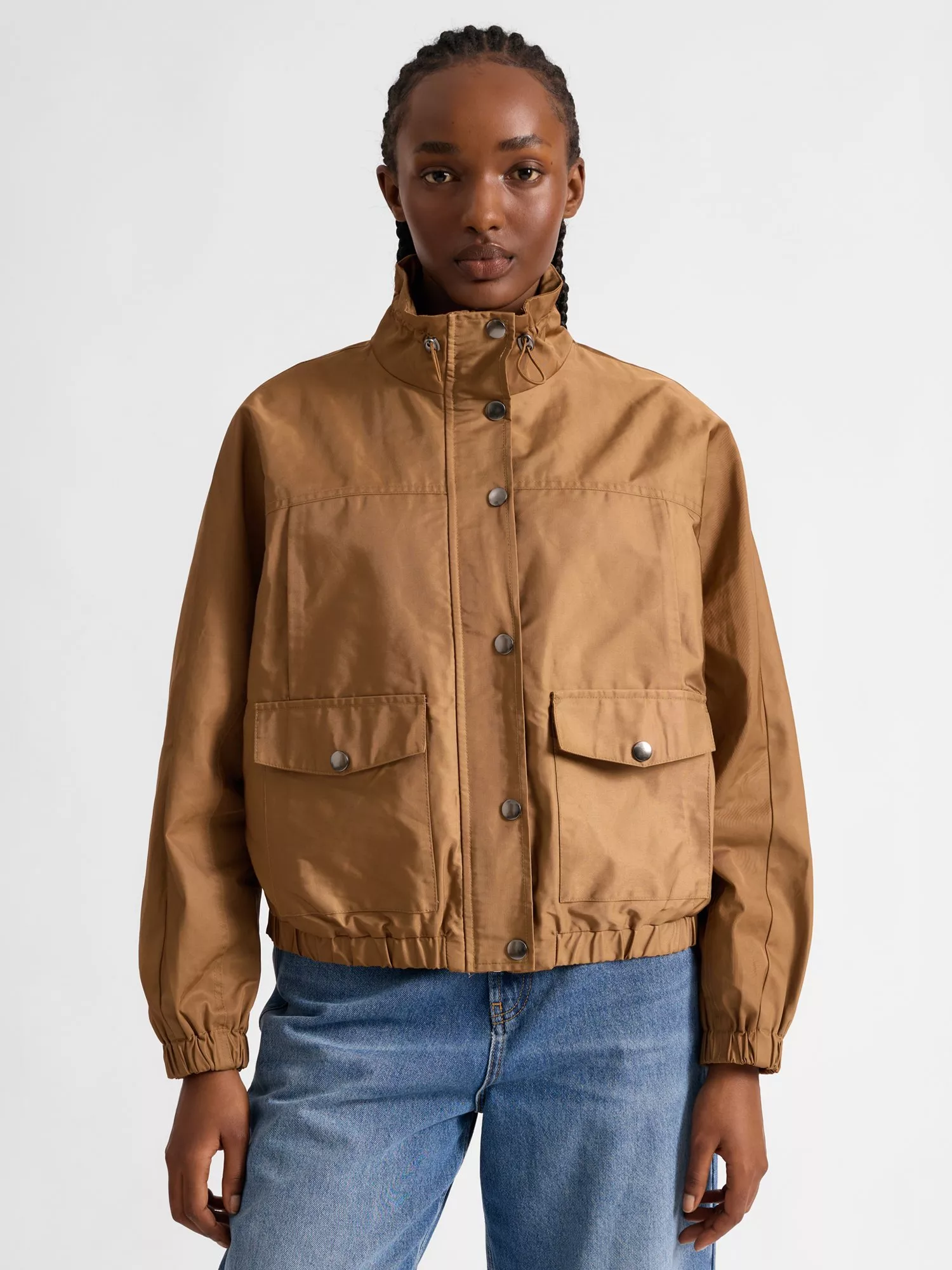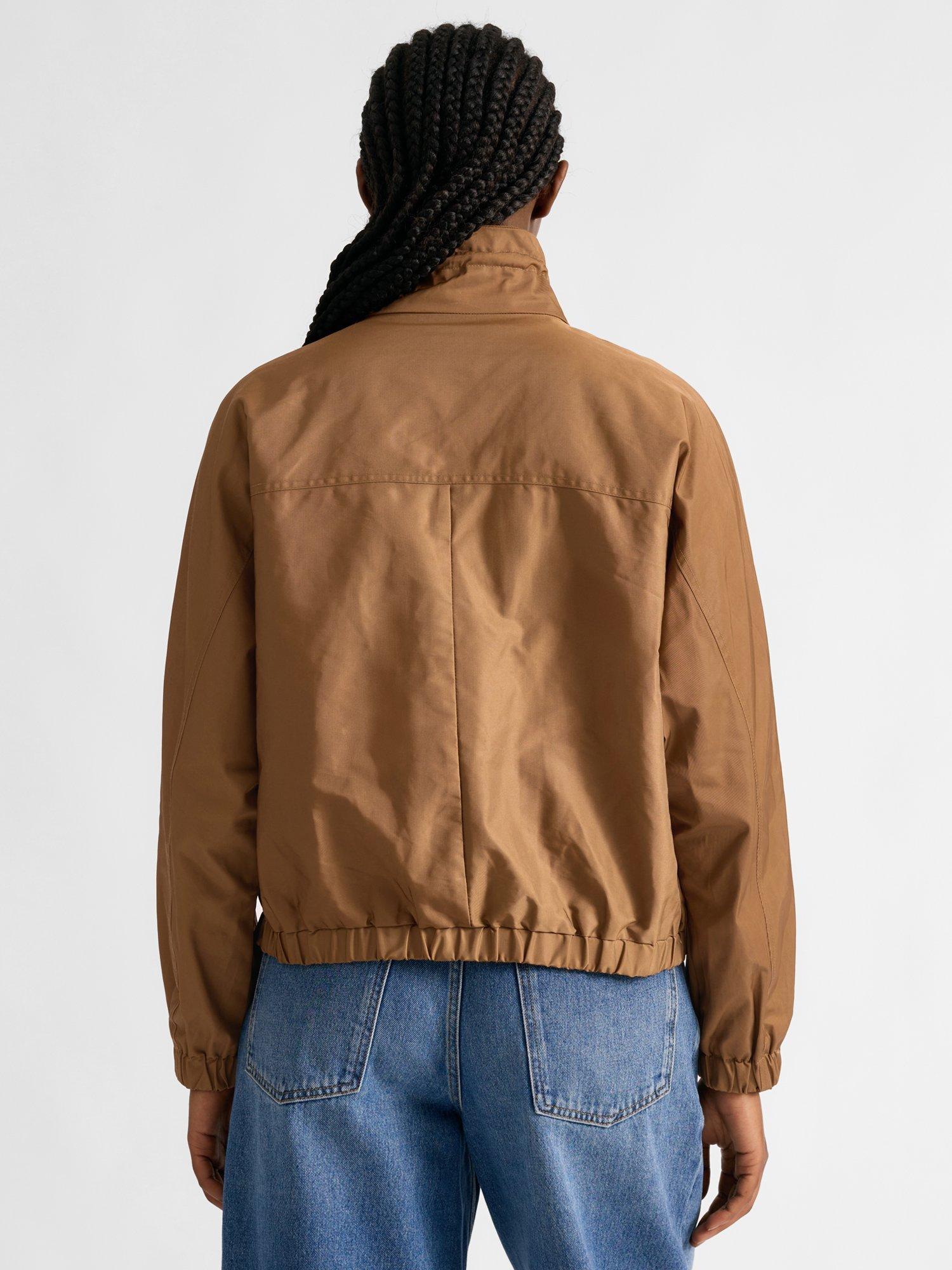This timeless piece includes an elastic blouson hem design for a new modern take on the lightweight jacket. It has convenient popper detail patch pockets as well as functional breast pockets. It features a gathered funnel neck drawstring neckline, with a clean popper front fastening. The sleeves gather into an elastic cuff.