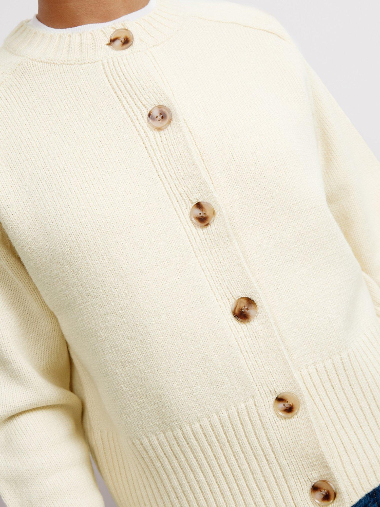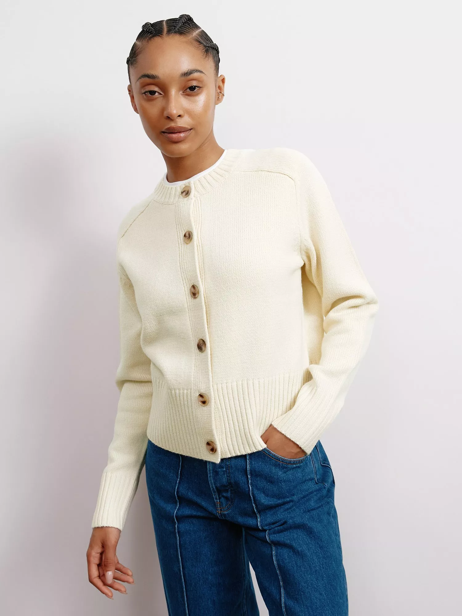 This Crew Cardigan is the perfect addition to your wardrobe, providing both warmth and comfort with its wool blend material. The deep rib cuffs and hem, paired with horn effect buttons, create a timeless and elevated design. A must-have for any functional and versatile wardrobe.