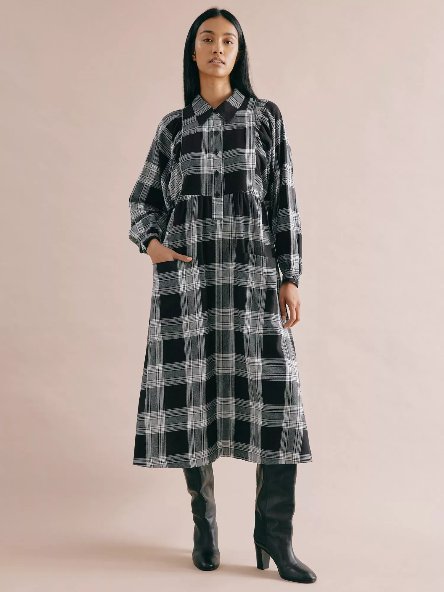 Discover the elevated comfort and style of organic cotton with this check midi dress. Expertly designed with a relaxed fit, dolman sleeves, and a classic collar and button front, this dress also includes functional patch pockets for added convenience.