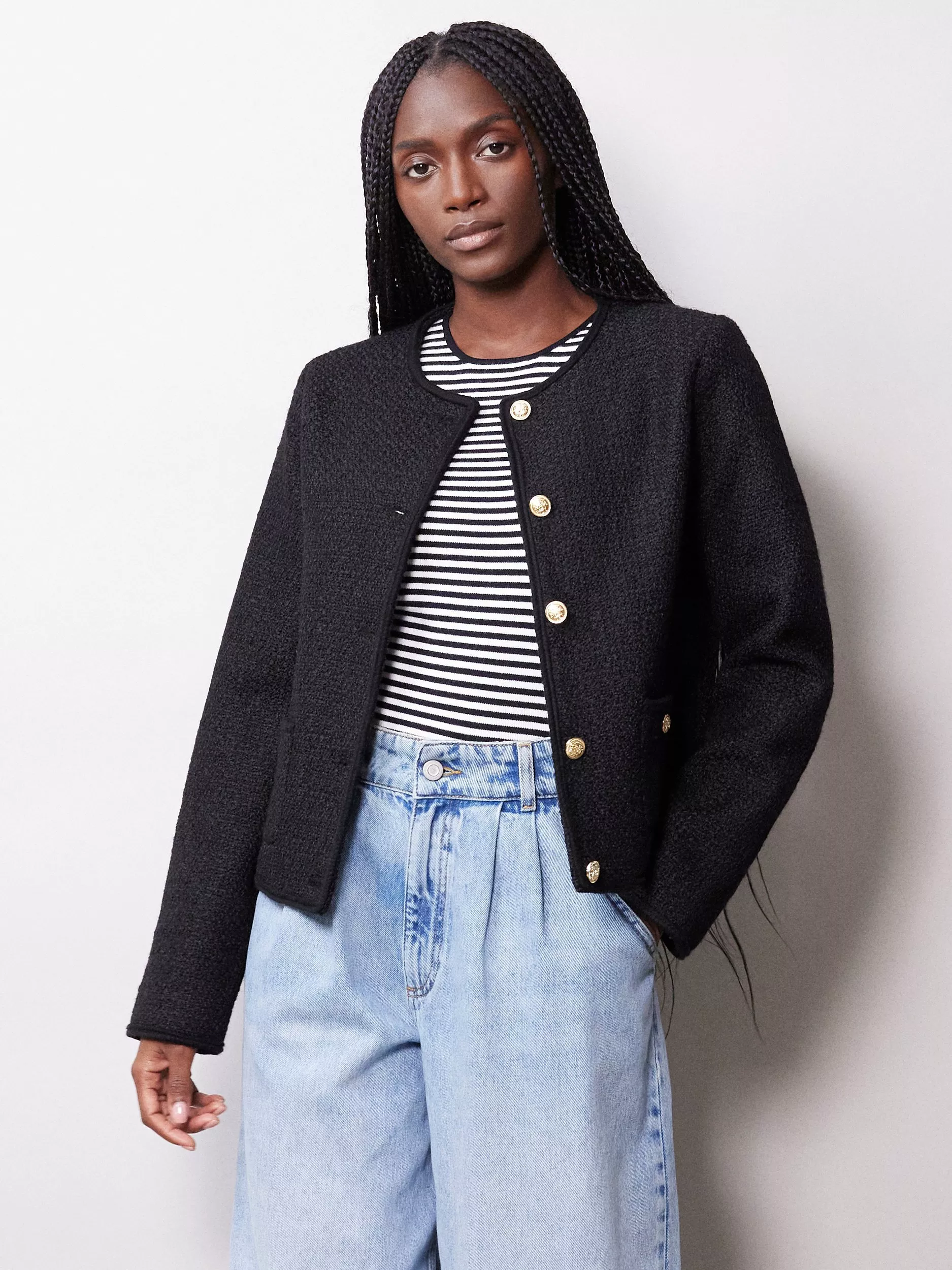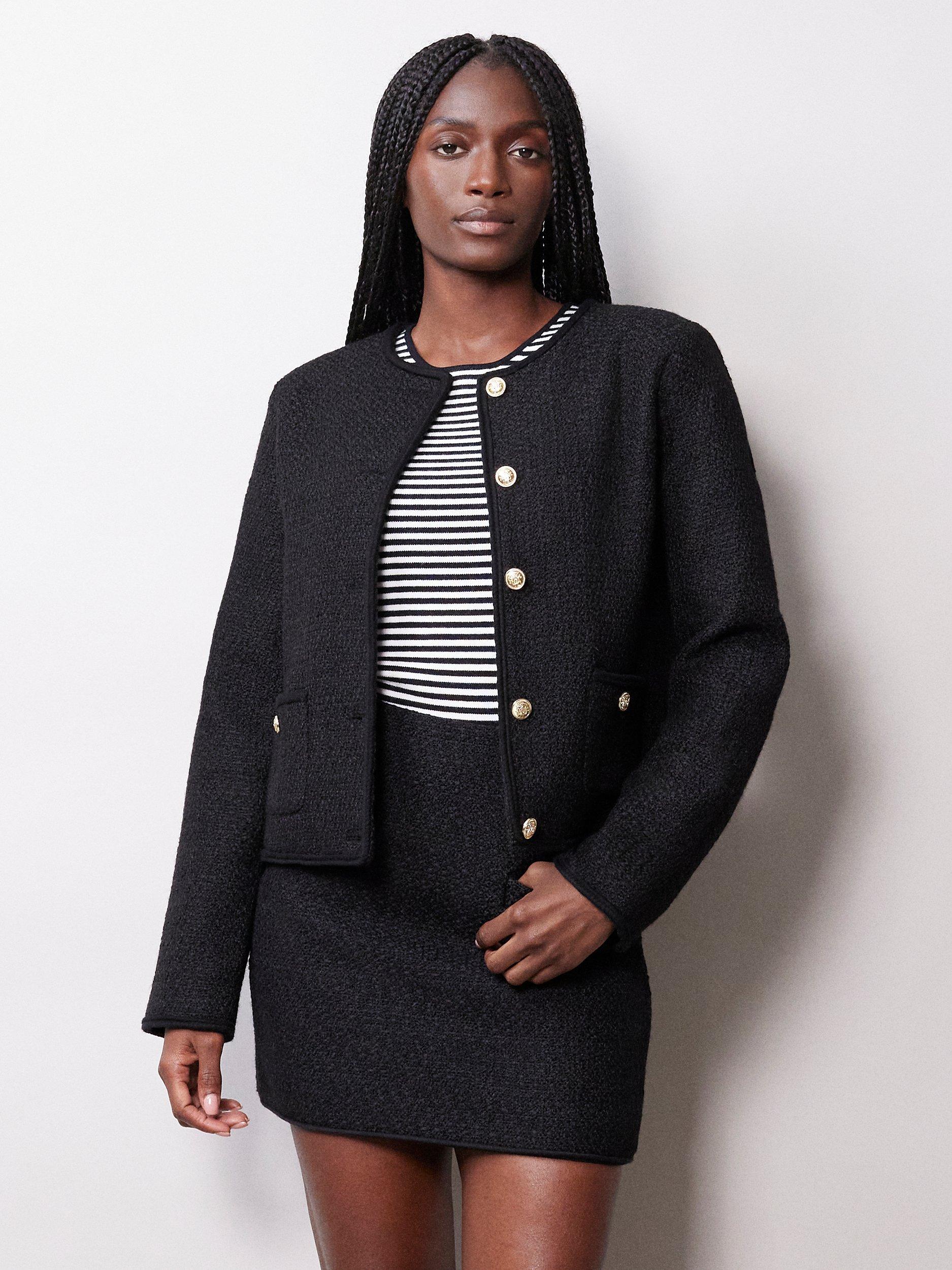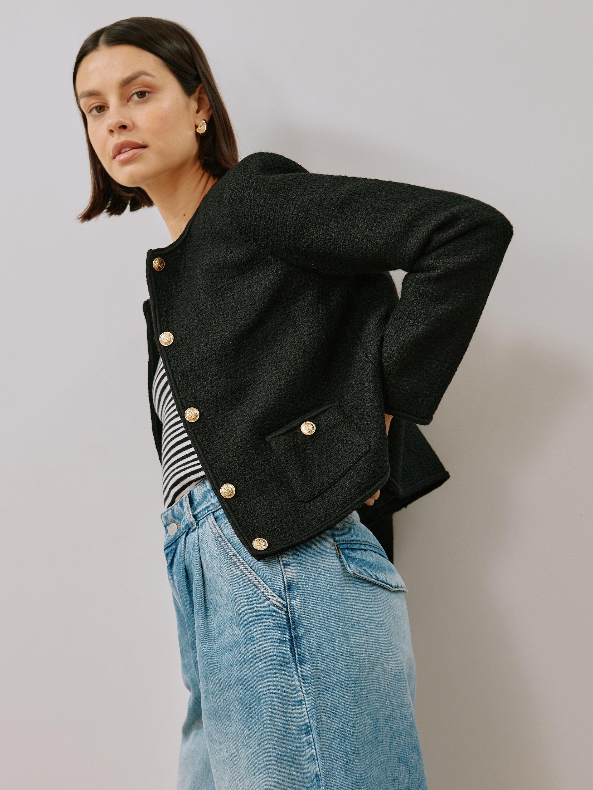 Designed with a simple round neckline and textured for added allure, it introduces traditional wool blended tweed to your ensemble.