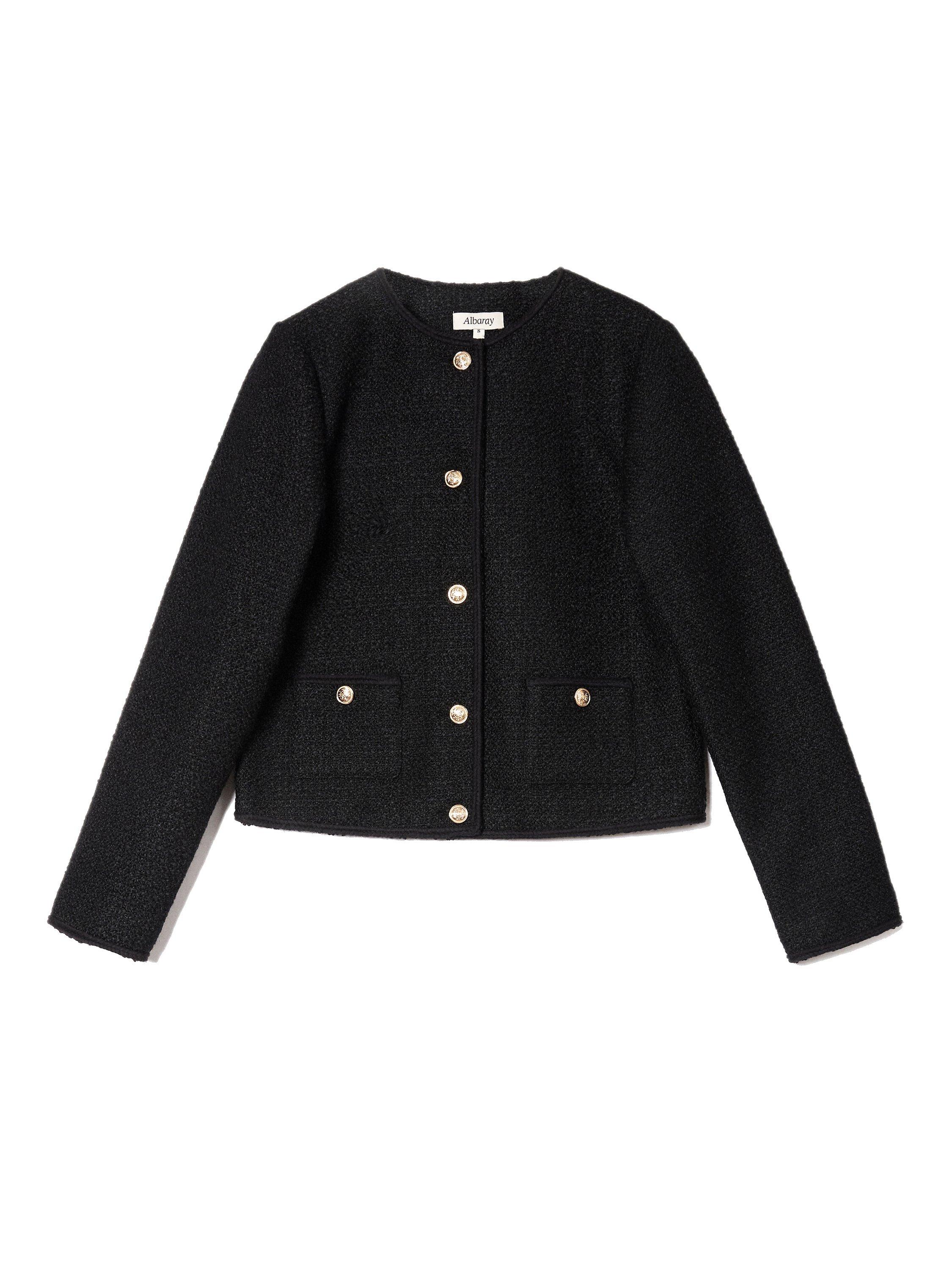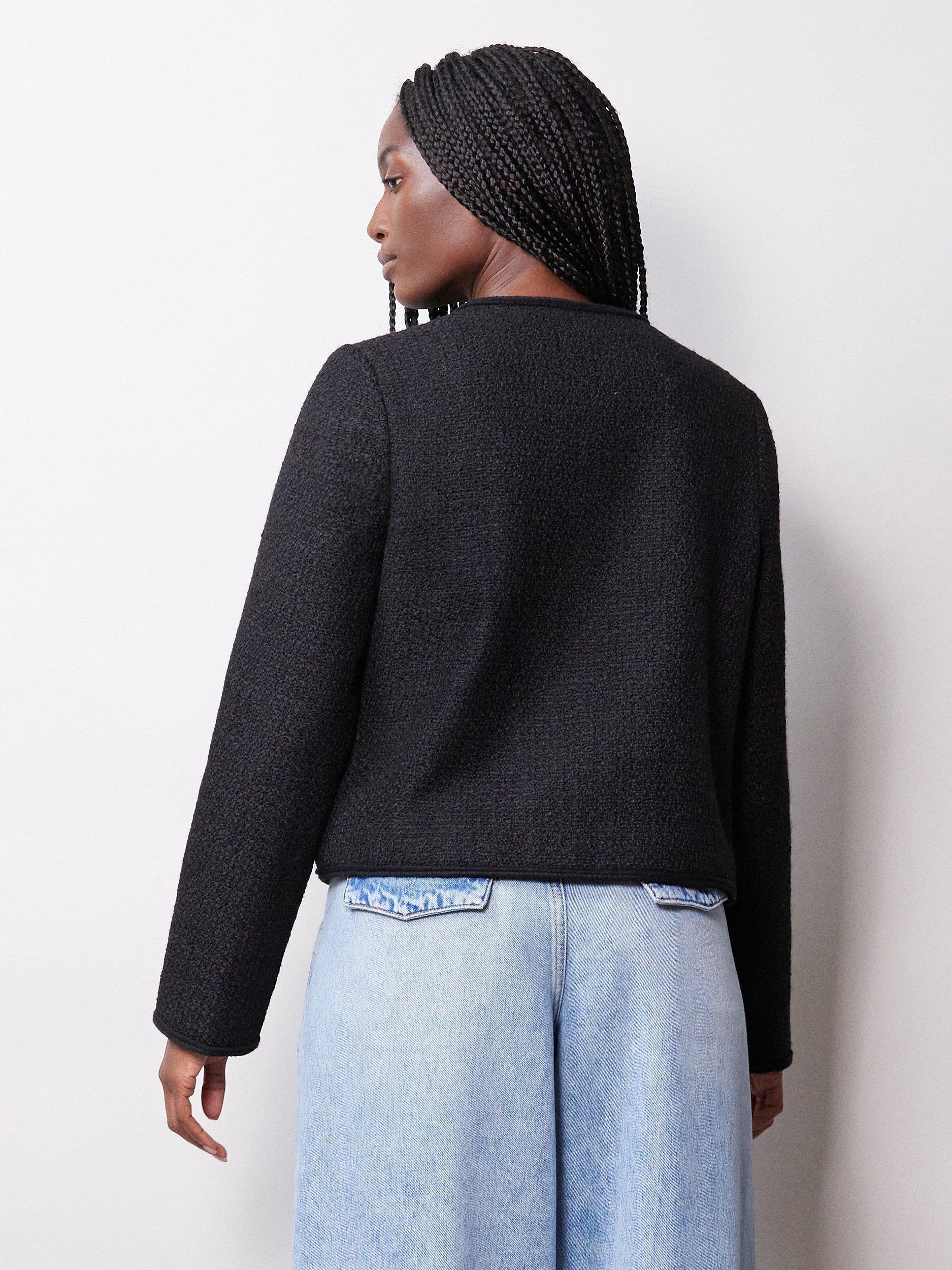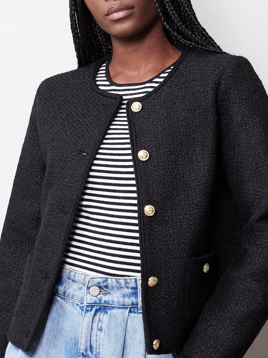 Designed with a simple round neckline and textured for added allure, it introduces traditional wool blended tweed to your ensemble.