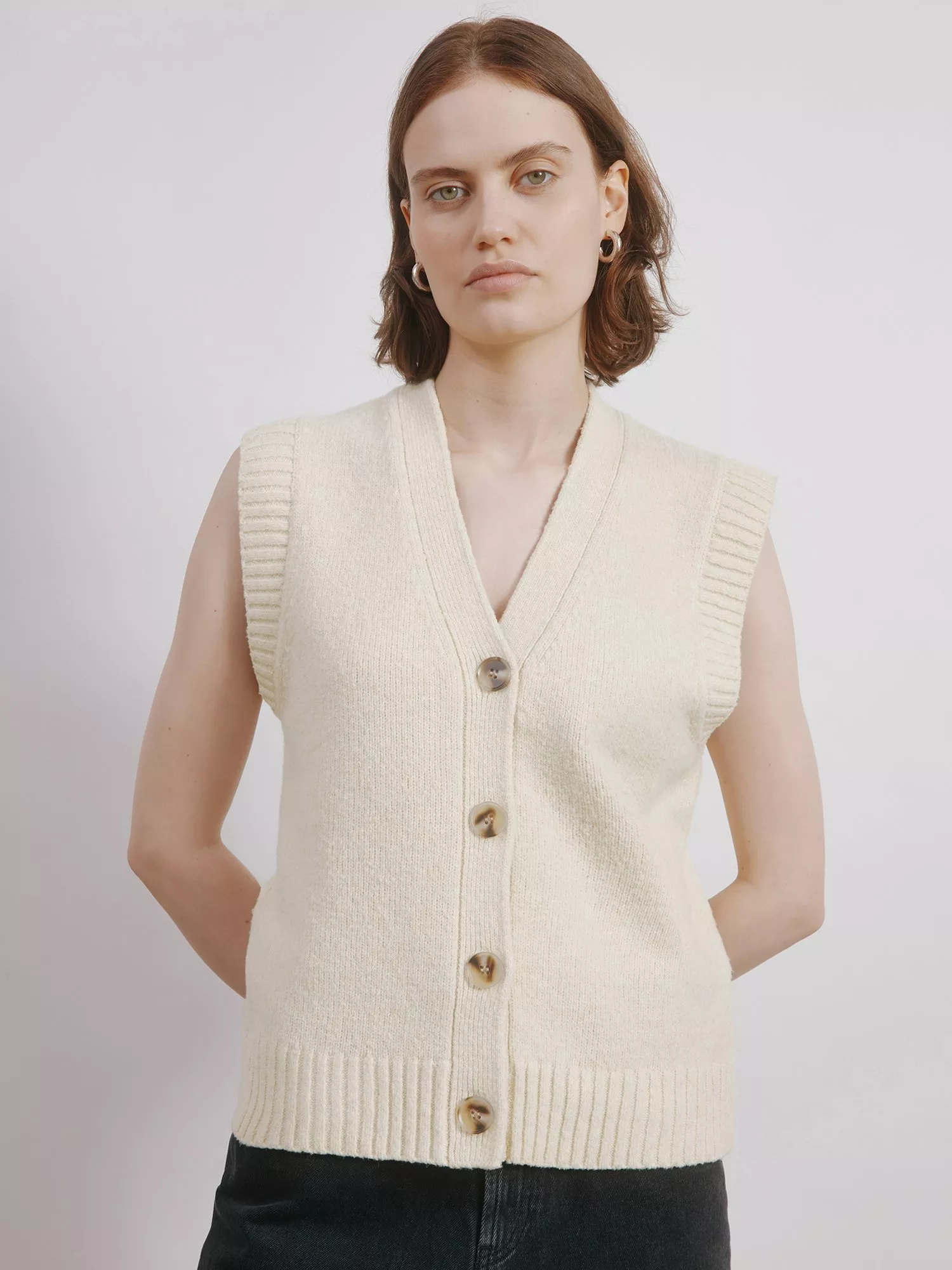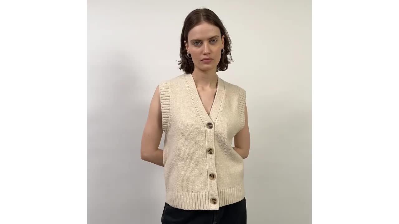 This knitted button tank top is a versatile addition to any wardrobe. The V-neck and extended shoulders create a flattering silhouette, while the mock horn buttons add a touch of elegance. This tank top is warm and comfortable. Perfect for layering or wearing on its own.