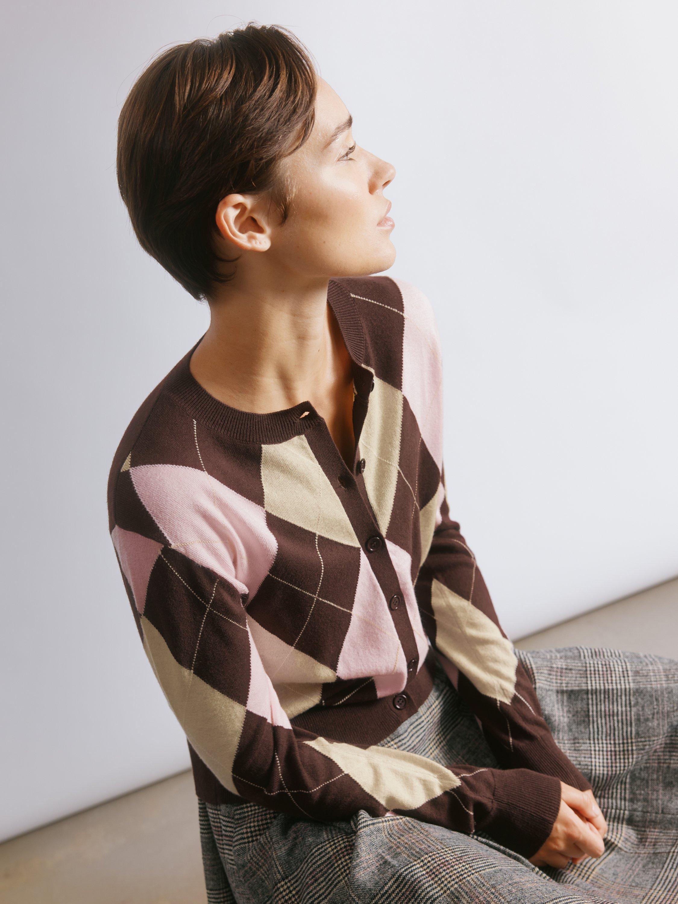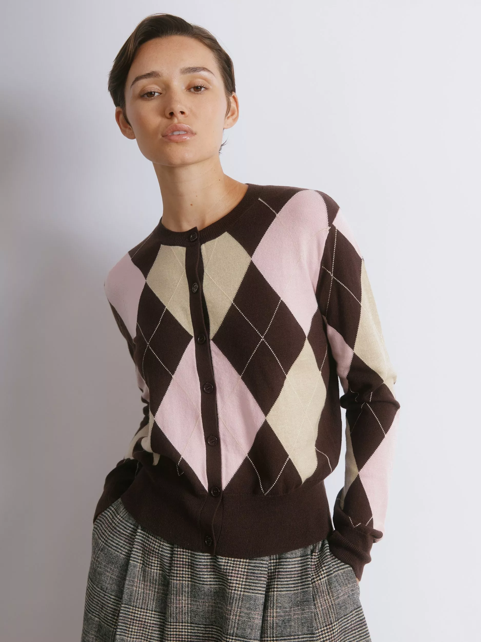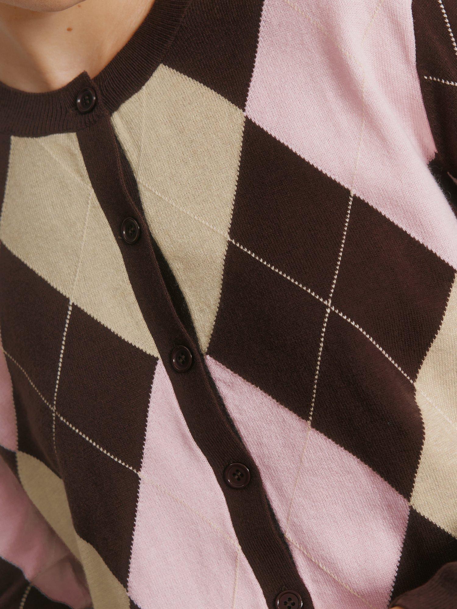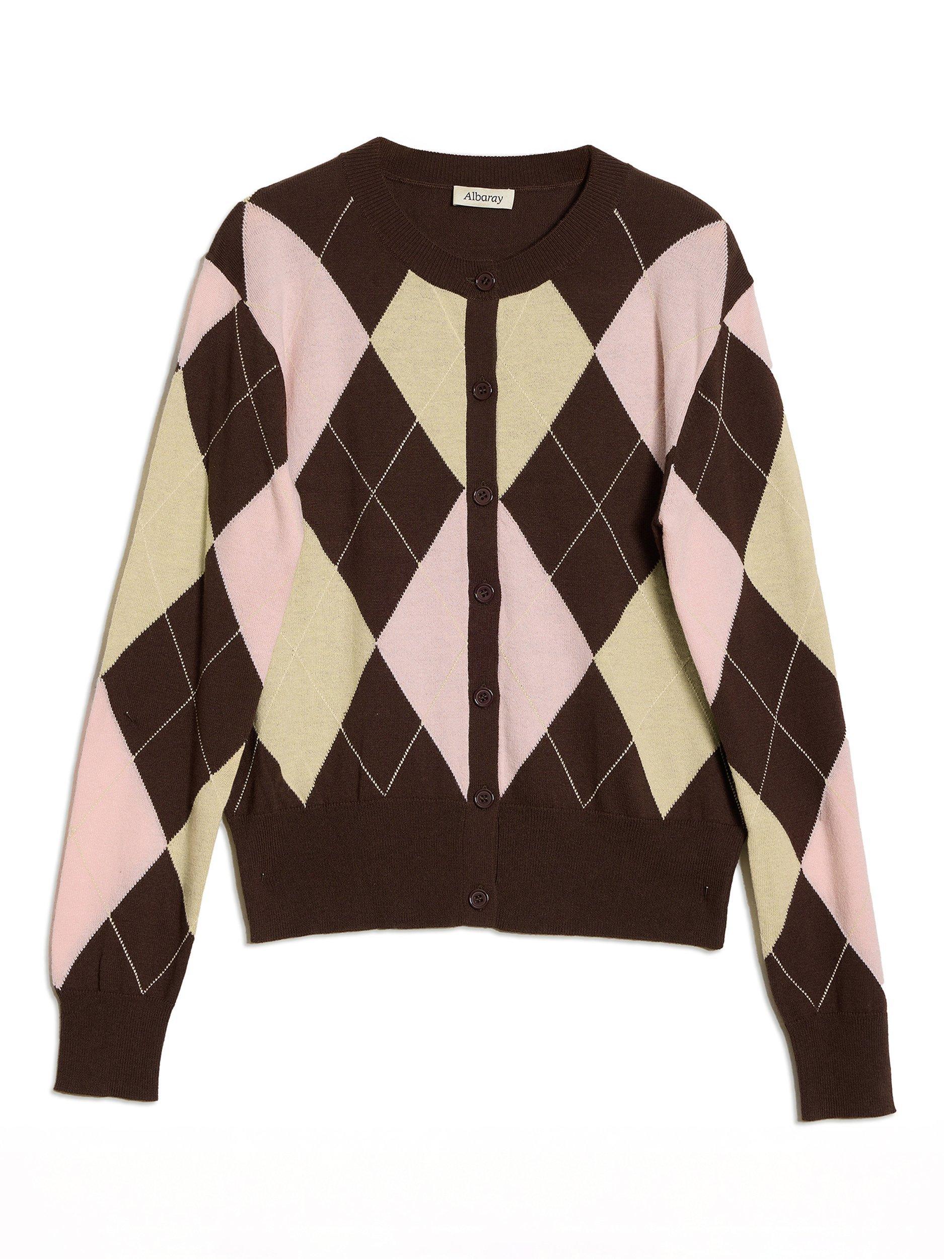 This cardigan features an argyle check complete with a crew neckline, simple button detail and ribbed cuffs and hem for a comfortable fit.