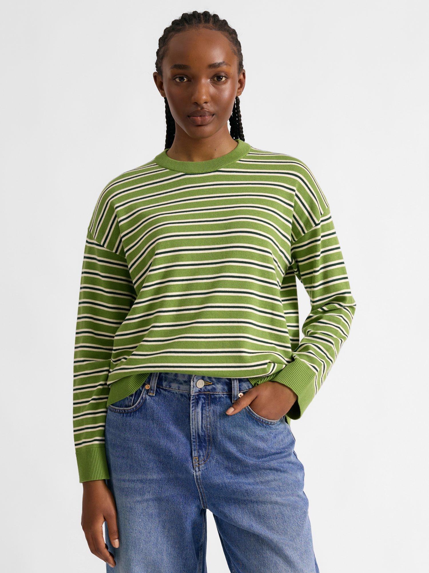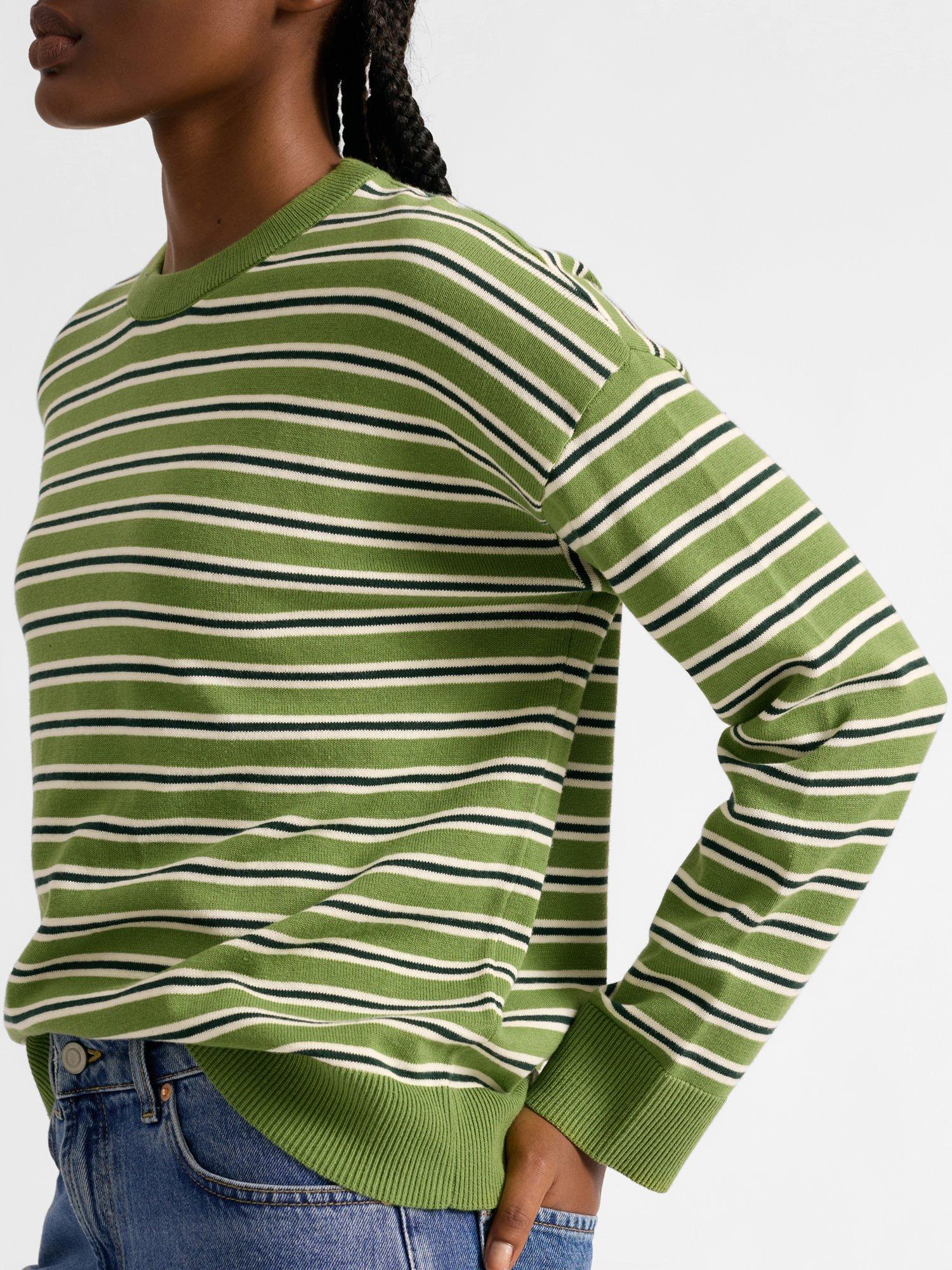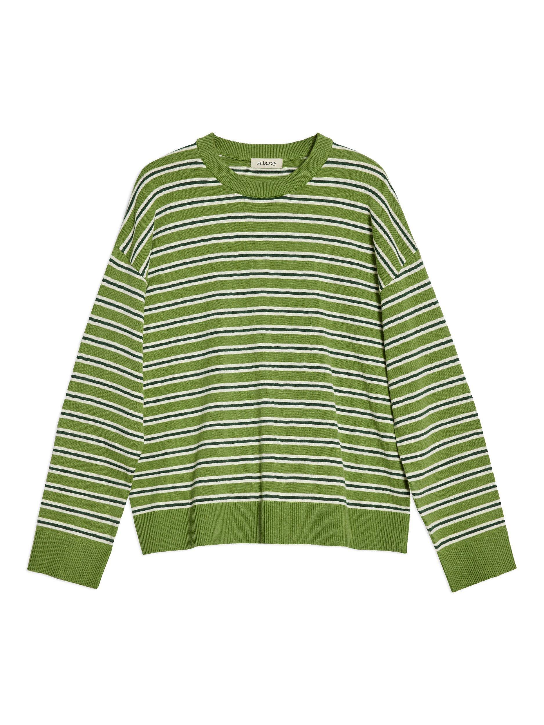 A relaxed crew neck jumper knitted in a soft cotton yarn. In a bold stripe, it is an instant colour refresh of a timeless wardrobe staple.