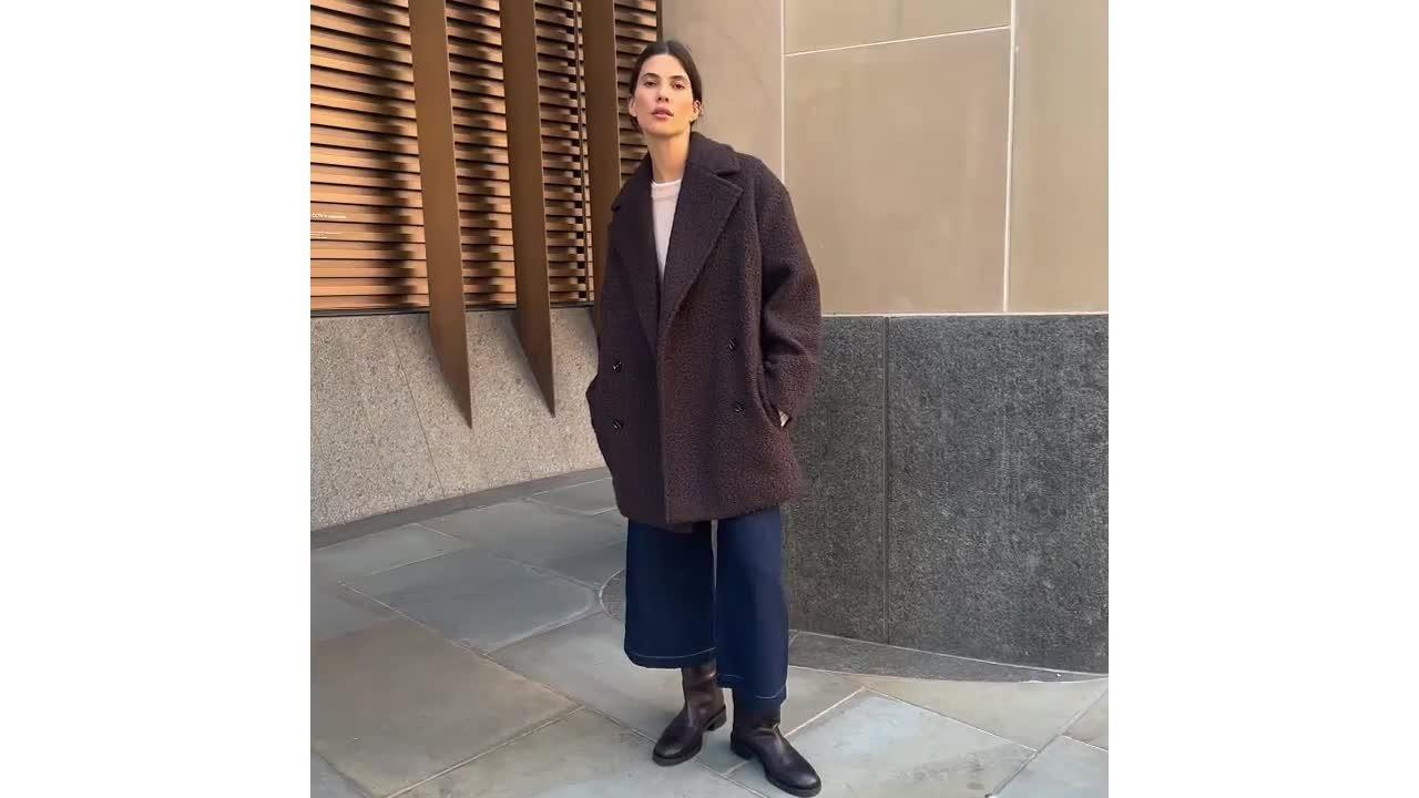 This coat features a plush curly fabric that feels soft and warm. Designed with a double-breasted front, classic notch lapels, and gently padded shoulders, it offers a timeless silhouette. Fully lined and oversized, it easily fits over your favourite knitwear. Practical details include two pockets and stylish horn-effect buttons, making it both functional and fashionable.