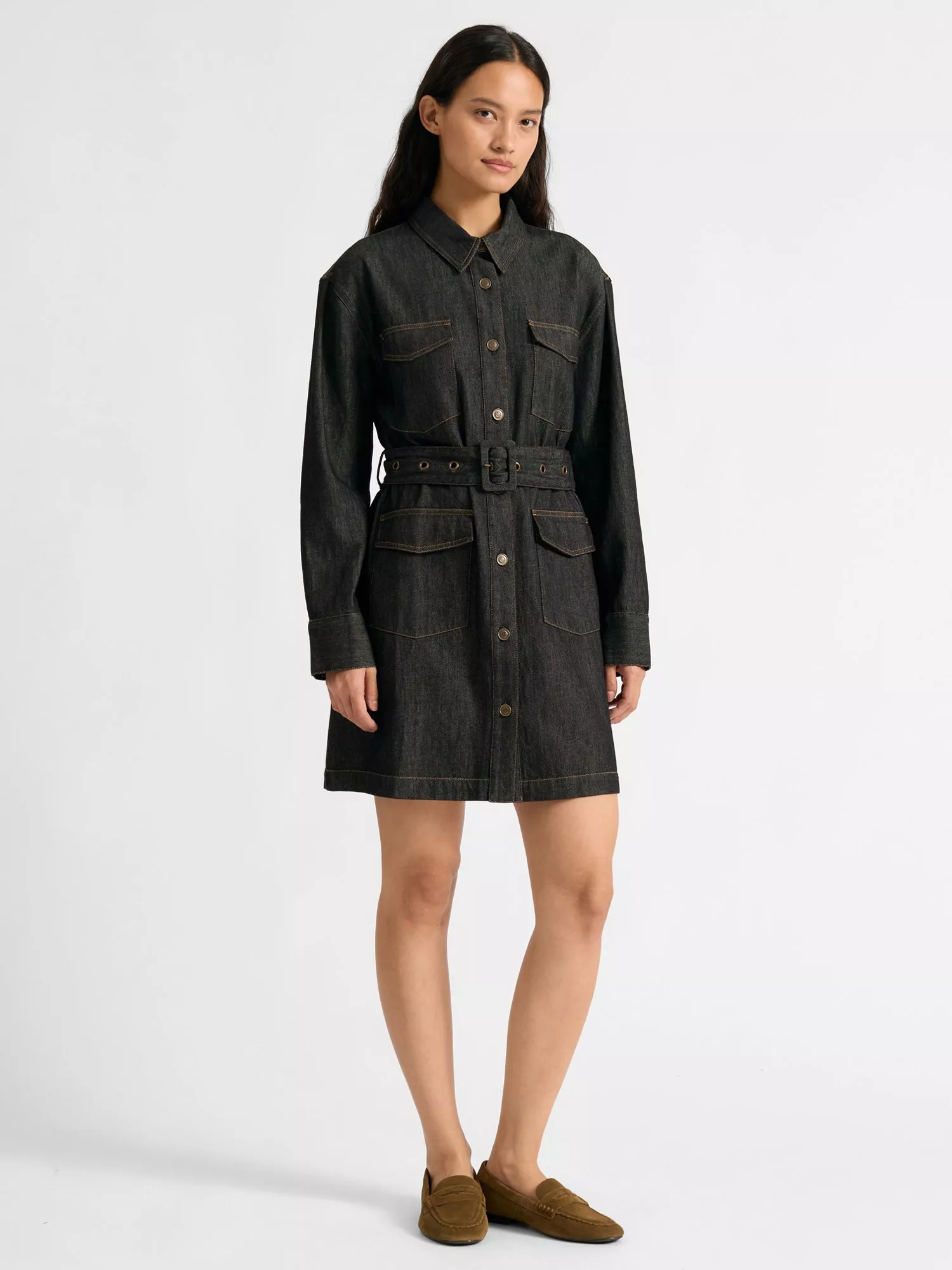This denim short shirt dress features jean-style buttons and a belt to emphasise the waist. It also includes breast and front patch pockets for added convenience and a nod to the utility style.