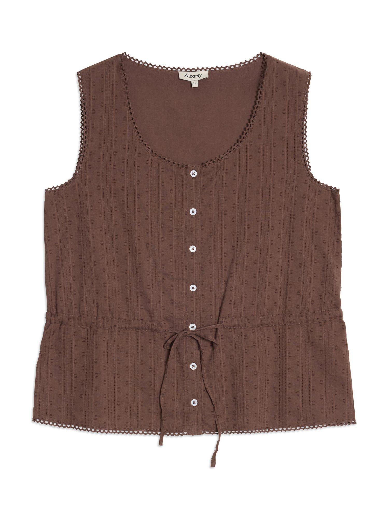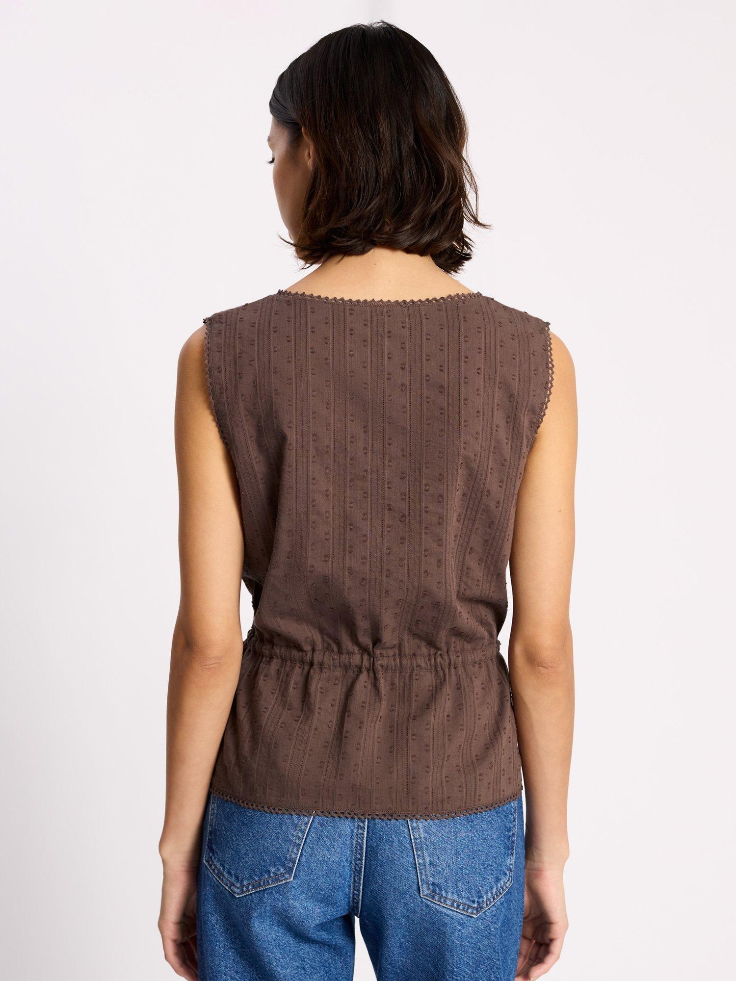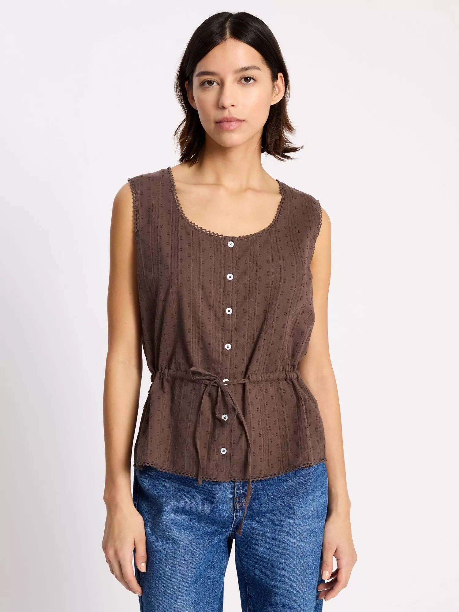 A textured dobby cotton top featuring a scoop neckline and button front detailing with a drawstring waist. Crafted from cotton, this sleeveless top is perfect styled with jeans or shorts.