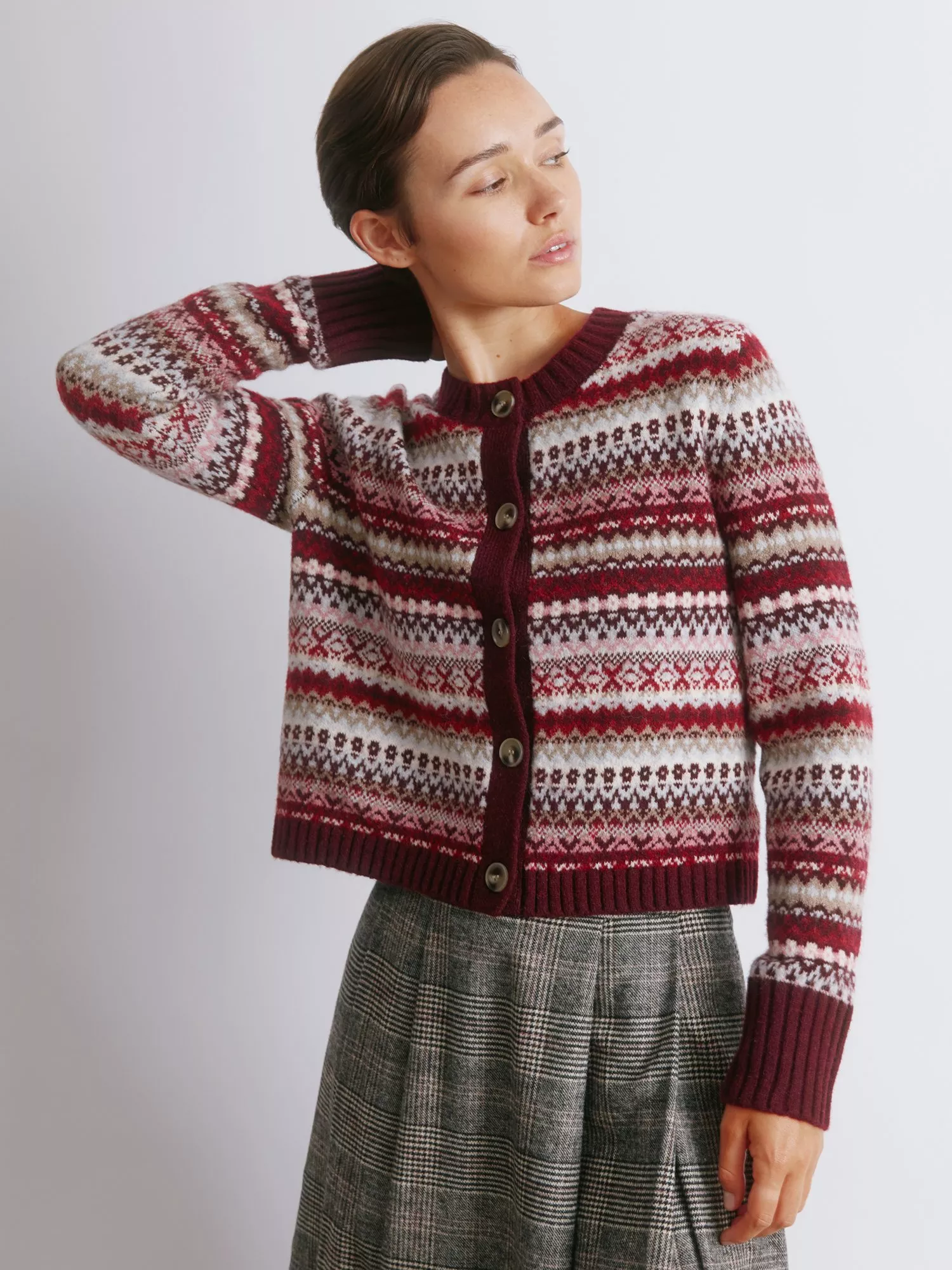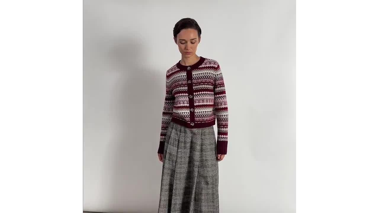 This popular cropped cardigan features a rich burgundy Fair Isle design, crafted from a soft wool blend for comfort and warmth.