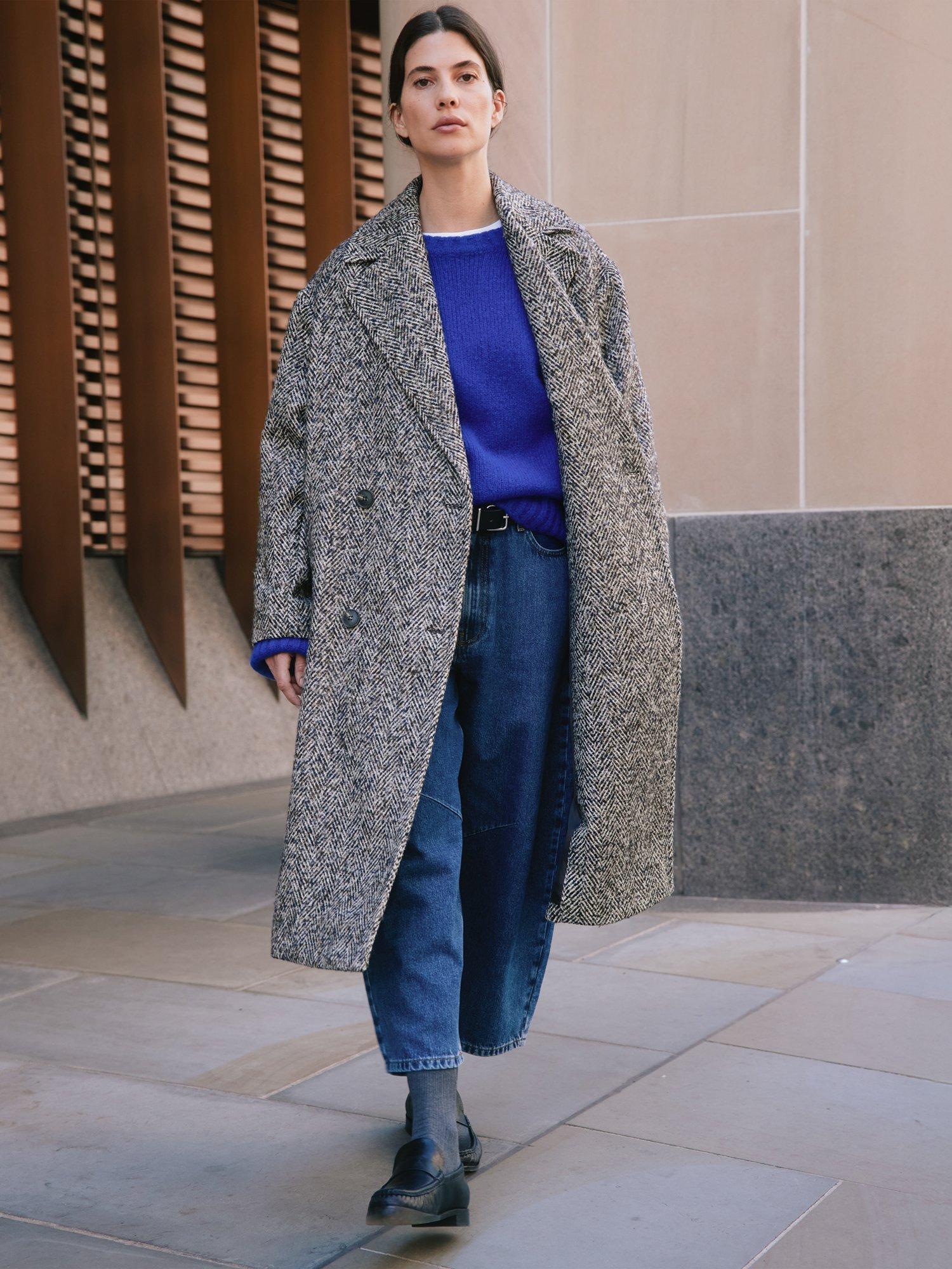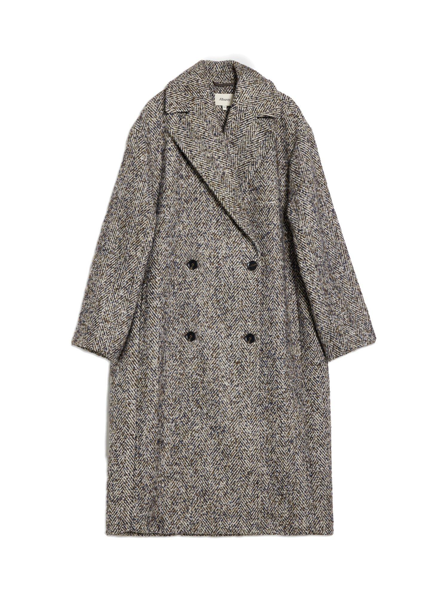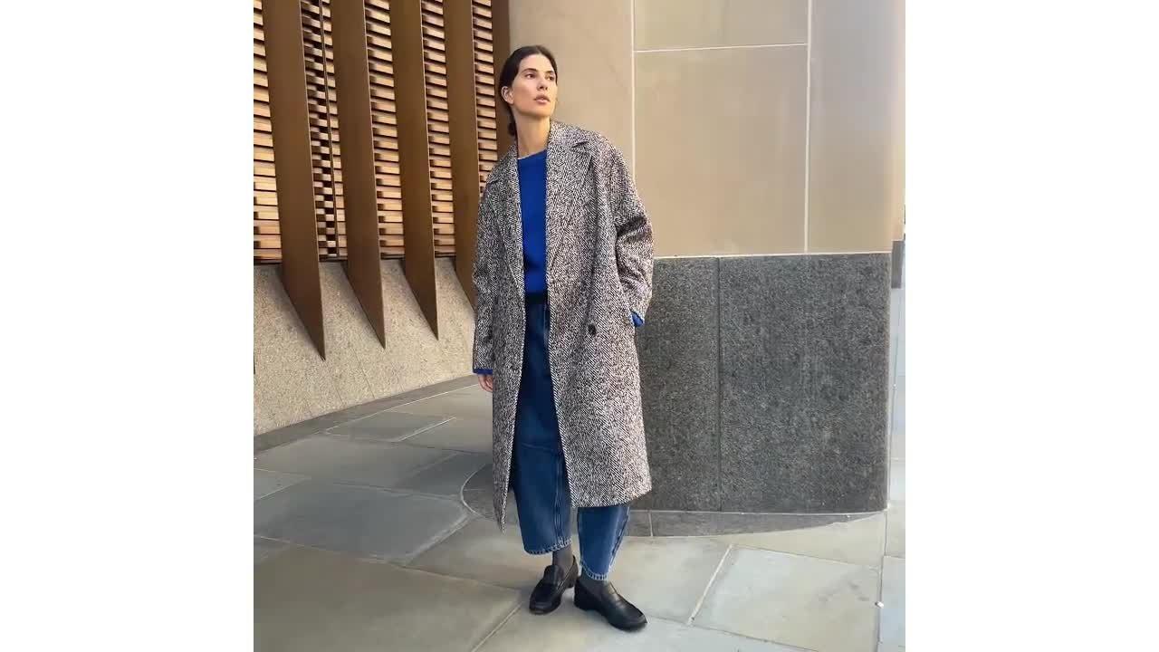 This double-breasted coat is crafted from a distinct boucle herringbone. Designed with an oversized silhouette, it offers a comfortable, relaxed fit that layers effortlessly over knitwear. Practical details include two side pockets and stylish horn-effect buttons, making it a versatile and timeless addition to your wardrobe.