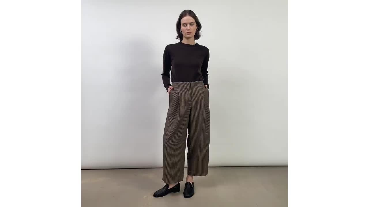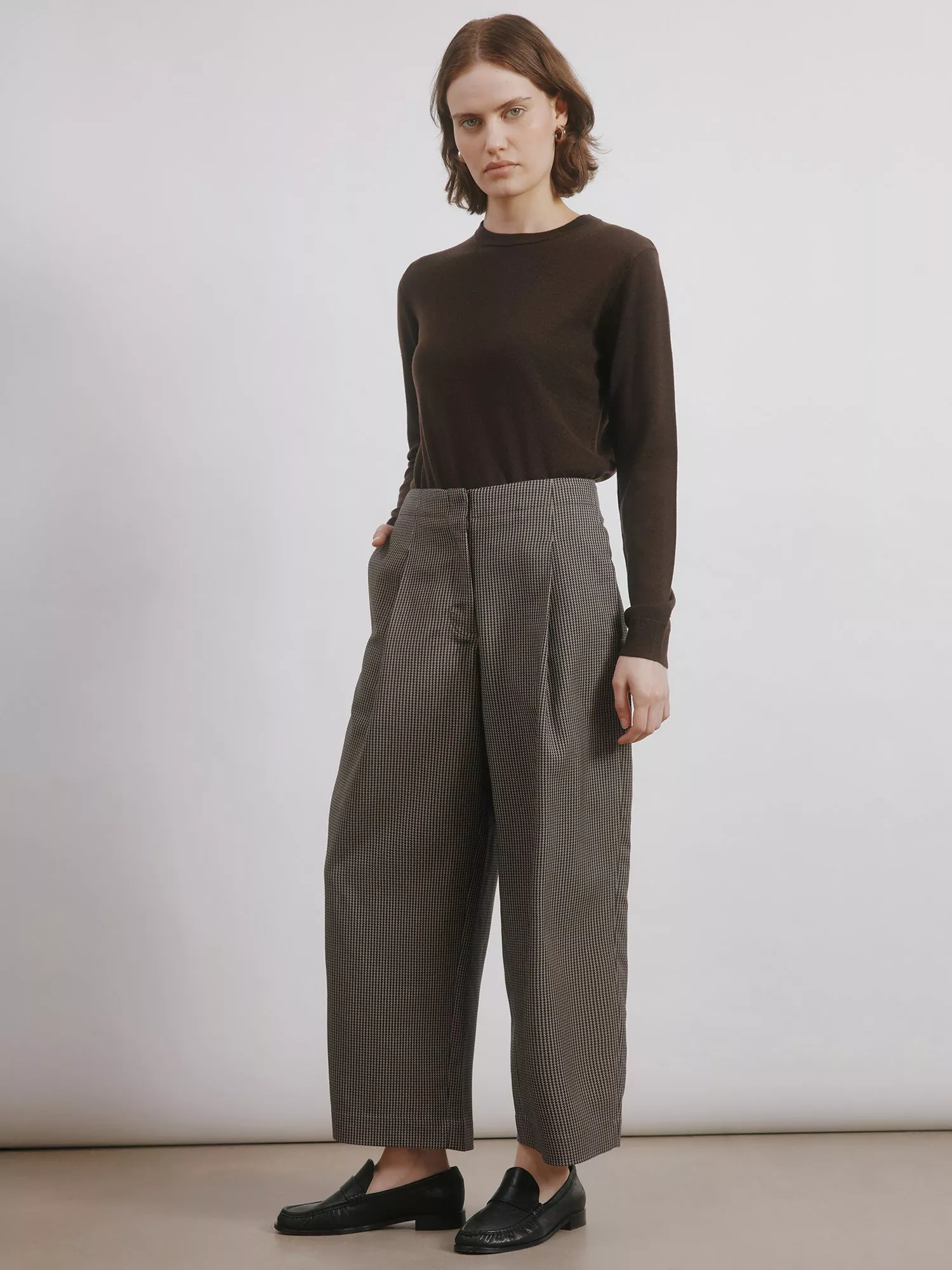 These houndstooth tailored trousers are cut in a sculptural barrel-leg silhouette. Offered in timeless check, they are cut with pleats that define the curved legs, they're finished with slanted side pockets, with a zip and hook and bar closure.