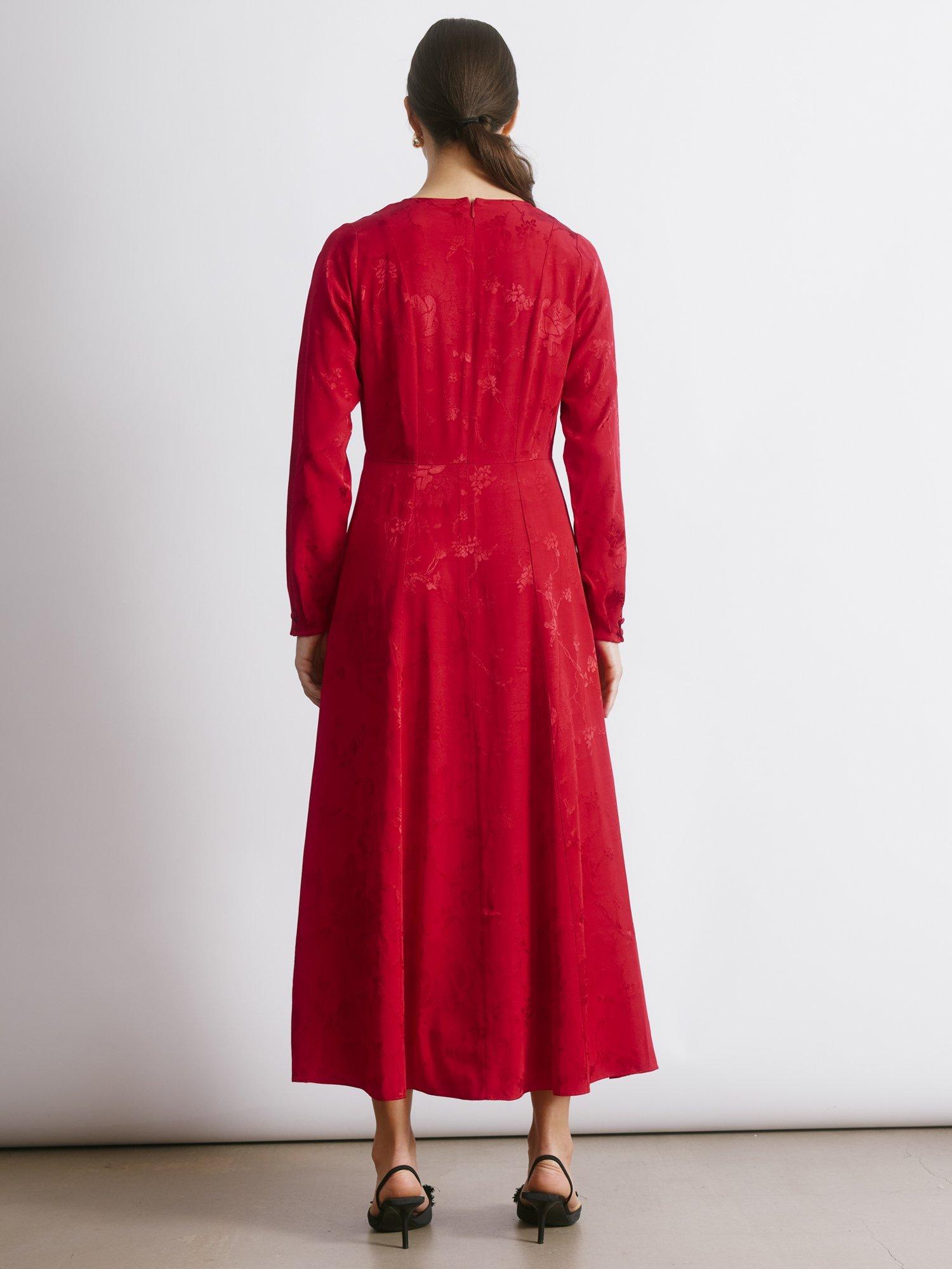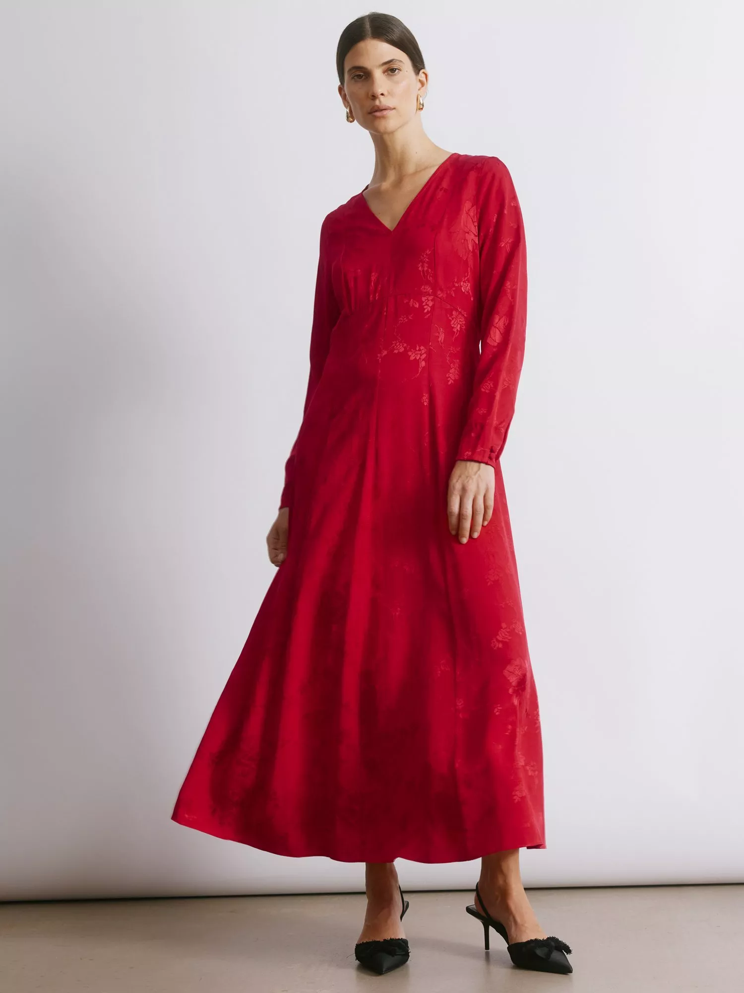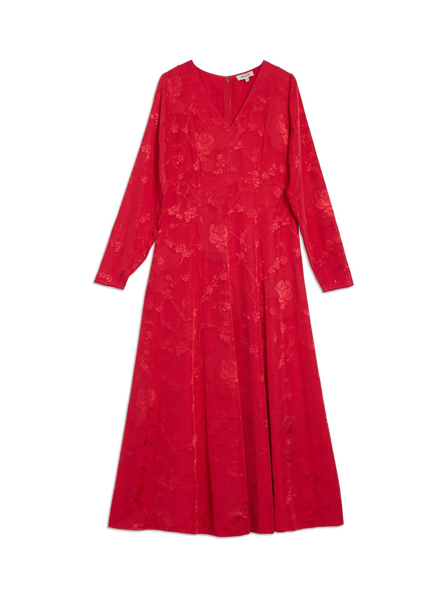 This elegant midi dress is crafted from a floral jacquard fabric. A flattering design featuring a V neck, an empire line and a soft A-line skirt. Delicate button details on the cuffs add a refined finishing touch.