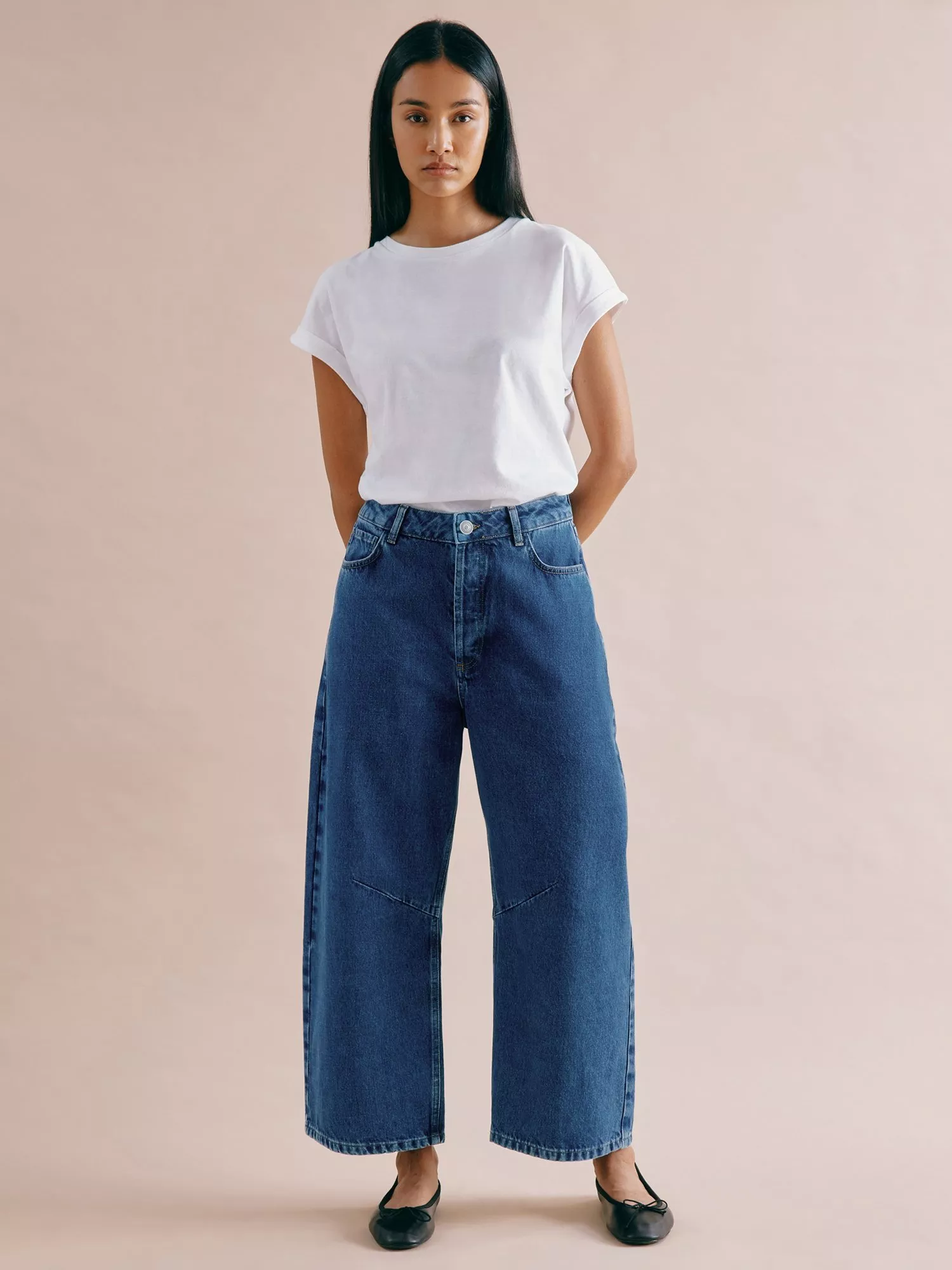 These jeans are designed in a relaxed barrel shape for a modern look. Featuring a flattering mid-rise waist with a button-and-zip fastening and authentic five-pocket styling.
