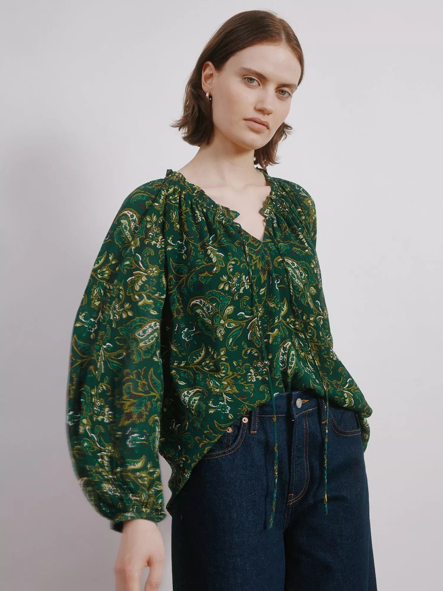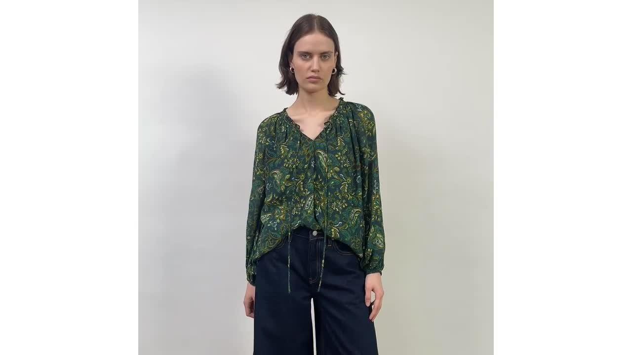 This voluminous top offers a wonderfully airy silhouette that flatters your figure. The gathered round neckline includes a fixed tie that eliminates any fussing with adjustments. The lovely blouson sleeves provide just the right amount of coverage while maintaining a light, comfortable feel that moves gracefully with you throughout your day.