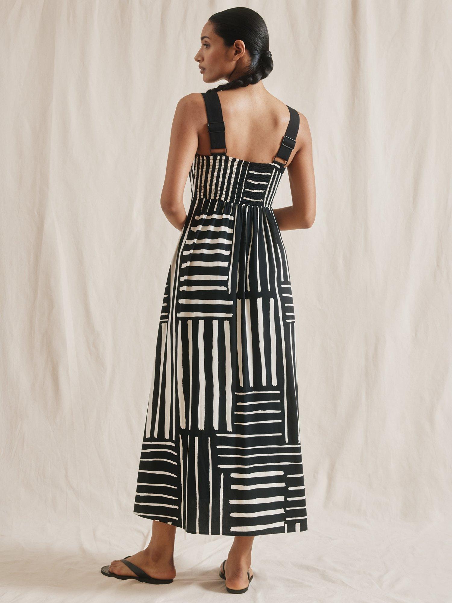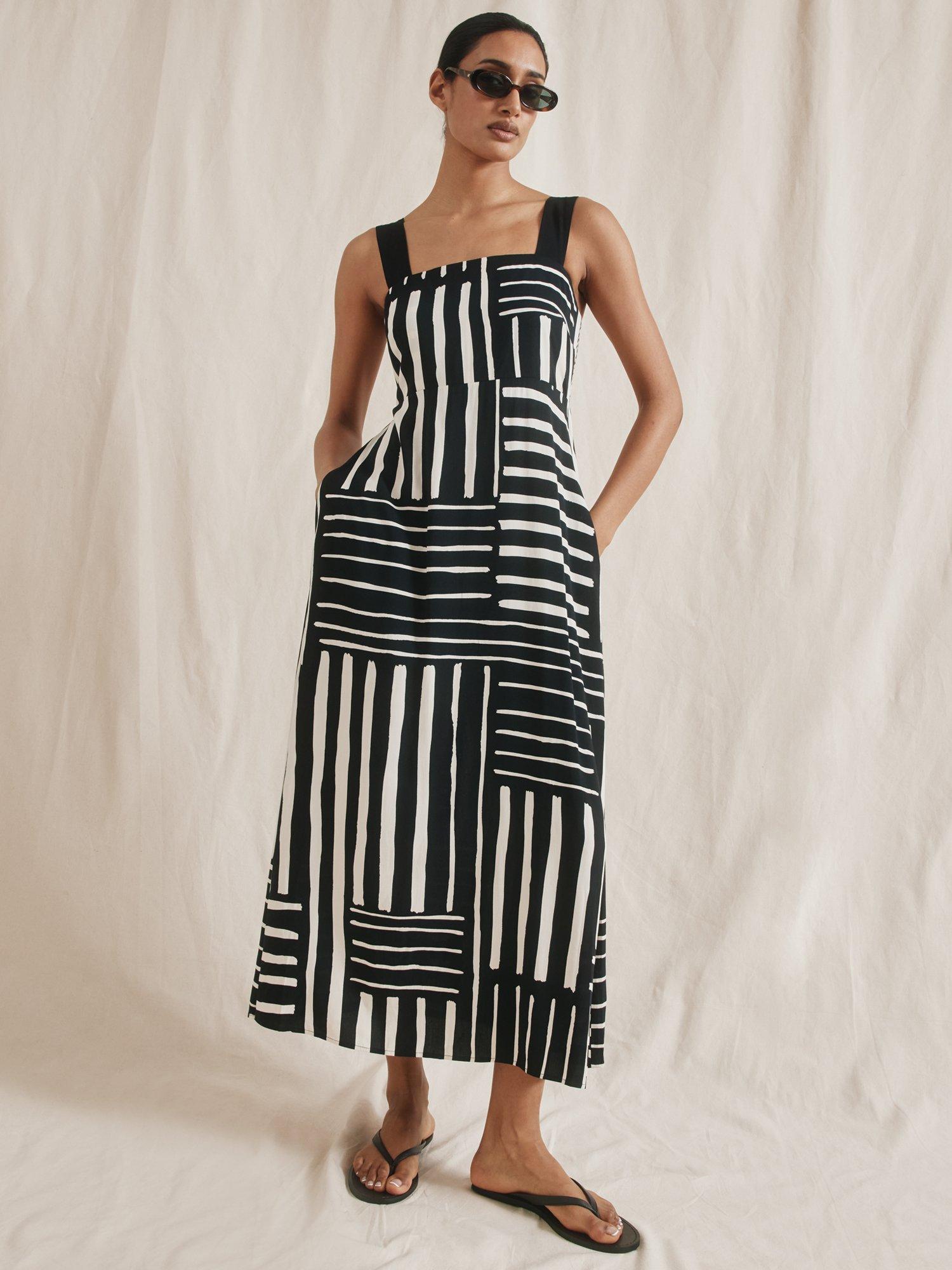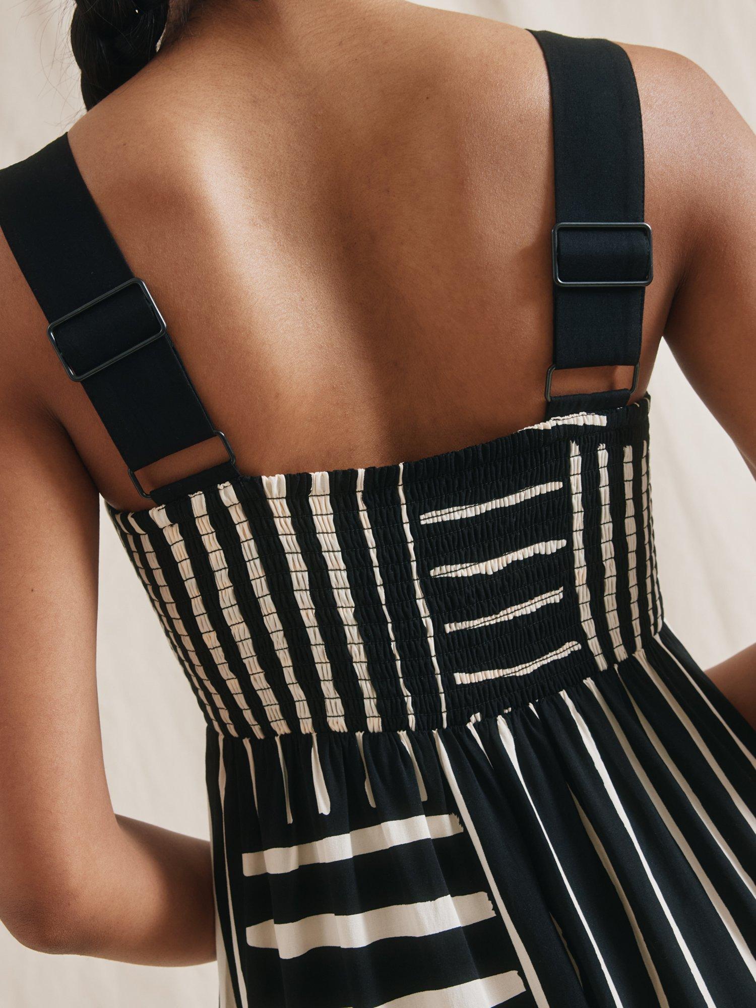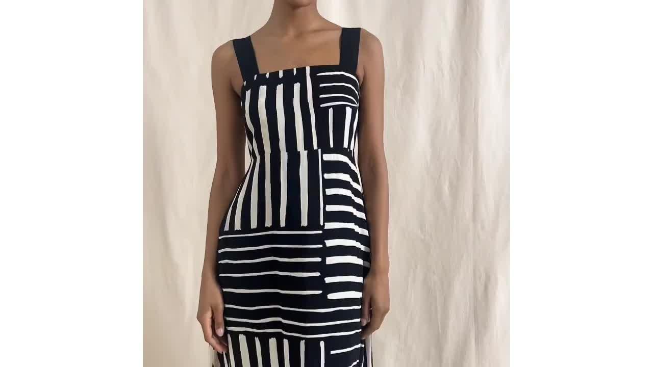 This beautiful sundress features a patchwork stripe design, a square neckline, and wide straps that can be adjusted for the perfect fit. The shirred back ensures a comfortable and flattering look, while the soft A-line shape creates a simple yet elegant silhouette. Plus, it even has side pockets for added convenience.