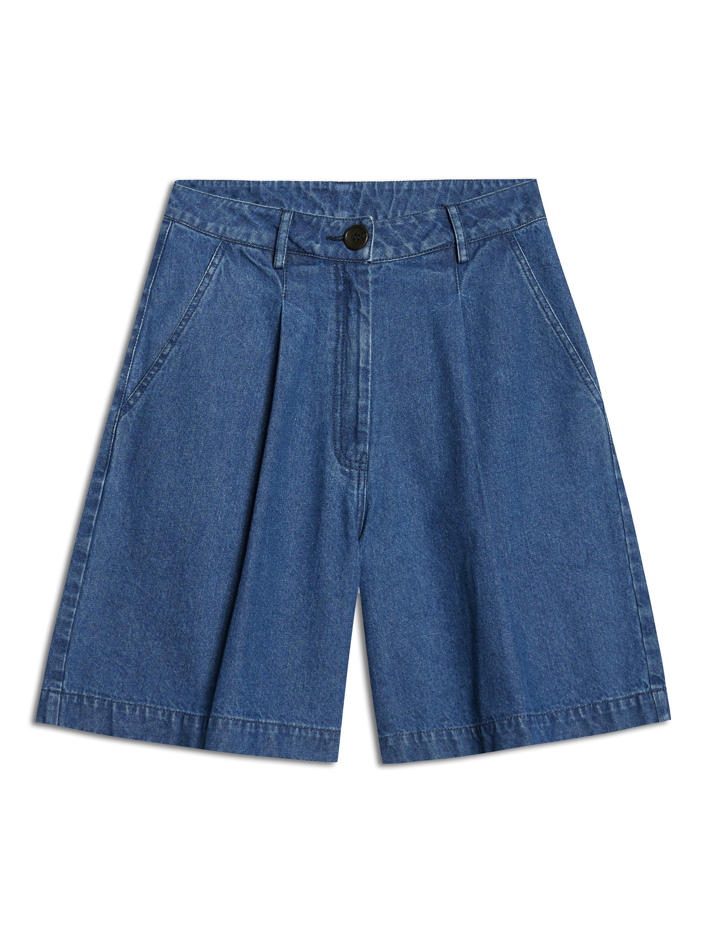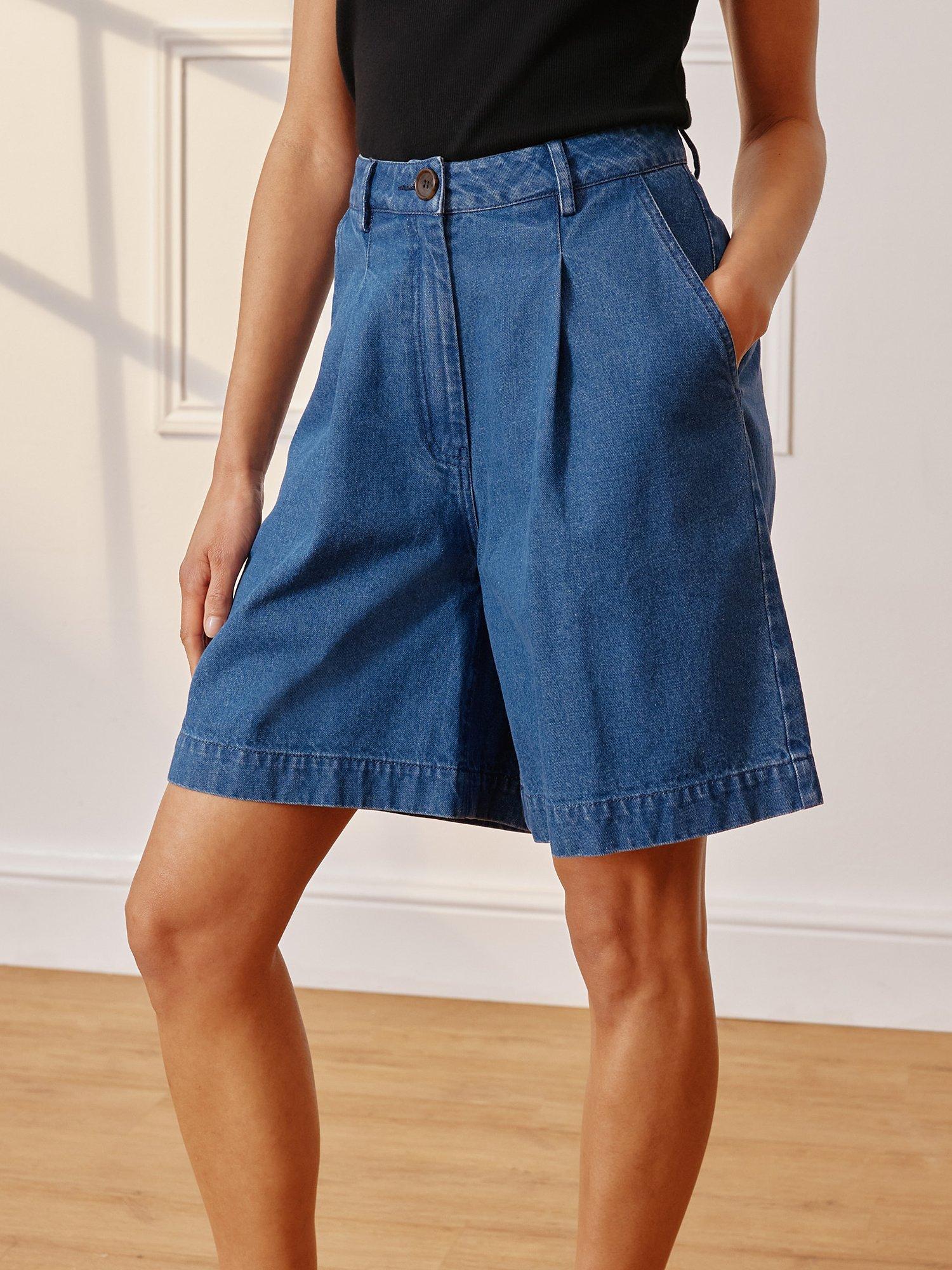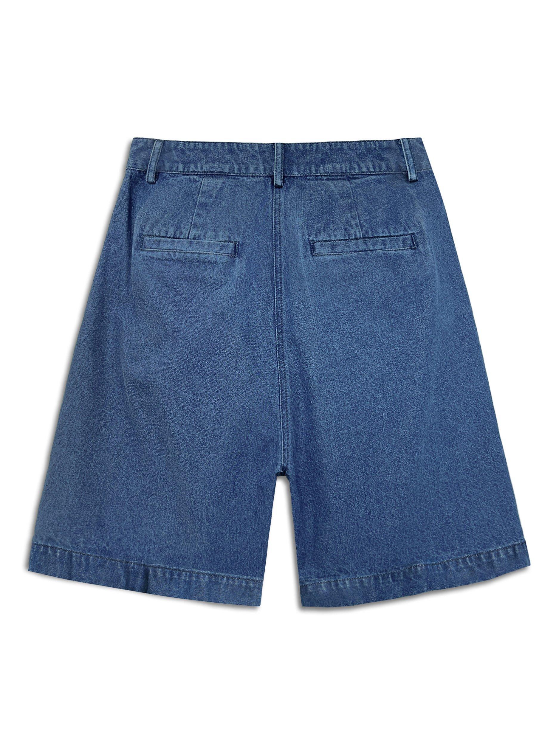 Designed in a longer leg length, these Bermuda denim shorts are a summer wardrobe must-have. With flattering pleats and functional pockets, they are a perfect blend of style and functionality.