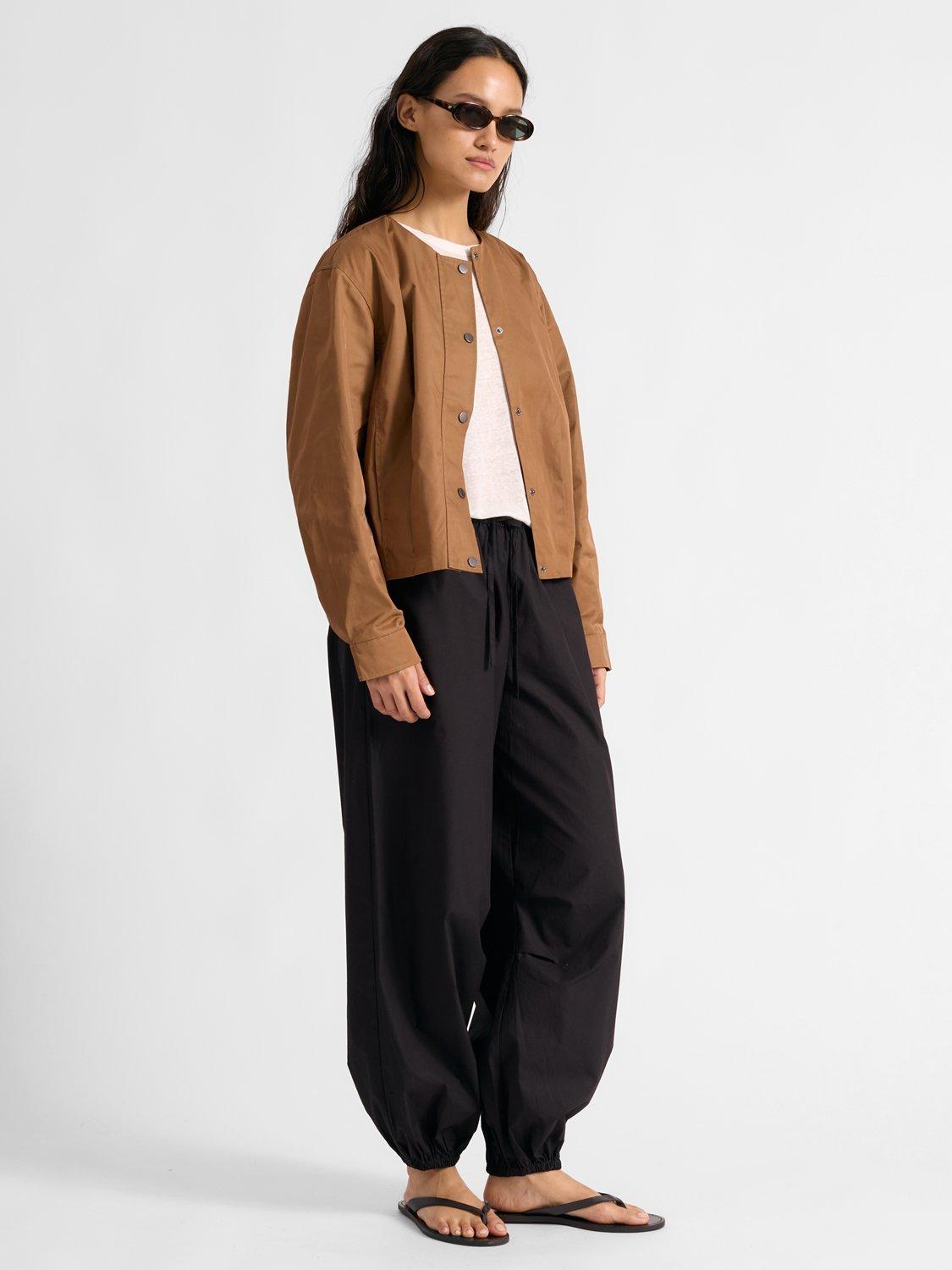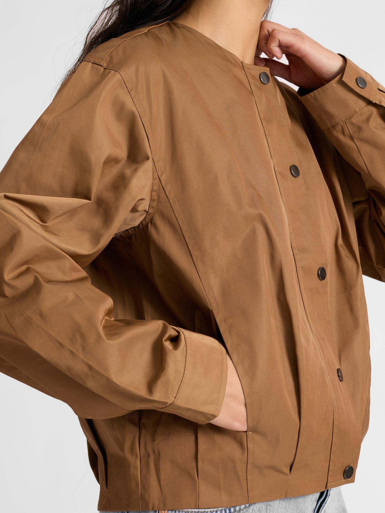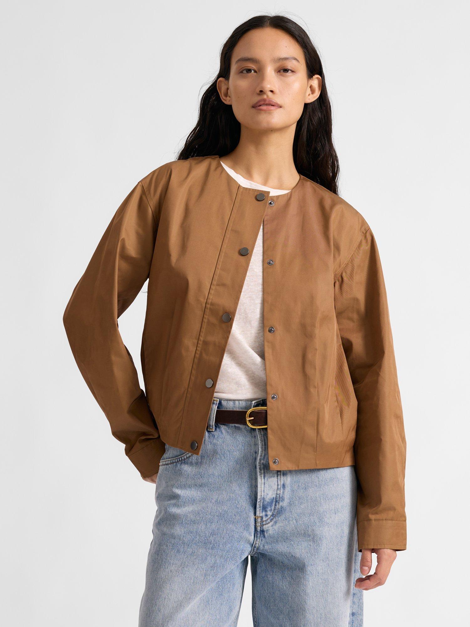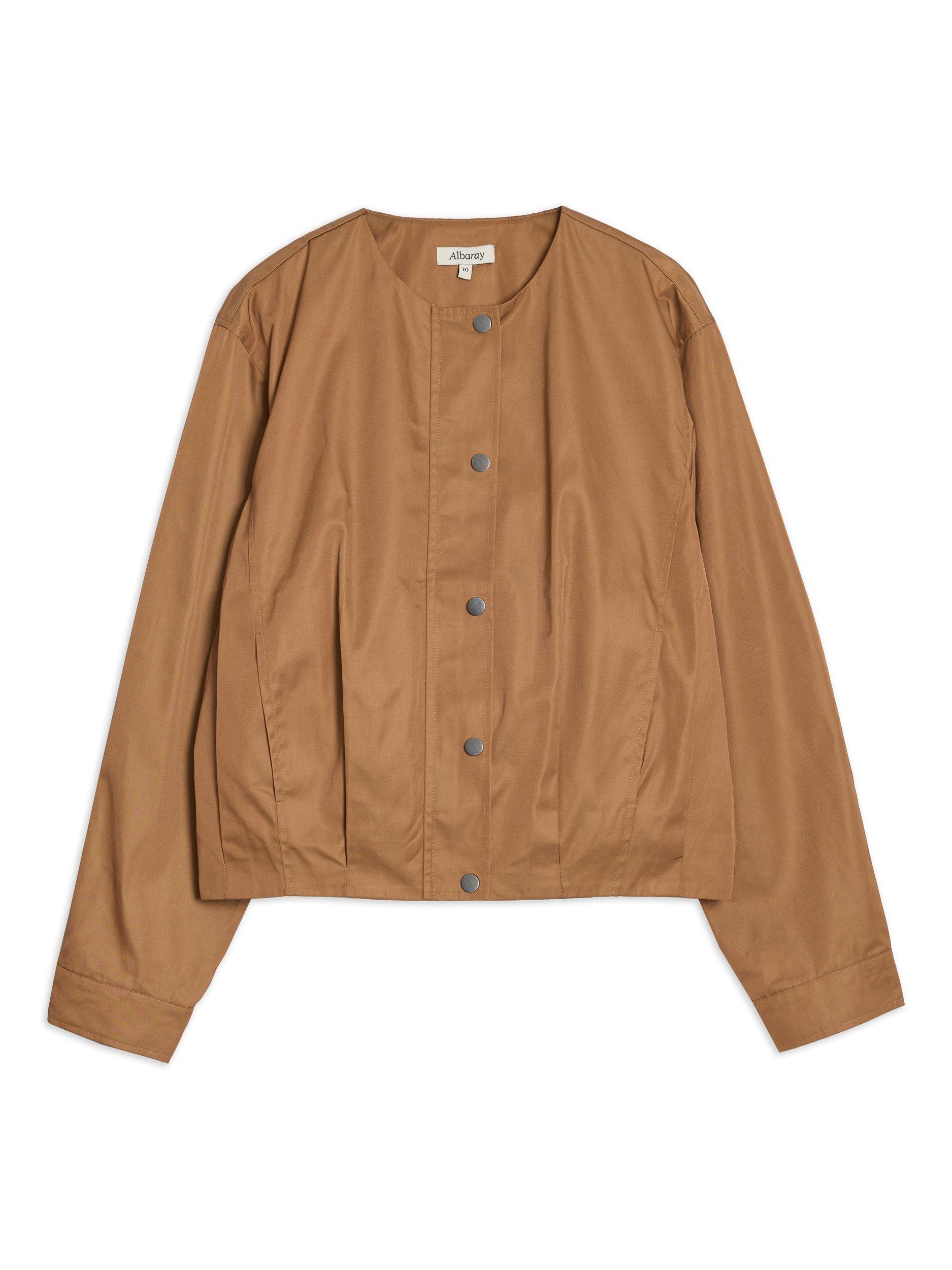 This timeless piece includes a pleated hem design to create a clean blouson effect for a new modern take on the lightweight jacket. It has convenient side pockets, a clean collarless neckline with a popper front fastening. This jacket is practical and stylish.