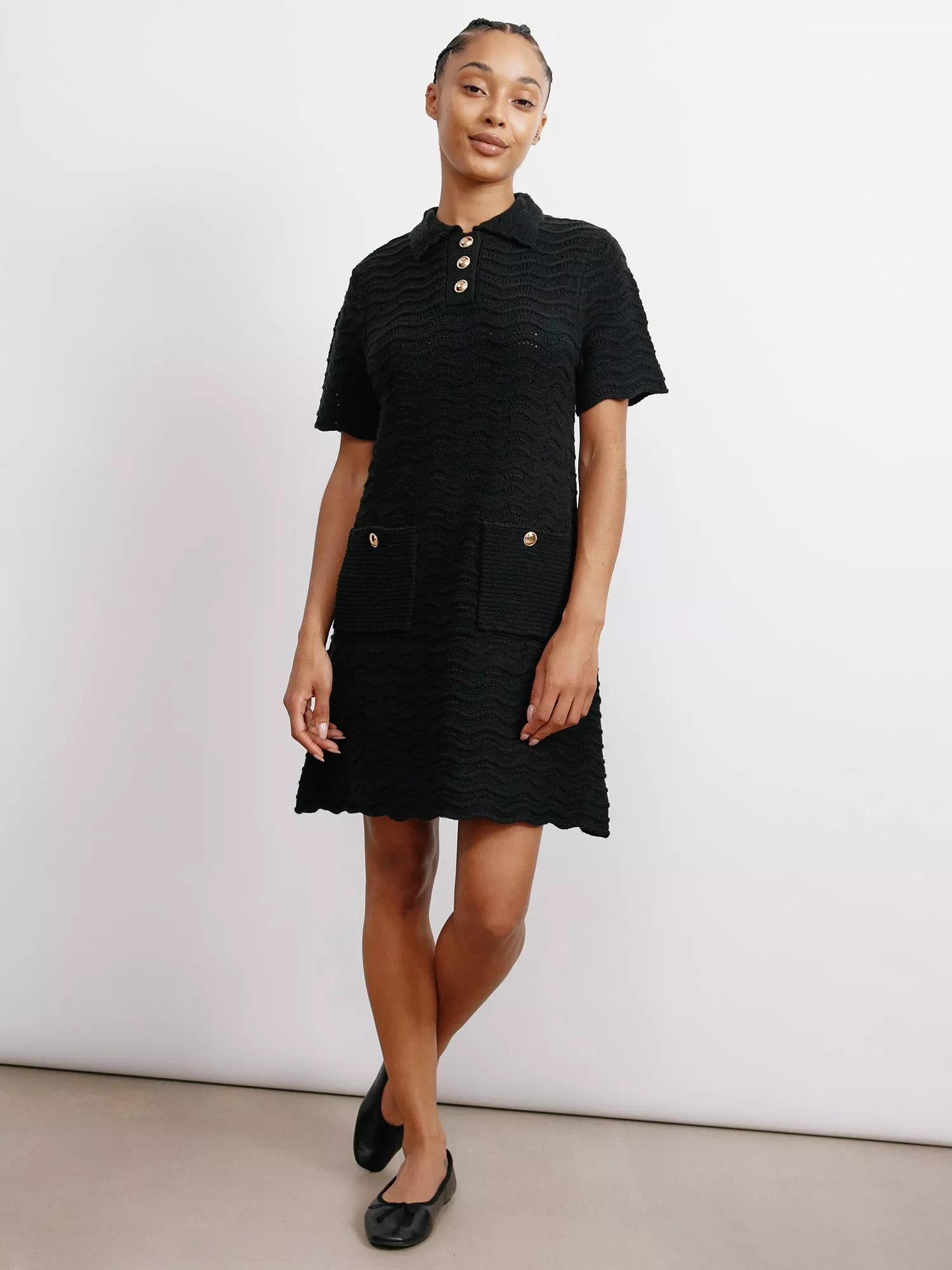 A short A line dress knitted in the softest pointelle jacquard with scallop collar, hems and cuffs. Featuring two patch pockets and adorned with gold buttons.