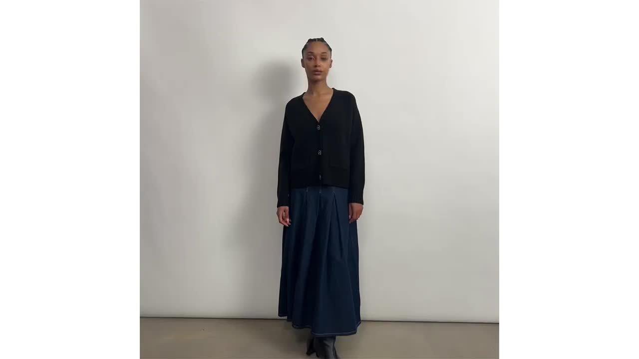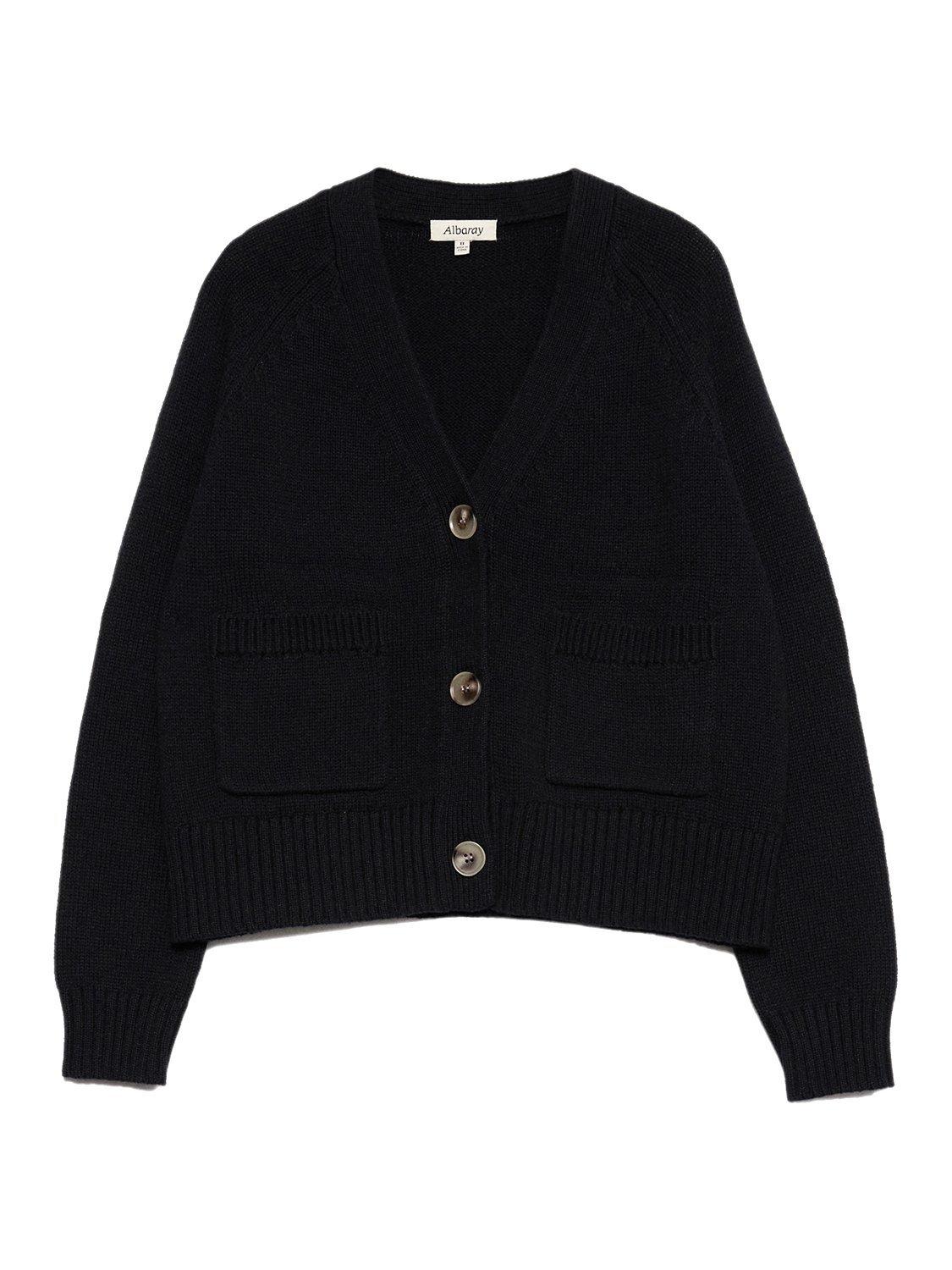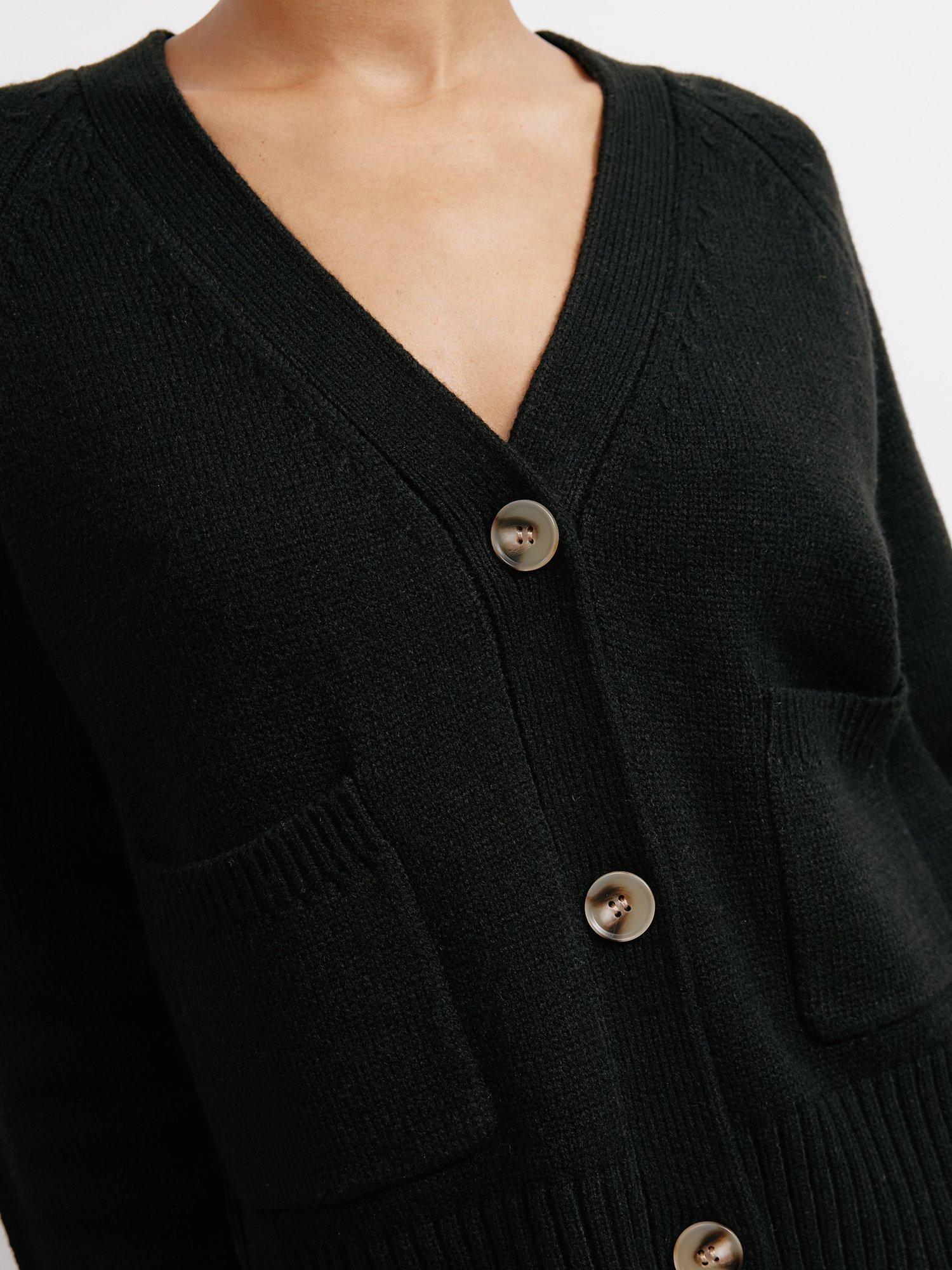 This cardigan is designed with a versatile V-neck for standalone or layered wear. Its patch pockets feature delicate pointelle detailing, while horn-effect buttons add a sophisticated touch. Whether worn alone or as a stylish layer, this cardigan effortlessly blends fashion-forward design with practical elegance.